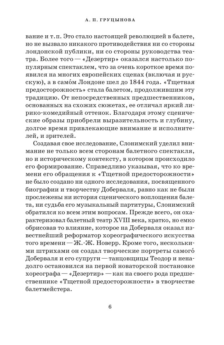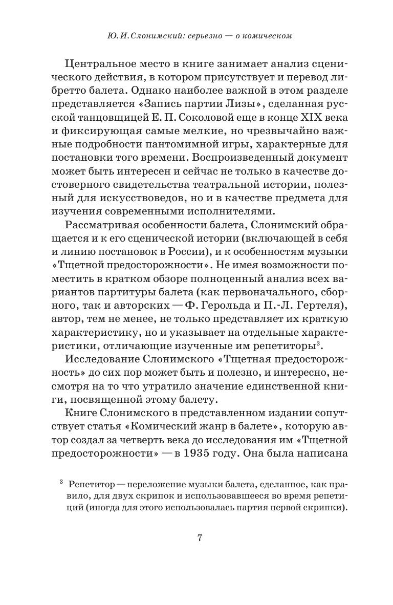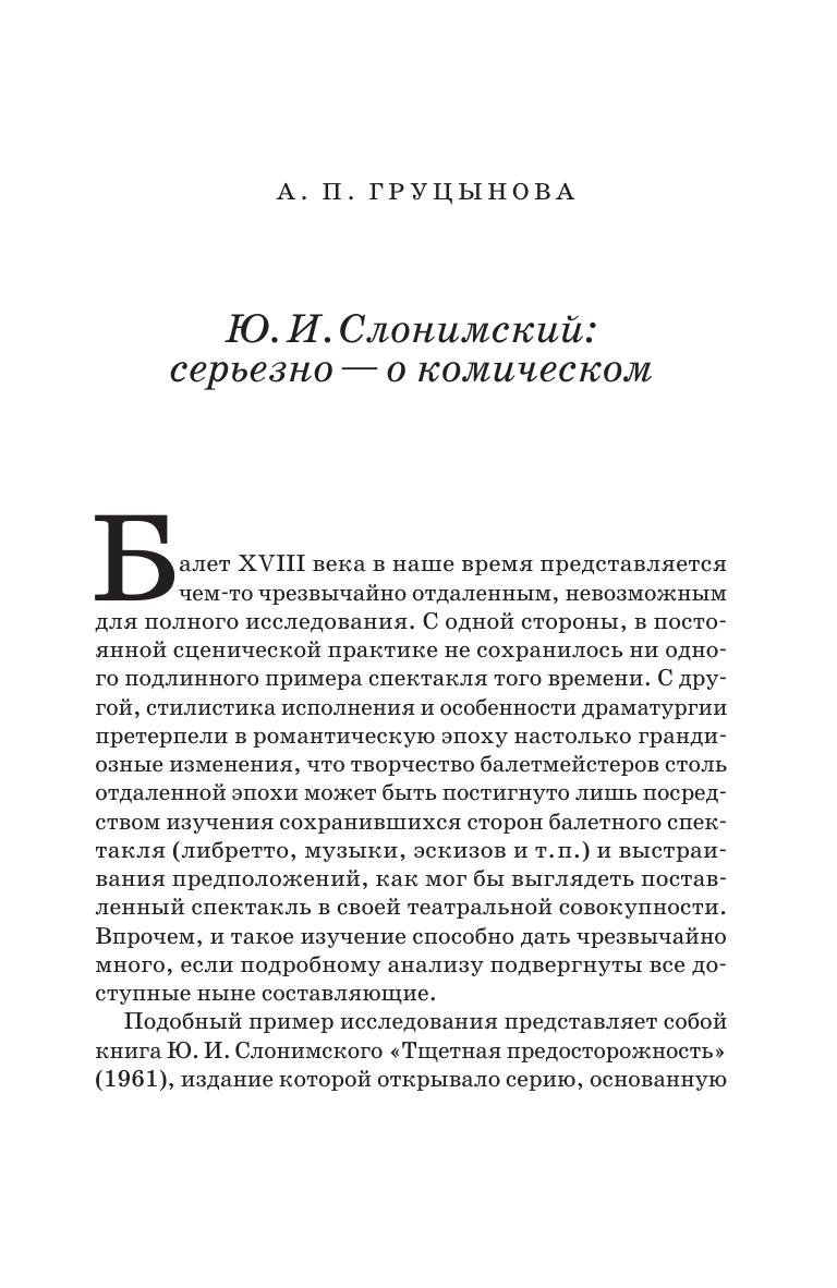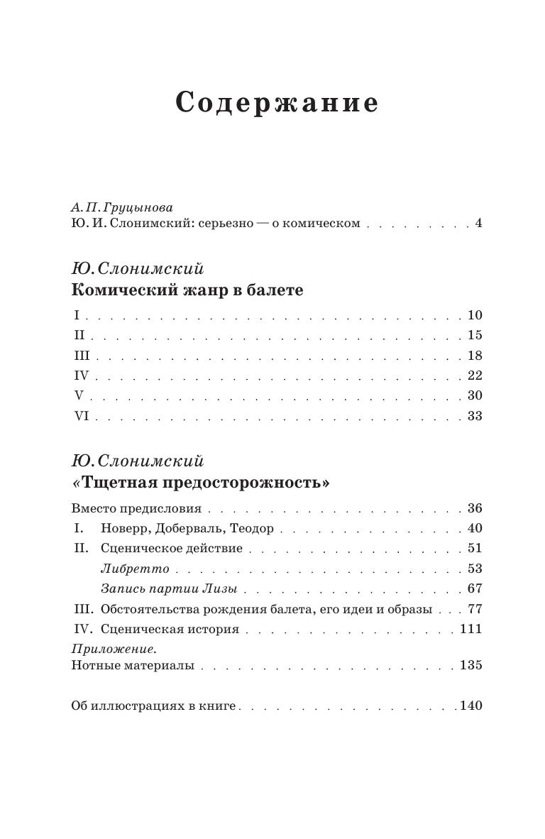 В сборник вошли две работы Слонимского, кардинально отличающиеся друг от друга по стилю. Статья 1930-х годов «Комический жанр в балете» несёт на себе отпечаток традиционной для того времени «политически верной» оценки произведения искусства. Книга 1960-х годов "Тщетная предосторожность" была написана не только в иное время, но и опытным автором, уже создавшим большое количество иных произведений. В исследовании, посвящённом всестороннему анализу «Тщетной предосторожности», автор уделил внимание всем сторонам балетного спектакля, истории сценического воплощения, судьбе музыкальный партитуры, историческому контексту, в котором происходило формирование балета.