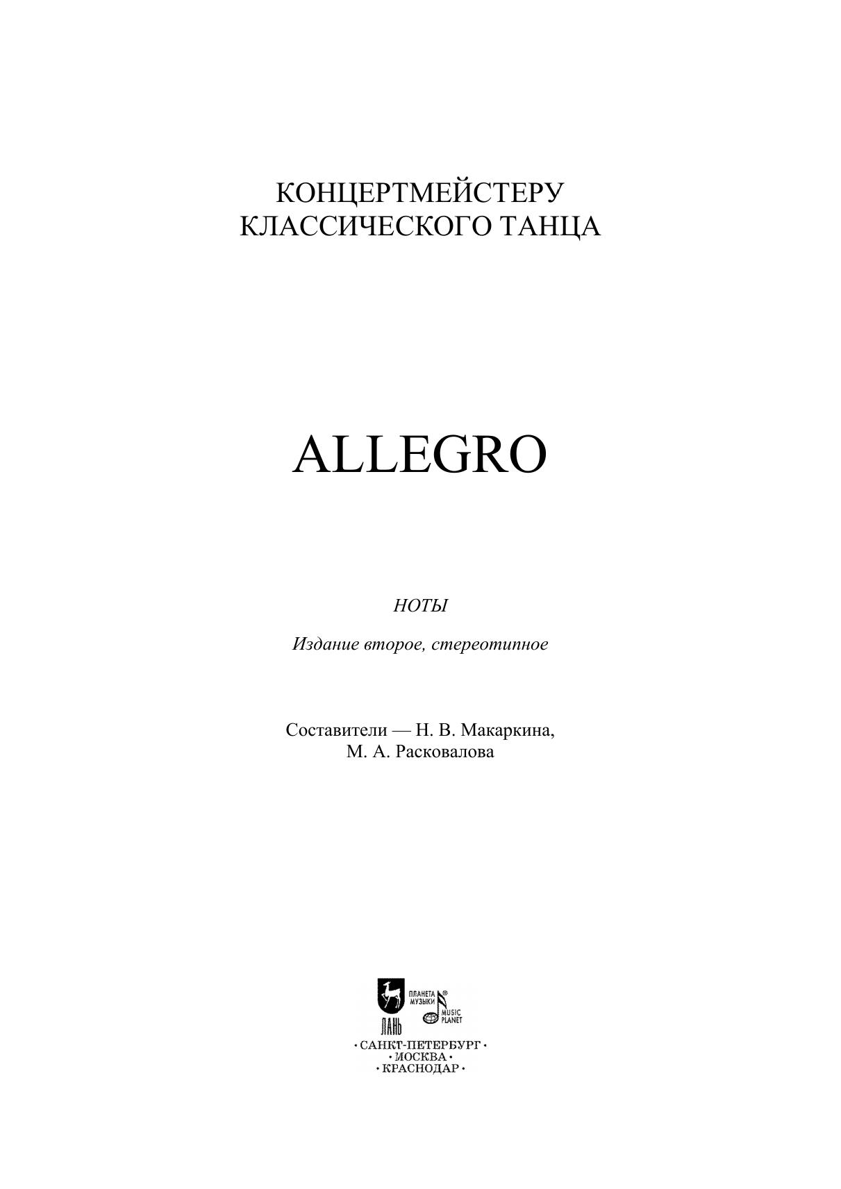 Данный сборник продолжает серию «Концертмейстеру классического танца». В сборнике представлены примеры музыкального оформления урока из раздела Allegro. Издание предназначено для концертмейстеров училищ, школ искусств, любительских коллективов.