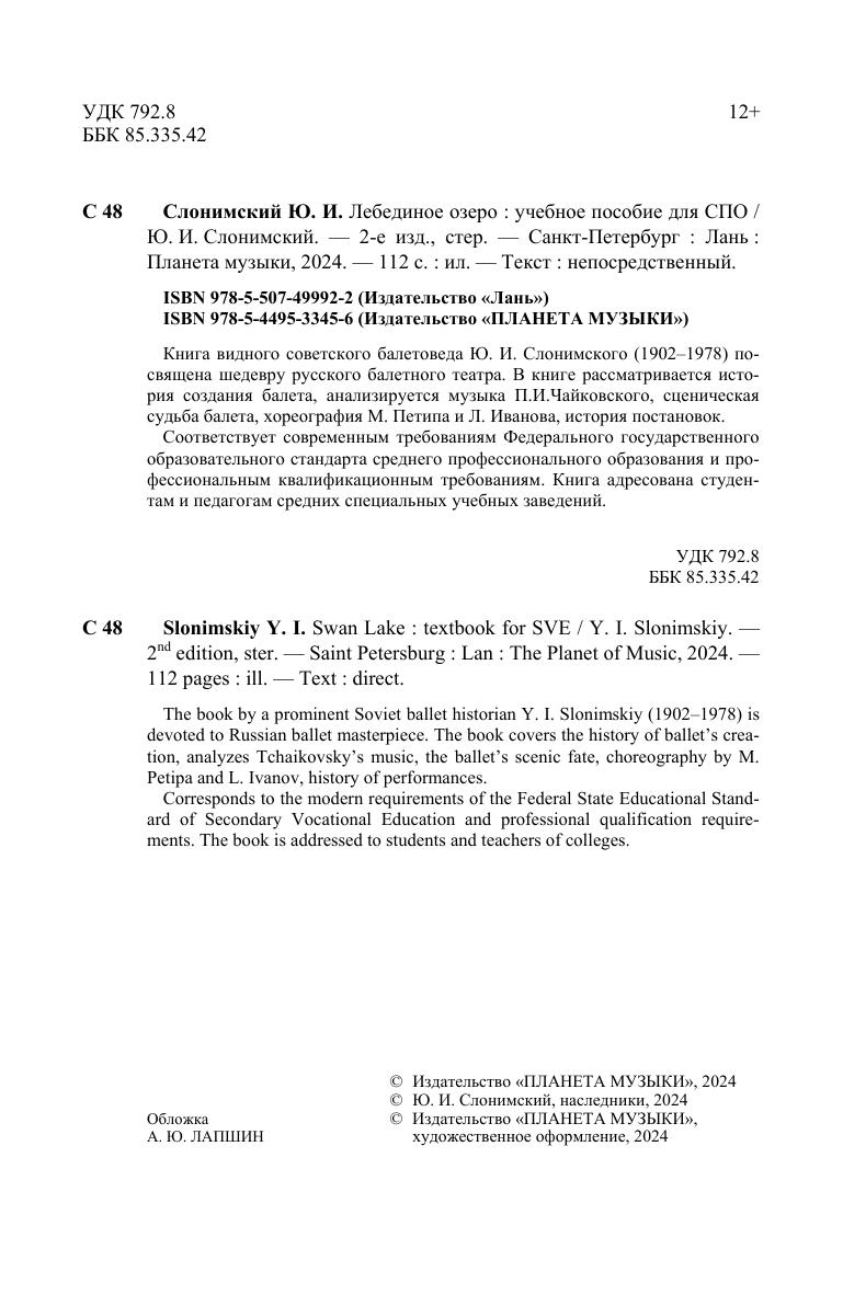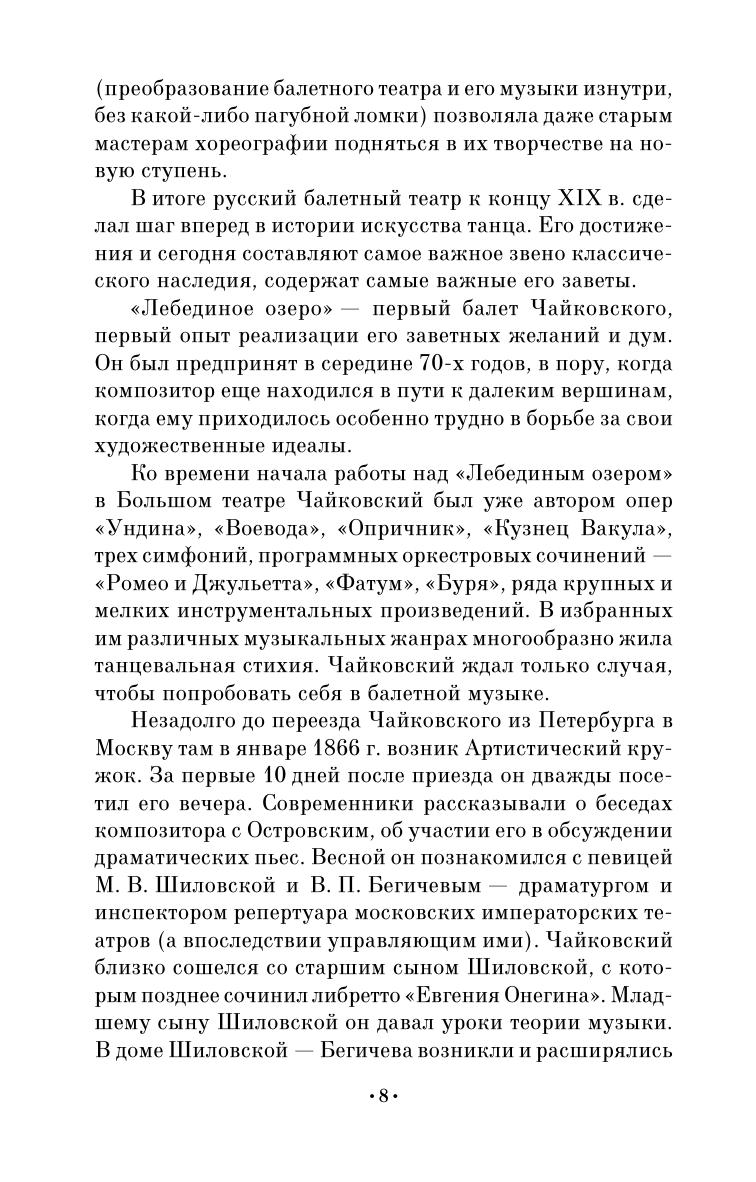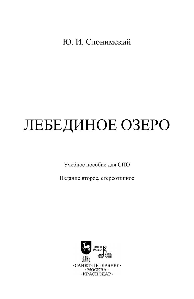 Книга видного советского балетоведа Ю.И.Слонимского (1902-1978) посвящена шедевру русского балетного театра. В книге рассматривается история создания балета, анализируется музыка П.И.Чайковского, сценическая судьба балета, хореография М.Петипа и Л.Иванова, история постановок. Книга адресована студентам и педагогам средних специальных учебных заведений. The book by a prominent Soviet ballet historian Y.I.Slonimskiy (1902-1978) is devoted to Russian ballet masterpiece. The book covers the history of ballet’s creation, analyzes Tchaikovsky's music, the ballet’s scenic fate, choreography by M. Petipa and L. Ivanov, history of performances. The book is addressed to students and teachers of colleges.