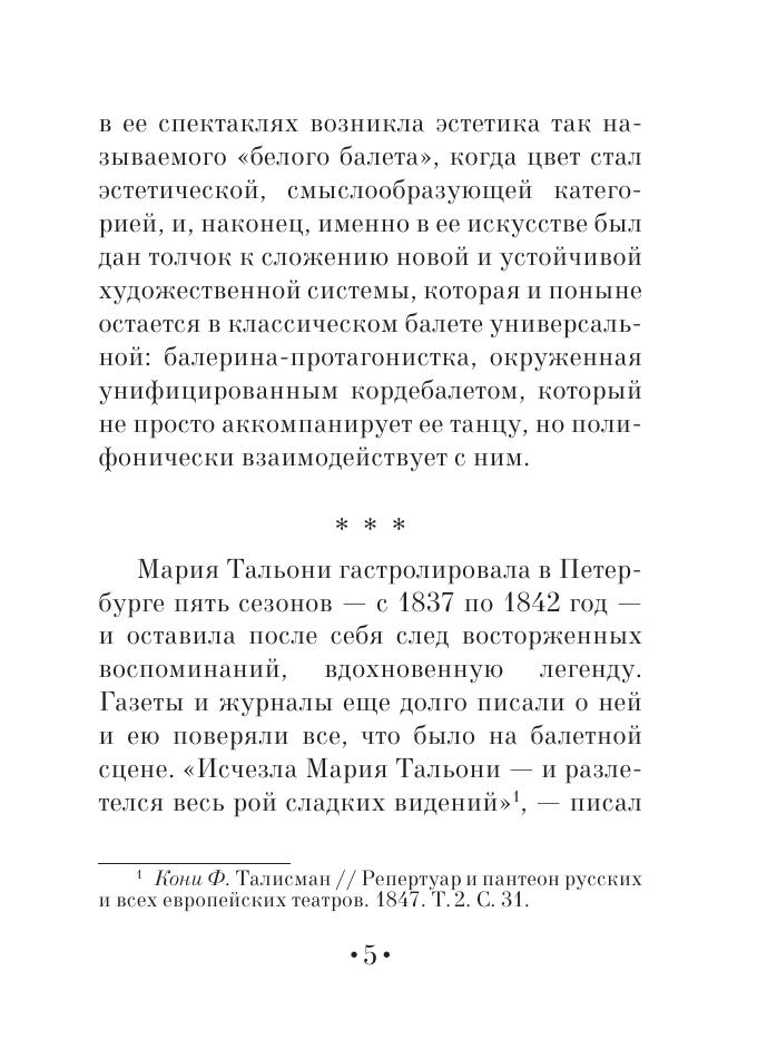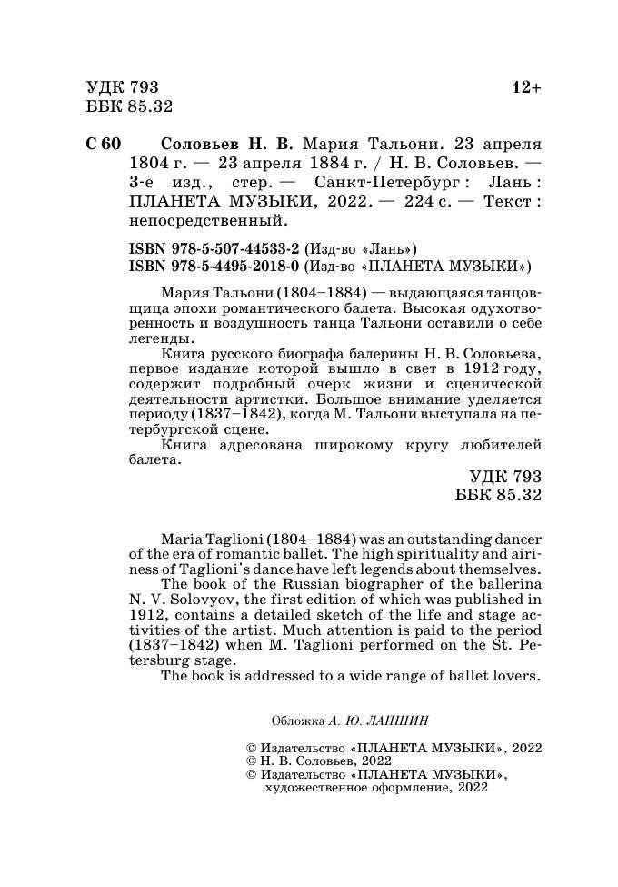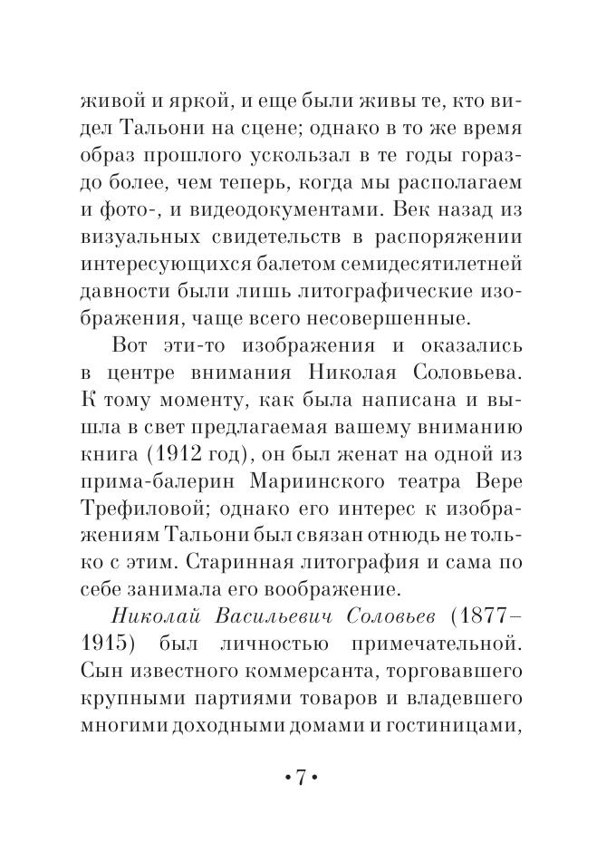 Мария Тальони (1804–1884) — выдающаяся танцовщица эпохи романтического балета. Высокая одухотворенность и воздушность танца Тальони оставили о себе легенды. Книга русского биографа балерины Н. В. Соловьева, первое издание которой вышло в свет в 1912 году, содержит подробный очерк жизни и сценической деятельности артистки. Большое внимание уделяется периоду (1837–1842), когда М. Тальони выступала на петербургской сцене. Книга адресована широкому кругу любителей балета.