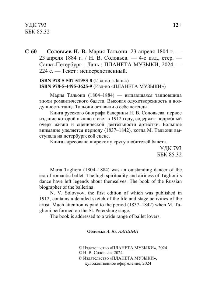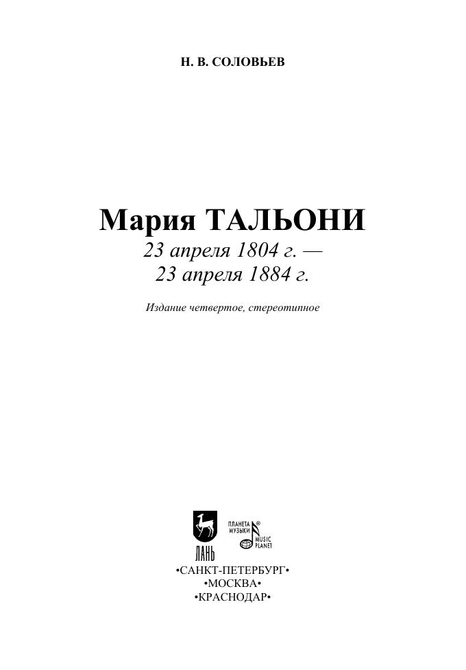 Мария Тальони (1804–1884) — выдающаяся танцовщица эпохи романтического балета. Высокая одухотворенность и воздушность танца Тальони оставили о себе легенды. Книга русского биографа балерины Н. В. Соловьева, первое издание которой вышло в свет в 1912 году, содержит подробный очерк жизни и сценической деятельности артистки. Большое внимание уделяется периоду (1837–1842), когда М. Тальони выступала на петербургской сцене. Книга адресована широкому кругу любителей балета.