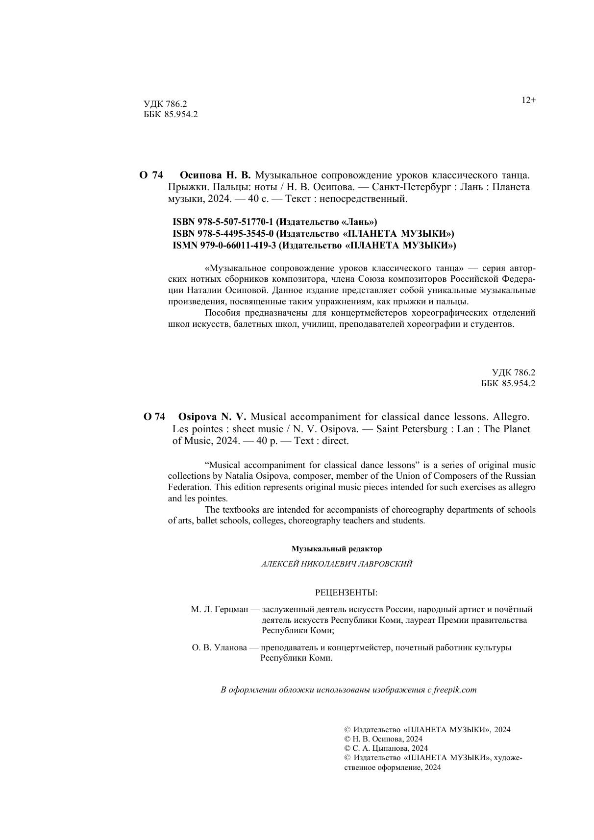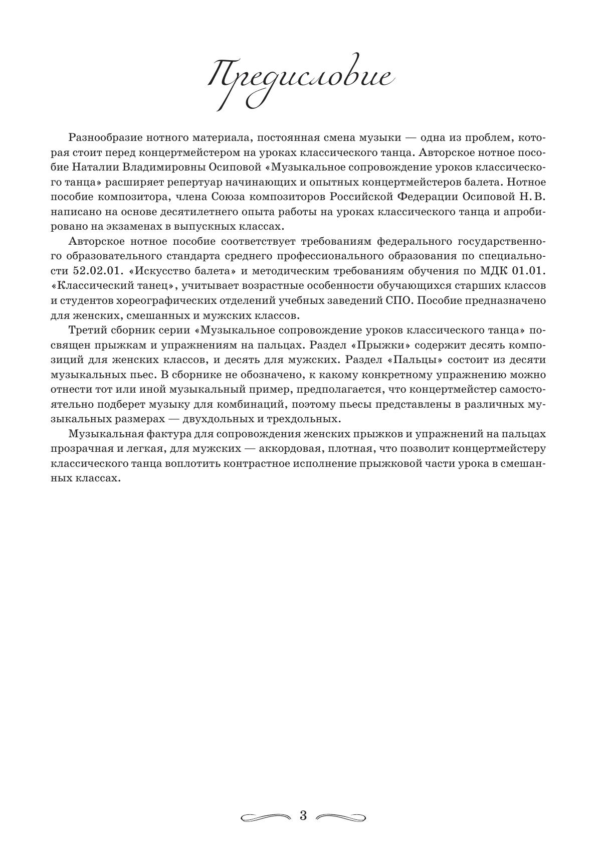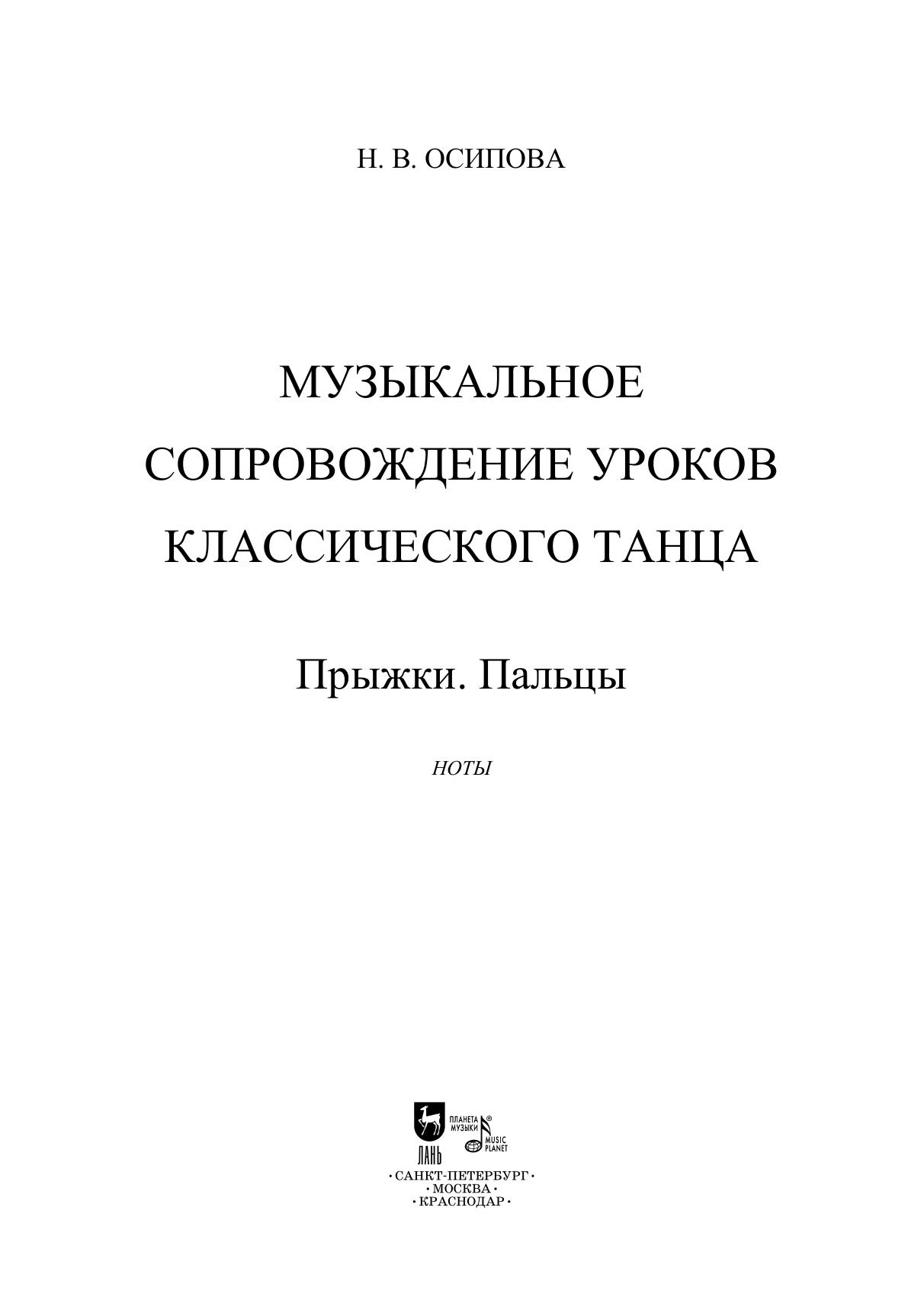 «Музыкальное сопровождение уроков классического танца» – серия авторских нотных сборников композитора, члена Союза композиторов Российской Федерации Наталии Осиповой. Данное издание представляет собой уникальные музыкальные произведения, посвященные таким упражнениям, как прыжки и пальцы. Пособия предназначены для концертмейстеров хореографических отделений школ искусств, балетных школ, училищ, преподавателей хореографии и студентов. “Musical accompaniment for classical dance lessons” is a series of original music collections by Natalia Osipova, composer, member of the Union of Composers of the Russian Federation. This edition represents original music pieces intended for such exercises as allegro and les pointes. The textbooks are intended for accompanists of choreography departments of schools of arts, ballet schools, colleges, choreography teachers and students.