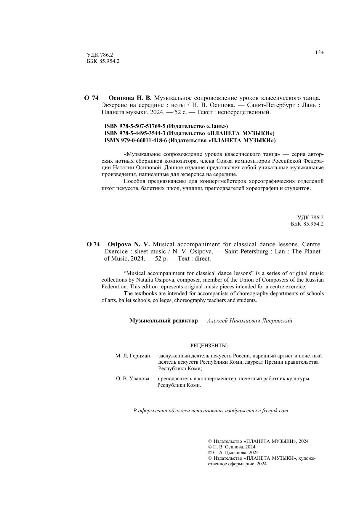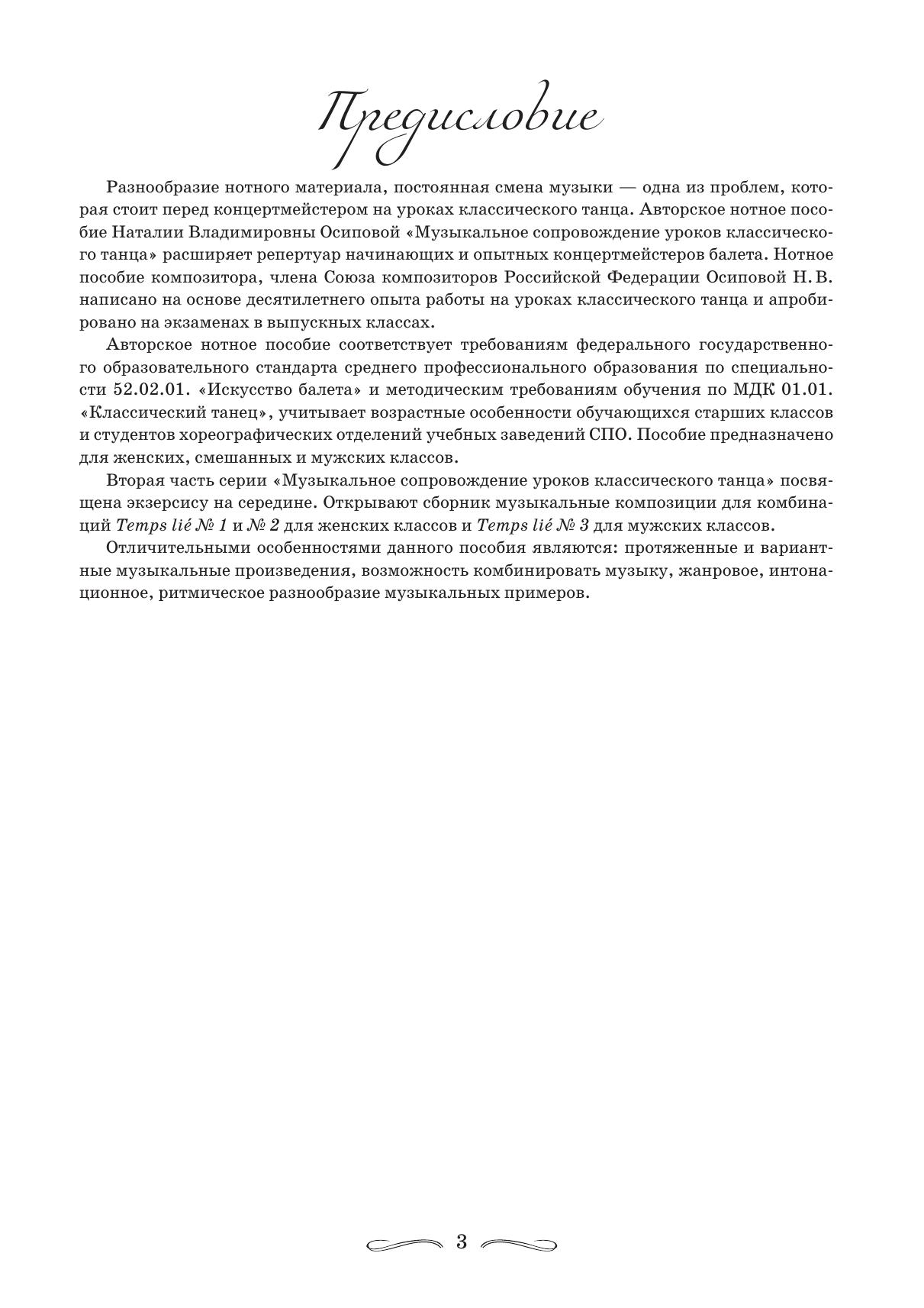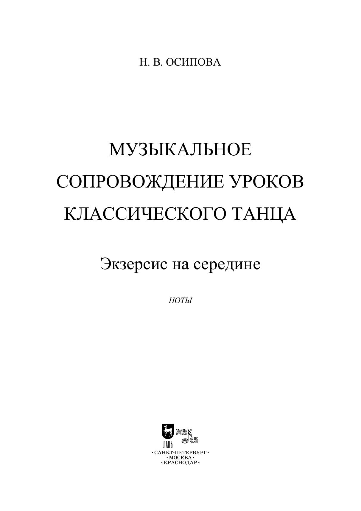 «Музыкальное сопровождение уроков классического танца» – серия авторских нотных сборников композитора, члена Союза композиторов Российской Федерации Наталии Осиповой. Данное издание представляет собой уникальные музыкальные произведения, написанные для экзерсиса на середине. Пособия предназначены для концертмейстеров хореографических отделений школ искусств, балетных школ, училищ, преподавателей хореографии и студентов. “Musical accompaniment for classical dance lessons” is a series of original music collections by Natalia Osipova, composer, member of the Union of Composers of the Russian Federation. This edition represents original music pieces intended for a centre exercice. The textbooks are intended for accompanists of choreography departments of schools of arts, ballet schools, colleges, choreography teachers and students.