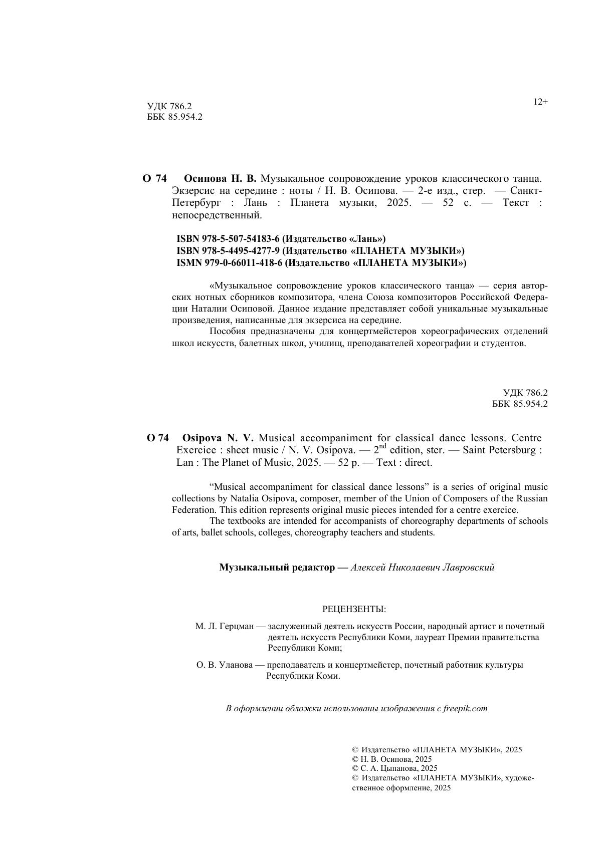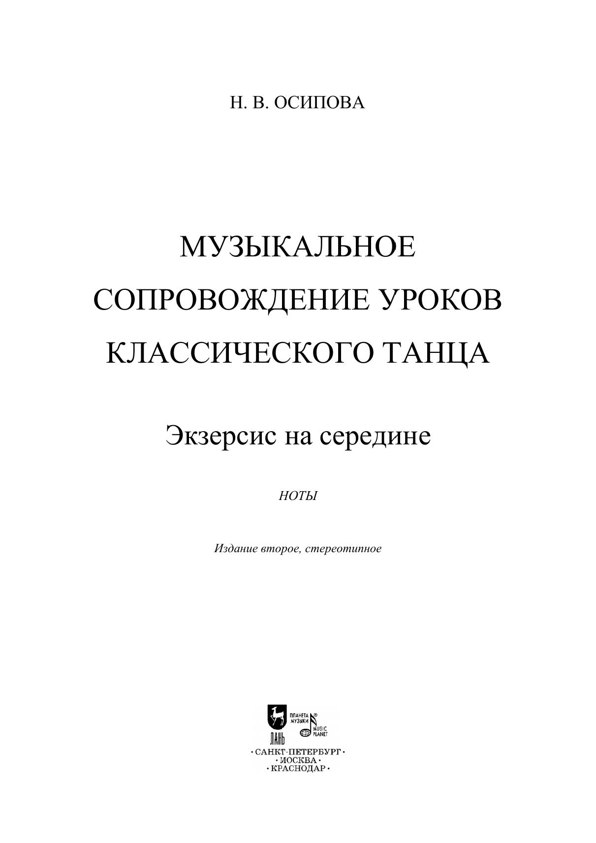 «Музыкальное сопровождение уроков классического танца» – серия авторских нотных сборников композитора, члена Союза композиторов Российской Федерации Наталии Осиповой. Данное издание представляет собой уникальные музыкальные произведения, написанные для экзерсиса на середине. Пособия предназначены для концертмейстеров хореографических отделений школ искусств, балетных школ, училищ, преподавателей хореографии и студентов. “Musical accompaniment for classical dance lessons” is a series of original music collections by Natalia Osipova, composer, member of the Union of Composers of the Russian Federation. This edition represents original music pieces intended for a centre exercice. The textbooks are intended for accompanists of choreography departments of schools of arts, ballet schools, colleges, choreography teachers and students.