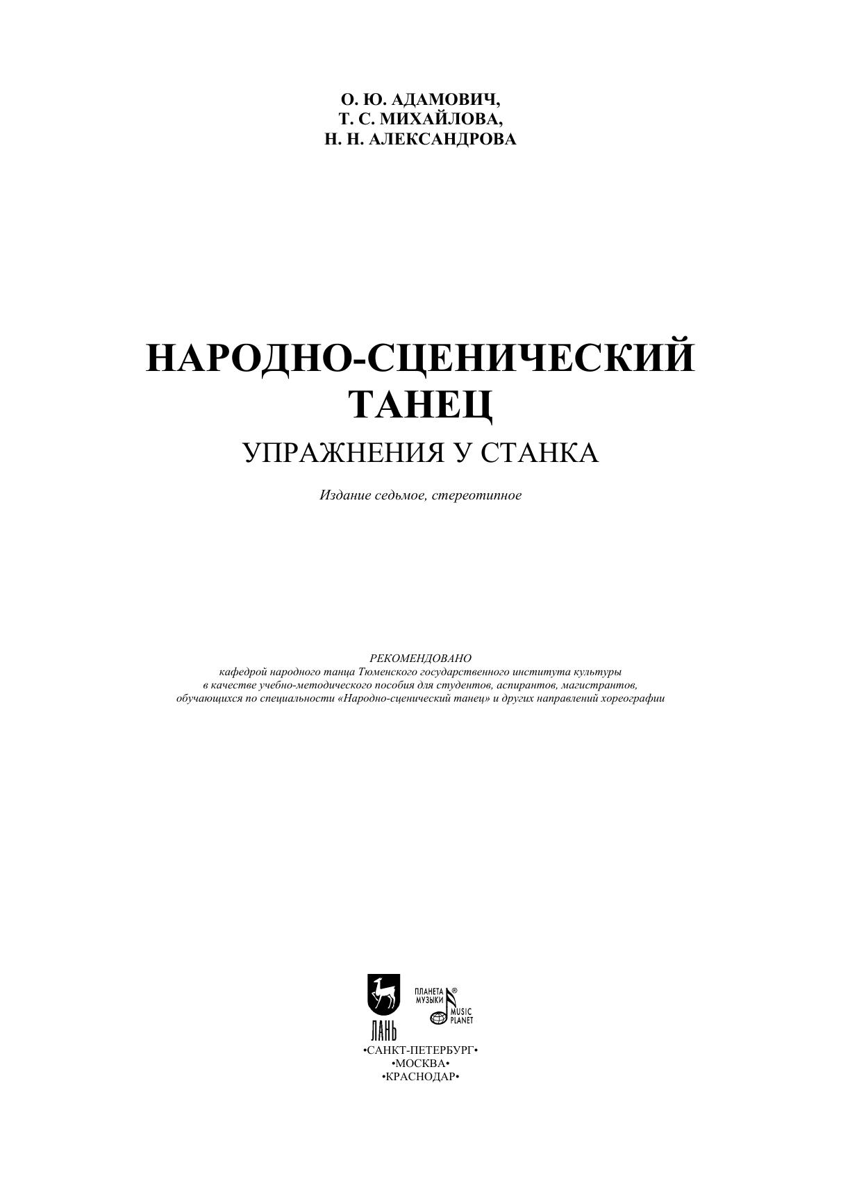 Цель данного пособия – помочь студентам в изучении методики преподавания экзерсиса народно-сценического танца как системы упражнений у палки, совершенствующей координацию движений, способствующей укреплению мышечного аппарата и дающей возможность овладеть разнообразием и манерой исполнения танцев различных народов. В пособии представлены основные виды упражнений у палки и их разновидности, рекомендуемые к изучению на протяжении всего периода обучения. Предназначено для студентов хореографических отделений, руководителей хореографических коллективов народного танца, для преподавателей школ искусств.