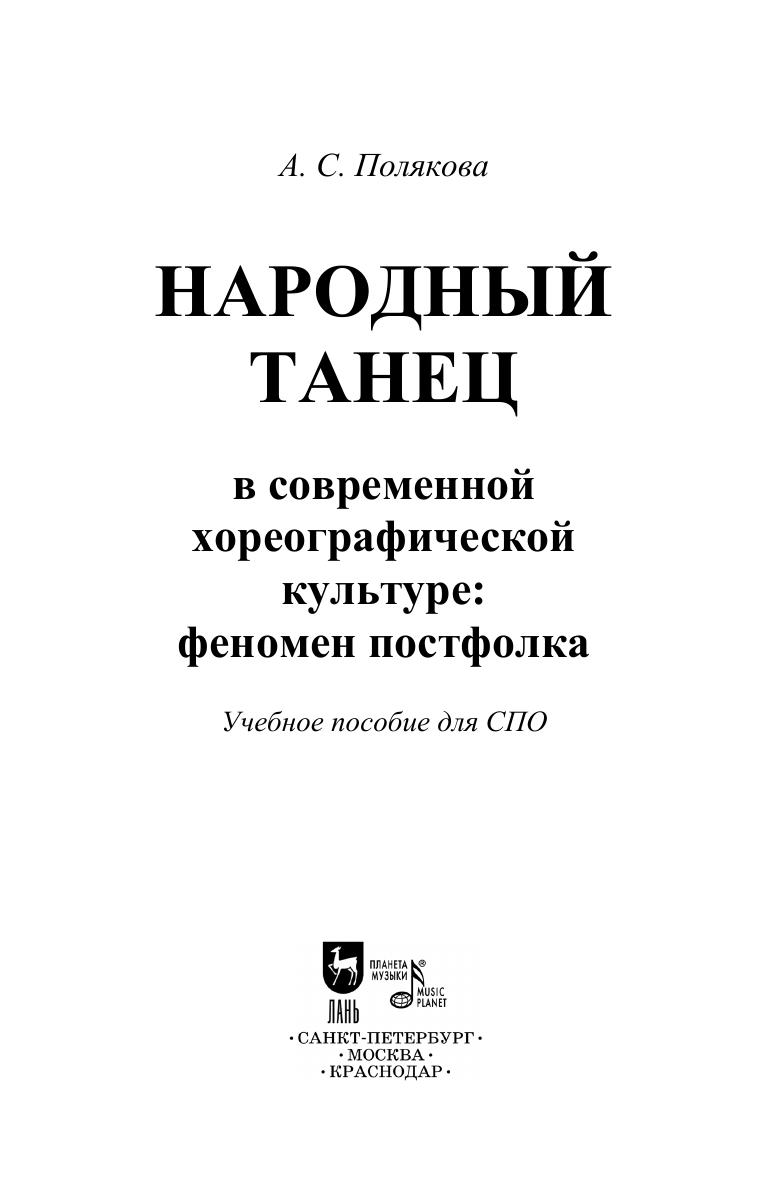 Автор пособия исходит из сложившейся социокультурной ситуации XX–XXI веков, главной особенностью которого является утрата подлинного народного танца в повседневной культуре общества и одновременно наблюдаемый процесс обращения предста-вителей современной хореографической культуры к фольклорным истокам, корням. В работе определены демаркационные линии, специфические черты, а также исторические трансформации народного танца, разрабатывается концепция включения элементов народного танца в профессиональную хореографическую культуру в период с XVII–XXI веков, вводится новое понятие — танец постфолк. Соответствует современным требованиям Федерального государственного образова-тельного стандарта среднего профессионального образования и профессиональным квалификационным требованиям. Пособие адресовано студентам средних специальных учебных заведений. The author of the monograph proceeds from the current sociocultural situation of the 20th–21st centuries, the main feature of which is the loss of authentic folk dance in the society everyday culture and at the same time the process of the modern choreographic culture representatives turning to folklore sources and roots. The author defines demarcation lines, specific features, as well as historical transformations of folk dance, develops the concept of the incorporating of folk dance elements into professional choreographic culture during the period from the 17th to 21st centuries, and introduces a new “post-folk dance” concept. Corresponds to the modern requirements of the Federal State Educational Standard of Secondary Vocational Education and professional qualification requirements. The textbook is addressed to students of colleges.