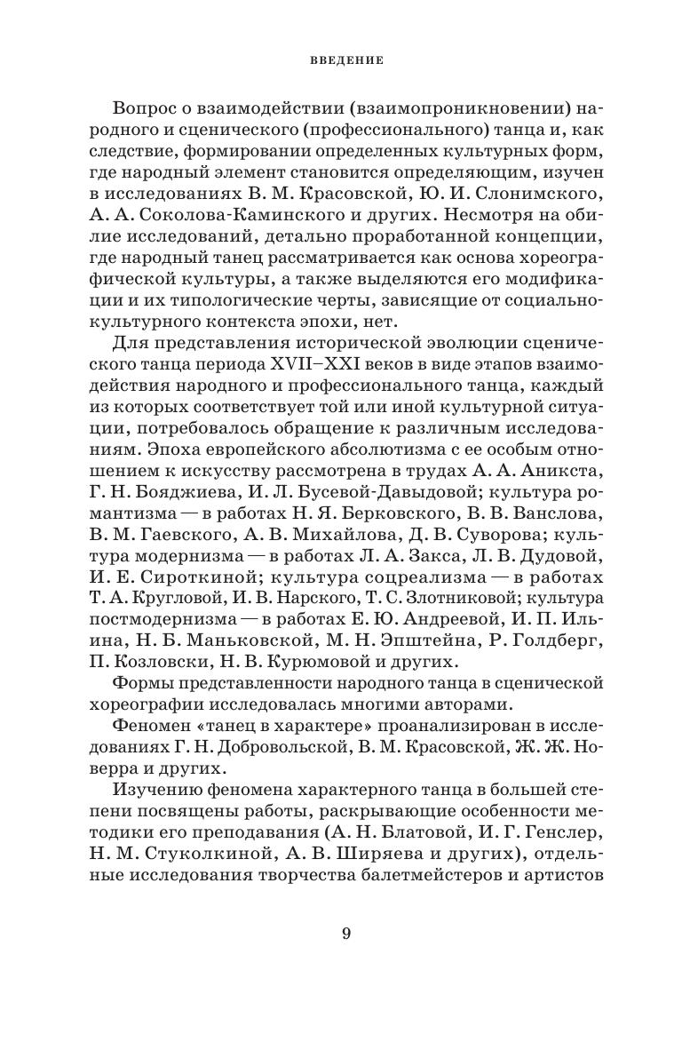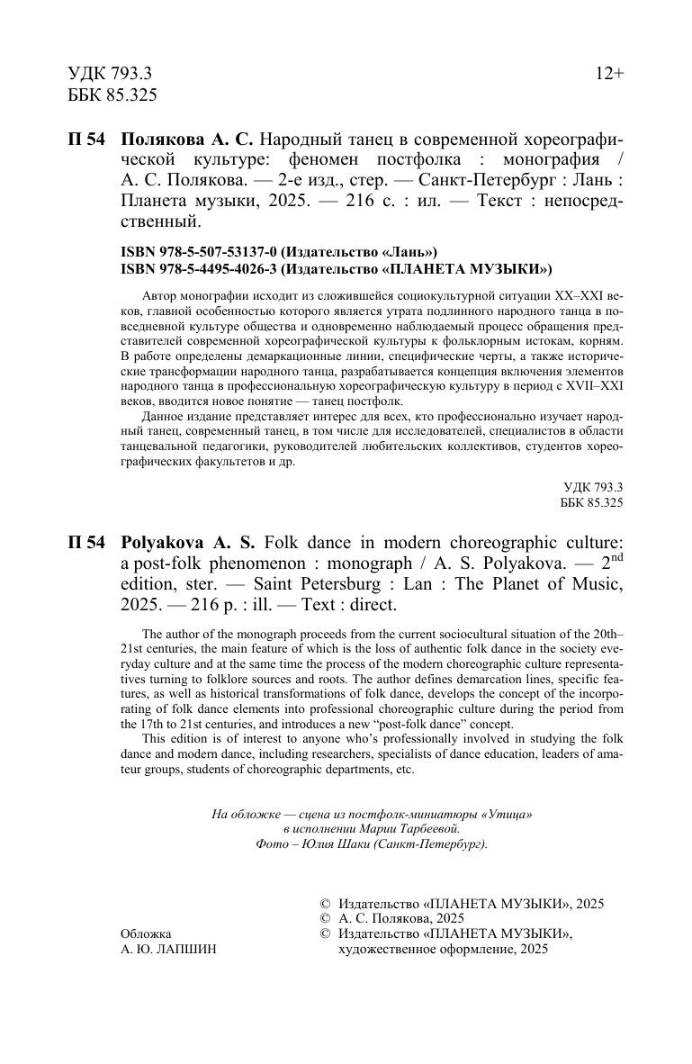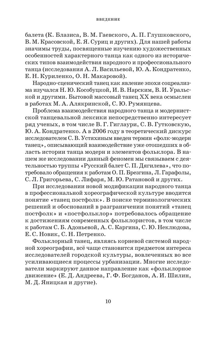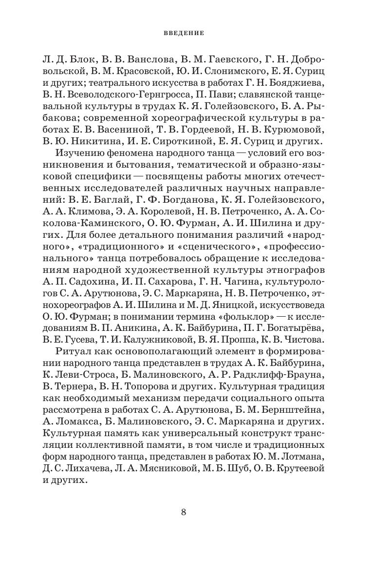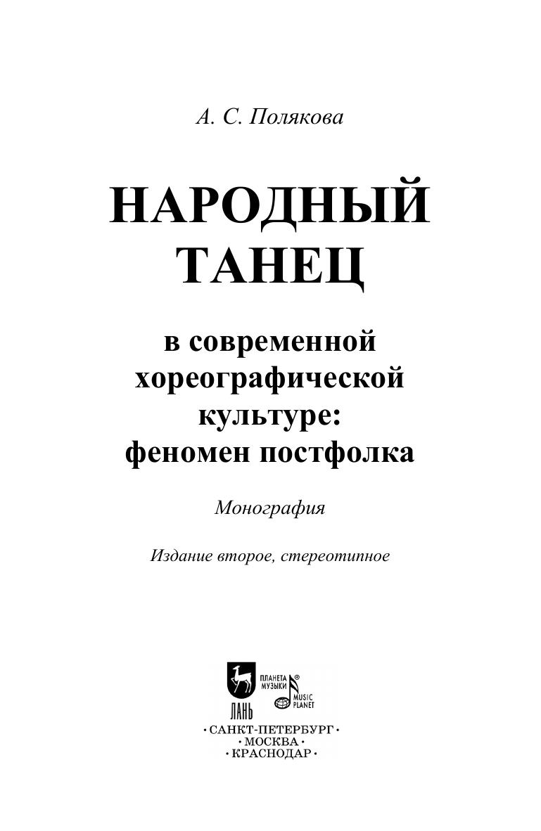 Автор монографии исходит из сложившейся социокультурной ситуации XX-XXI вв., главной особенностью которого является утрата подлинного народного танца в повседневной культуре общества и одновременно наблюдаемый процесс обращения представителей современной хореографической культуры к фольклорным истокам, корням. В работе определены демаркационные линии, специфические черты, а также исторические трансформации народного танца, разрабатывается концепция включения элементов народного танца в профессиональную хореографическую культуру в период с XVII-XXI вв., вводится новое понятие – «танец постфолк». Данное издание представляет интерес для всех, кто профессионально изучает народный танец, современный танец, в том числе для исследователей, специалистов в области танцевальной педагогики, руководителей любительских коллективов, студентов хореографических факультетов и др. The author of the monograph proceeds from the current sociocultural situation of the 20th–21st centuries, the main feature of which is the loss of authentic folk dance in the society everyday culture and at the same time the process of the modern choreographic culture representatives turning to folklore sources and roots. The author defines demarcation lines, specific features, as well as historical transformations of folk dance, develops the concept of the incorporating of folk dance elements into professional choreographic culture during the period from the 17th to 21st centuries, and introduces a new “post-folk dance” concept. This edition is of interest to anyone who’s professionally involved in studying the folk dance and modern dance, including researchers, specialists of dance education, leaders of amateur groups, students of choreographic departments, etc.