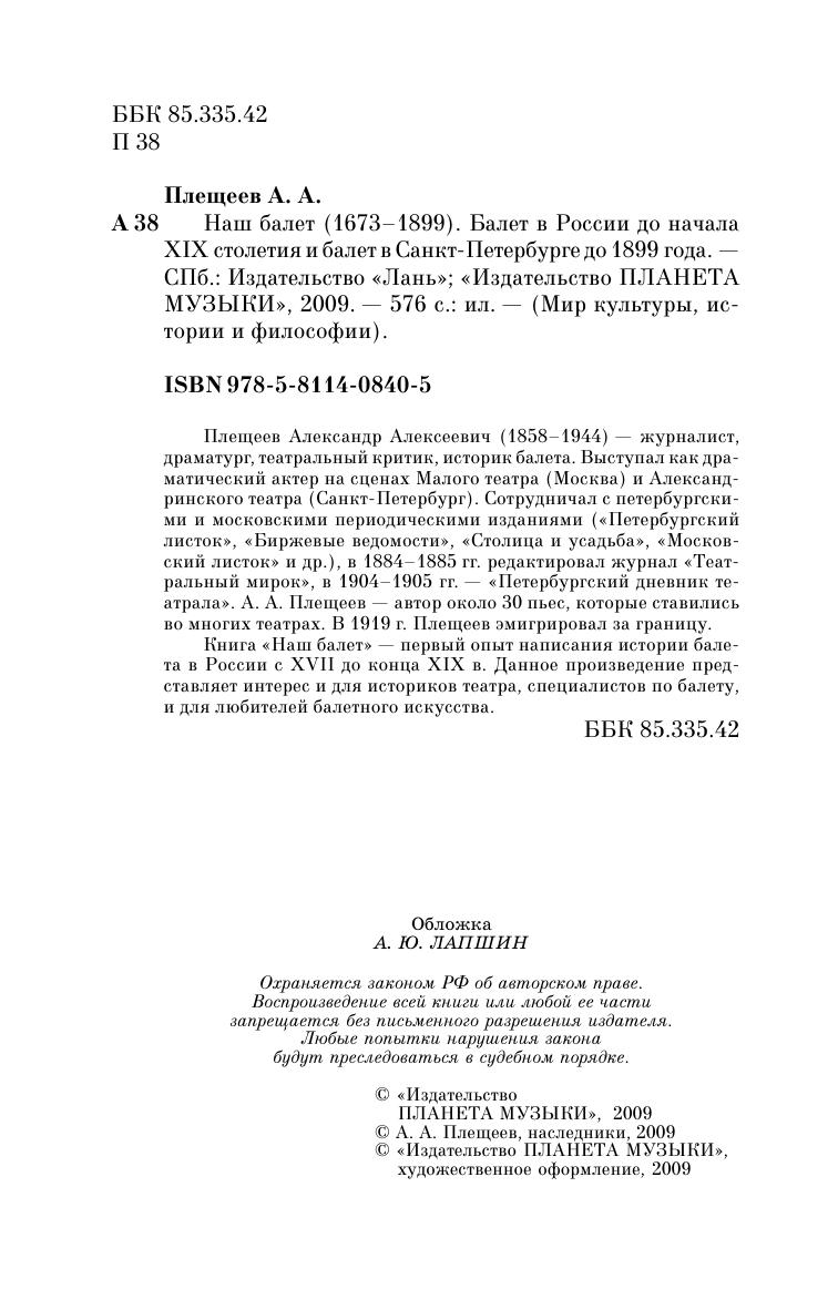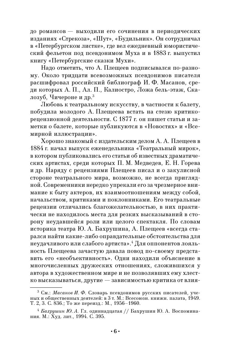Плещеев Александр Алексеевич (1858–1944) — журналист, драматург, театральный критик, историк балета. Выступал как драматический актер на сценах Малого театра (Москва) и Александринского театра (Санкт-Петербург). Сотрудничал с петербургскими и московскими периодическими изданиями («Петербургский листок», «Биржевые ведомости», «Столица и усадьба», «Московский листок» и др.), в 1884–1885 гг. редактировал журнал «Театральный мирок», в 1904–1905 гг. — «Петербургский дневник театрала». А.А. Плещеев — автор около 30 пьес, которые ставились во многих театрах. В 1919 г. Плещеев эмигрировал за границу. Книга «Наш балет» — первый опыт написания истории балета в России с XVII до конца XIX вв. Данное произведение представляет интерес и для историков театра, специалистов по балету и любителей балетного искусства.