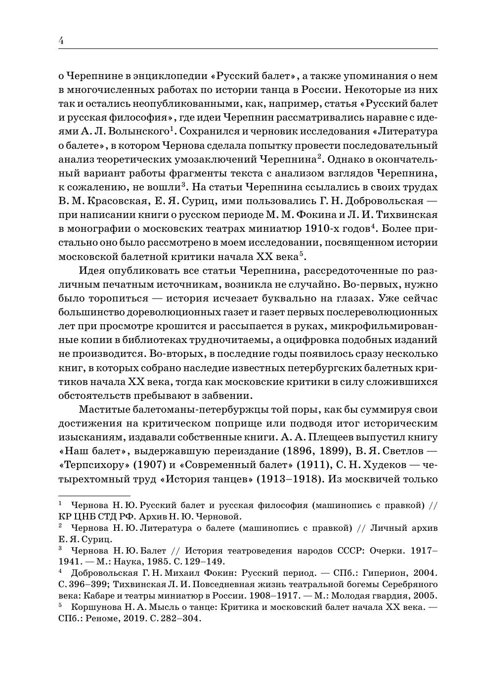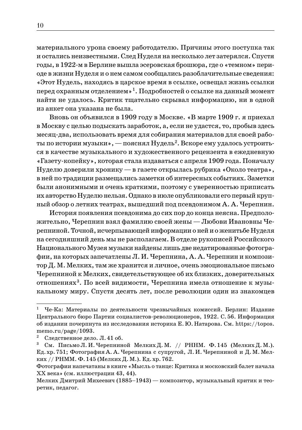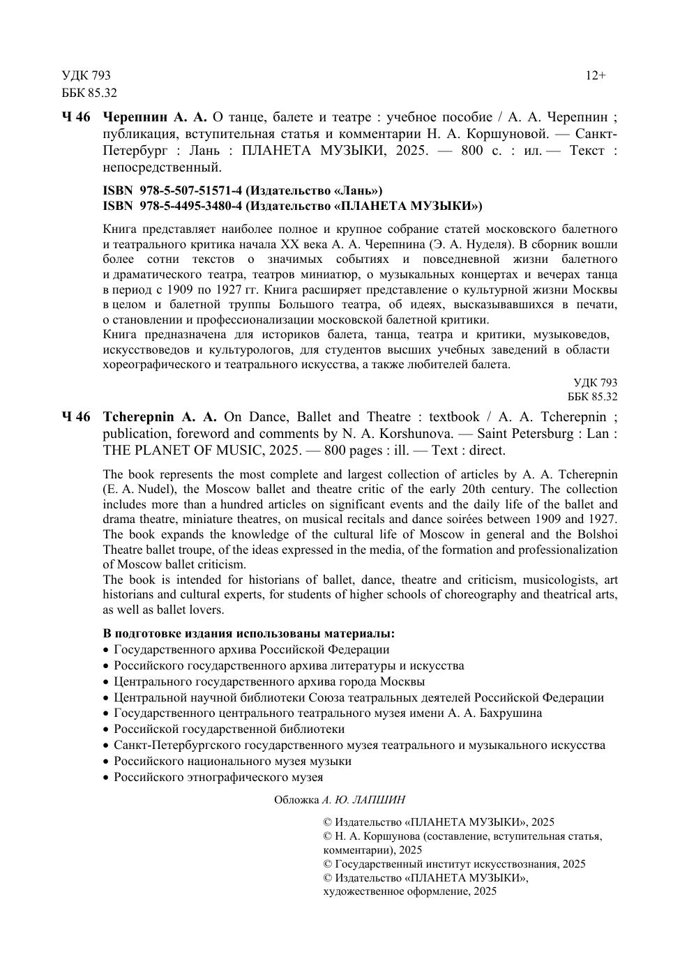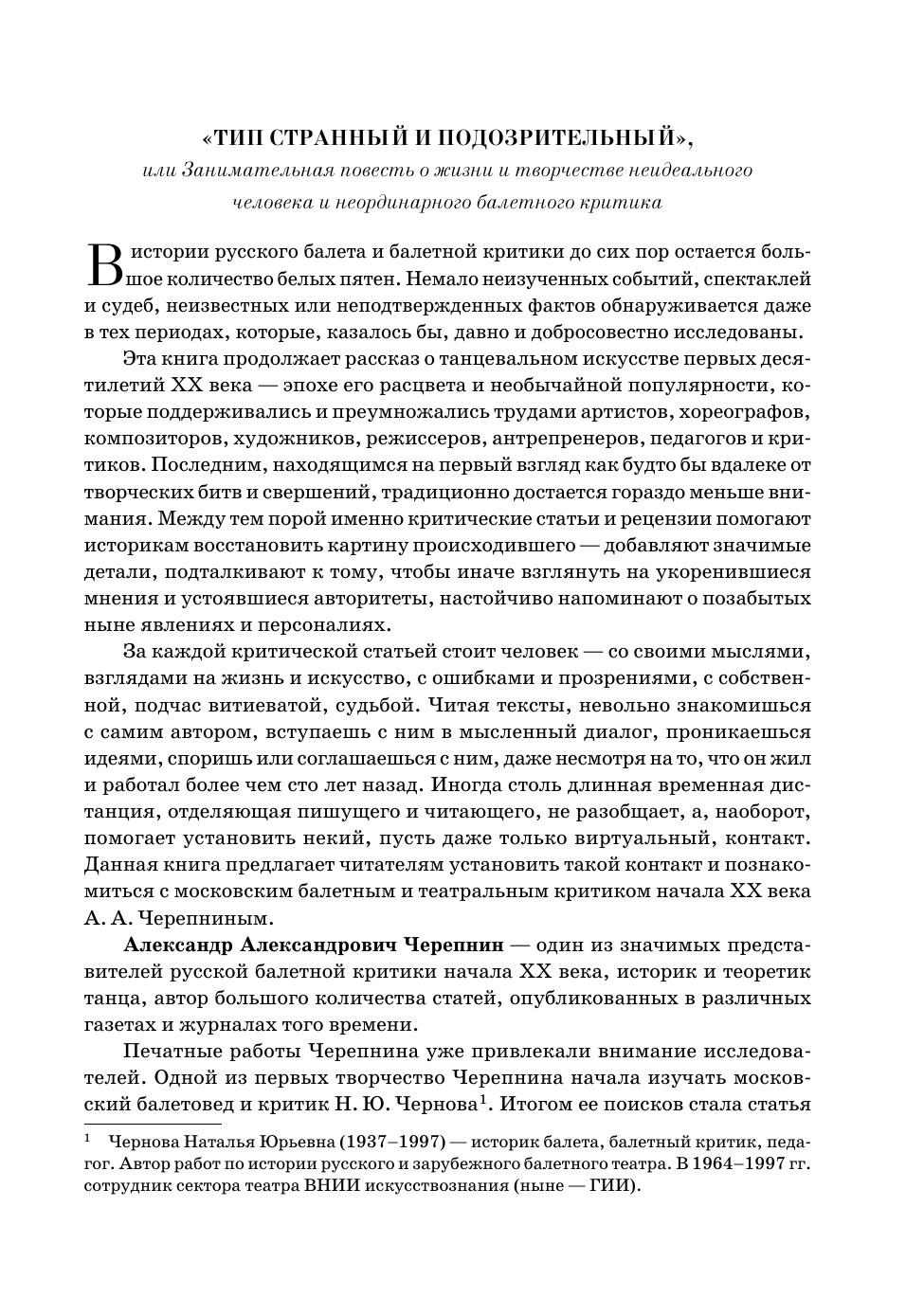Книга представляет наиболее полное и крупное собрание статей московского балетного и театрального критика начала ХХ века А. А. Черепнина (Э. А. Нуделя). В сборник вошли более сотни текстов о значимых событиях и повседневной жизни балетного и драматического театра, театров миниатюр, о музыкальных концертах и вечерах танца периода с 1909 по 1927 гг. Книга расширяет представление о культурной жизни Москвы в целом и балетной труппы Большого театра, об идеях, высказывавшихся в печати, о становлении и профессионализации московской балетной критики. Книга предназначена для историков балета, танца, театра и критики, музыковедов, искусствоведов и культурологов, для студентов высших учебных заведений в области хореографического и театрального искусства, а также любителей балета. The book represents the most complete and largest collection of articles by A. A. Tcherepnin (E. A. Nudel), the Moscow ballet and theatre critic of the early 20th century. The collection includes more than a hundred articles on significant events and the daily life of the ballet and drama theatre, miniature theatres, on musical recitals and dance soirées between 1909 and 1927. The book expands the knowledge of the cultural life of Moscow in general and the Bolshoi Theatre ballet troupe, of the ideas expressed in the media, of the formation and professionalization of Moscow ballet criticism. The book is intended for historians of ballet, dance, theatre and criticism, musicologists, art historians and cultural experts, for students of higher schools of choreography and theatrical arts, as well as ballet lovers.