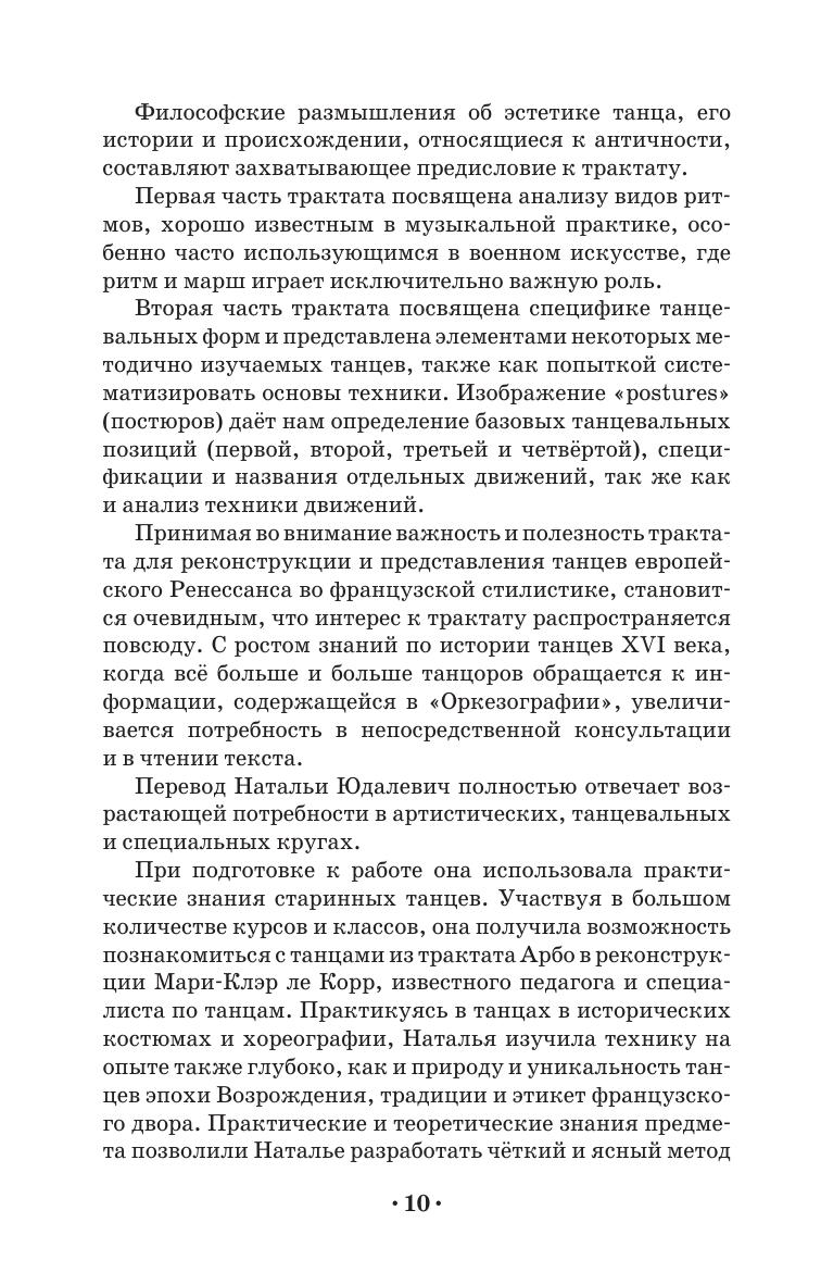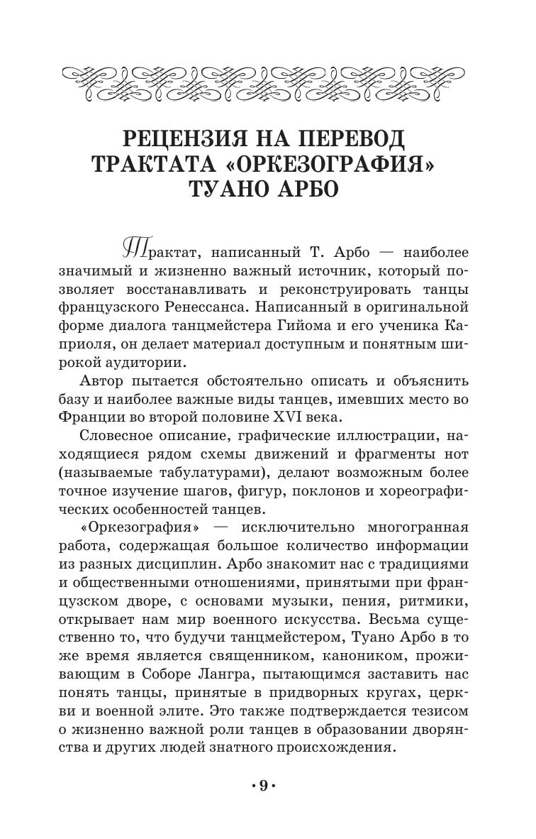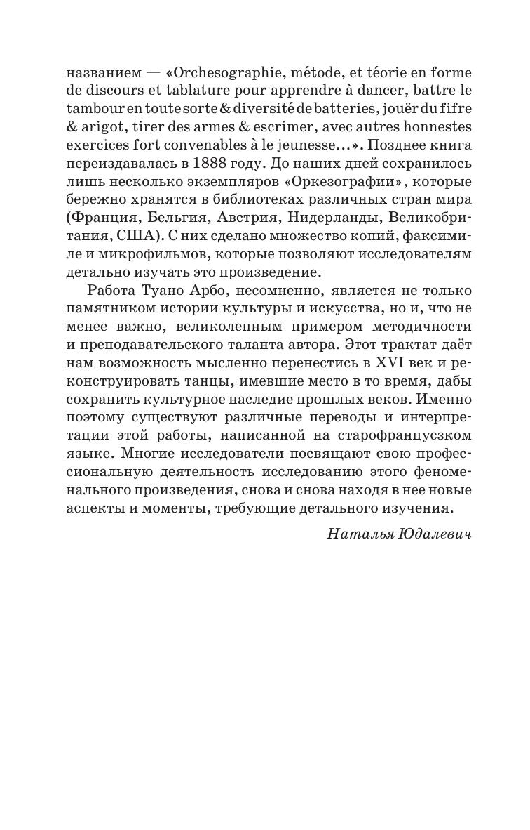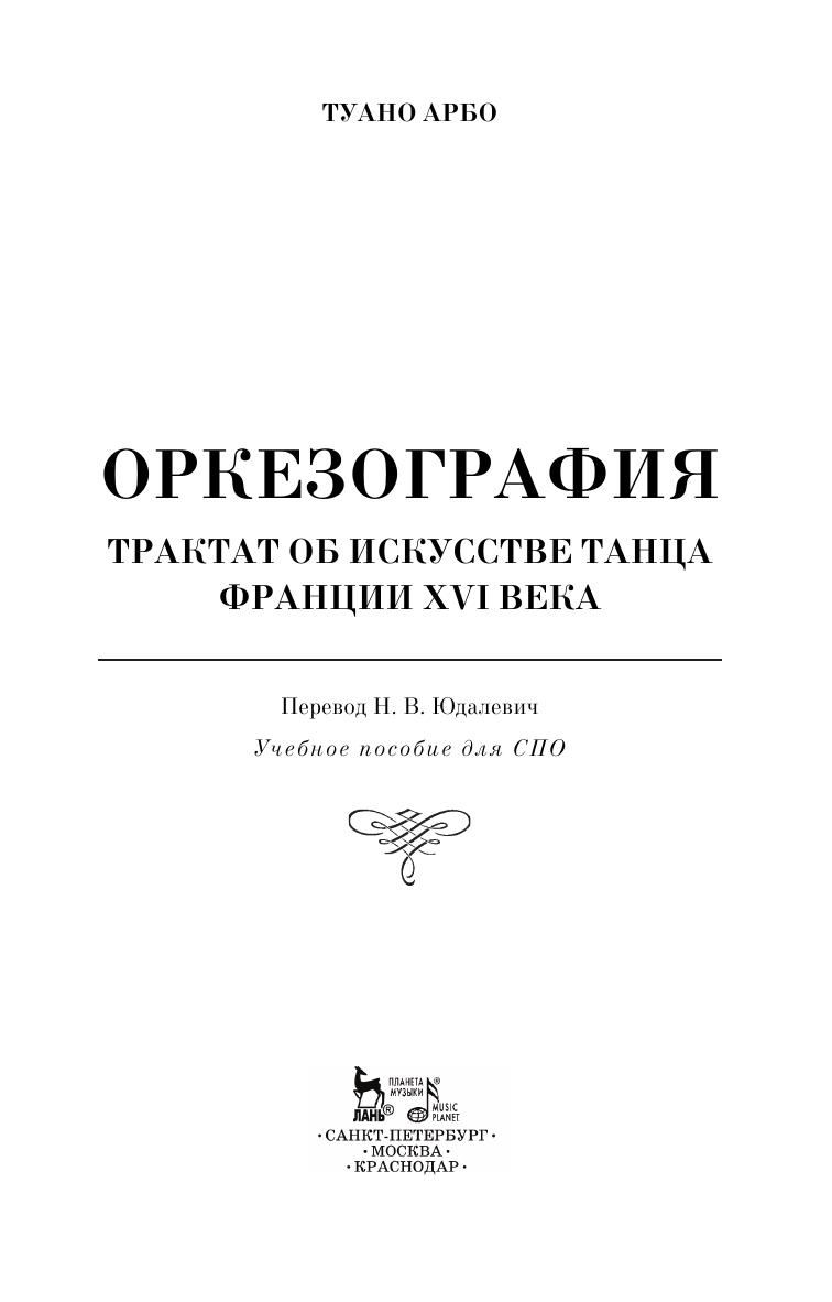 Трактат «Оркезография» Туано Арбо — первый дошедший до нас учебник по изучению танцевального искусства. Это первый источник, содержащий методически обоснованное повествование о танцевальном этикете, о том, что такое танец, какие танцы были популярны в середине XVI века, как и кому их следует исполнять. Учебник написан в традициях принятой тогда манеры живой беседы учителя и ученика. Благодаря этому самые сложные вопросы поданы легко и изящно. Книга не ограничивается сухим и скучным описанием танцевальных па — учитель и ученик горячо обсуждают этикет, нравственные и моральные проблемы, которые волновали тогда общество. Книга включает в себя большое количество иллюстраций и табулатур. Кроме того, переводчик провел большую исследовательскую работу и снабдил перевод многочисленными дополнительными материалами, которые помогут современному читателю: глоссарием, биографией Арбо, перечнем французских танцевальных терминов с транскрипцией и статьей французского исследователя Николя Гране о том, как правильно читать старофранцузские тексты. Книга предназначена для студентов и педагогов средних специальных учебных заведений.
