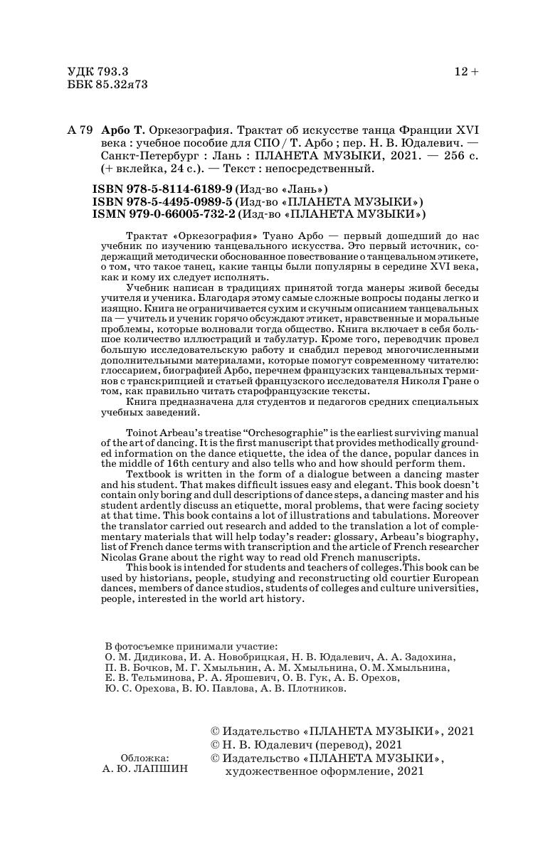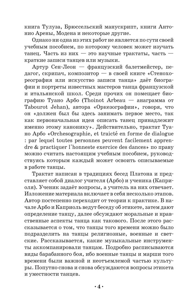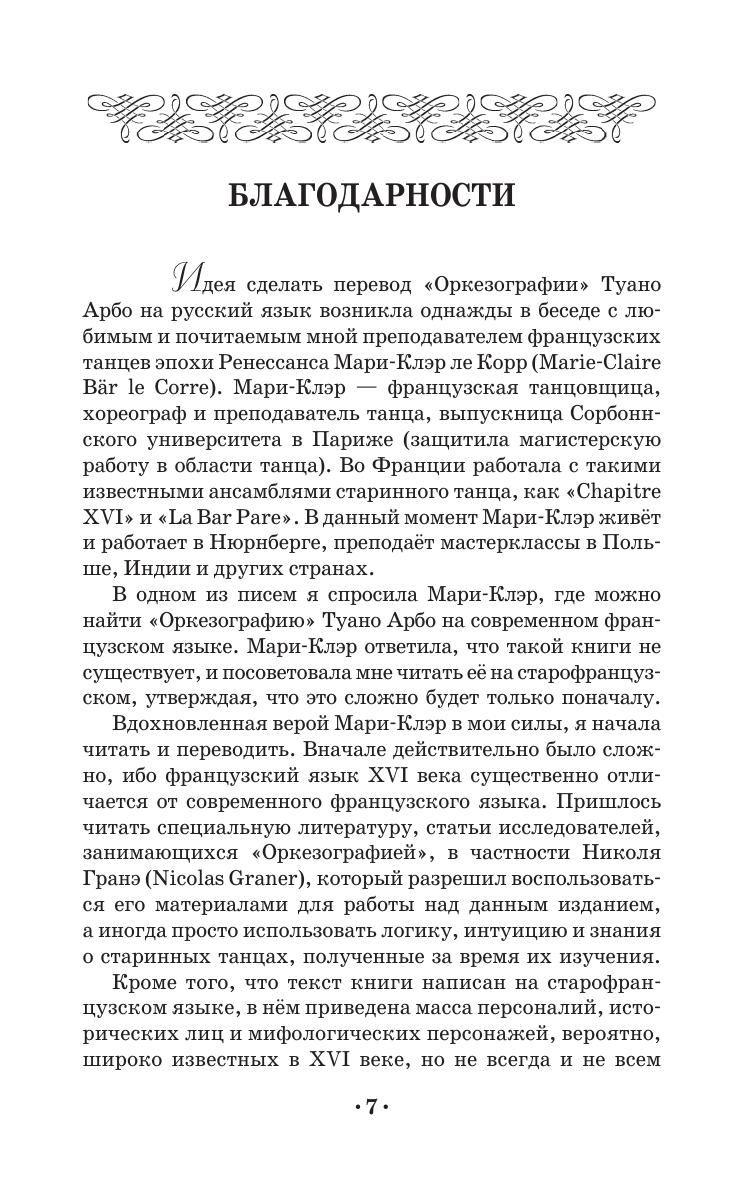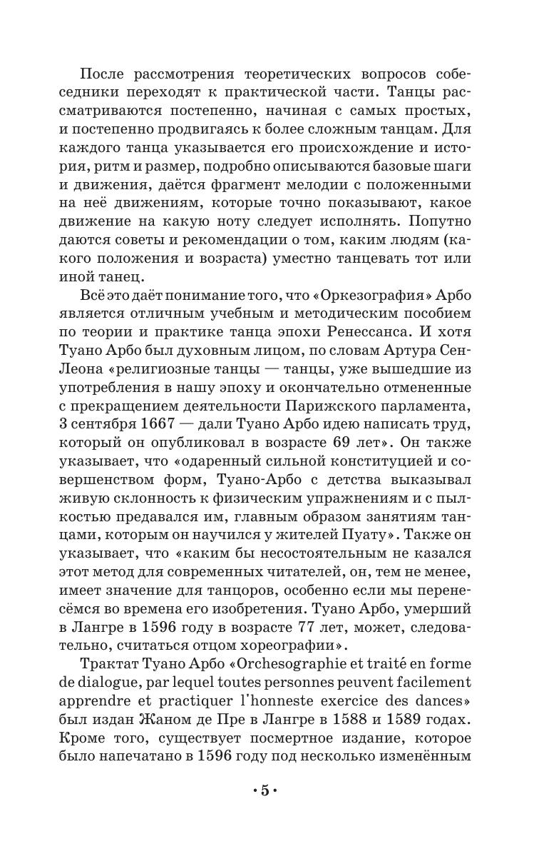 Трактат «Оркезография» Туано Арбо — первый дошедший до нас учебник по изучению танцевального искусства. Это первый источник, содержащий методически обоснованное повествование о танцевальном этикете, о том, что такое танец, какие танцы были популярны в середине XVI века, как и кому их следует исполнять. Учебник написан в традициях принятой тогда манеры живой беседы учителя и ученика. Благодаря этому самые сложные вопросы поданы легко и изящно. Книга не ограничивается сухим и скучным описанием танцевальных па — учитель и ученик горячо обсуждают этикет, нравственные и моральные проблемы, которые волновали тогда общество. Книга включает в себя большое количество иллюстраций и табулатур. Кроме того, переводчик провел большую исследовательскую работу и снабдил перевод многочисленными дополнительными материалами, которые помогут современному читателю: глоссарием, биографией Арбо, перечнем французских танцевальных терминов с транскрипцией и статьей французского исследователя Николя Гране о том, как правильно читать старофранцузские тексты. Книга предназначена для студентов и педагогов средних специальных учебных заведений.