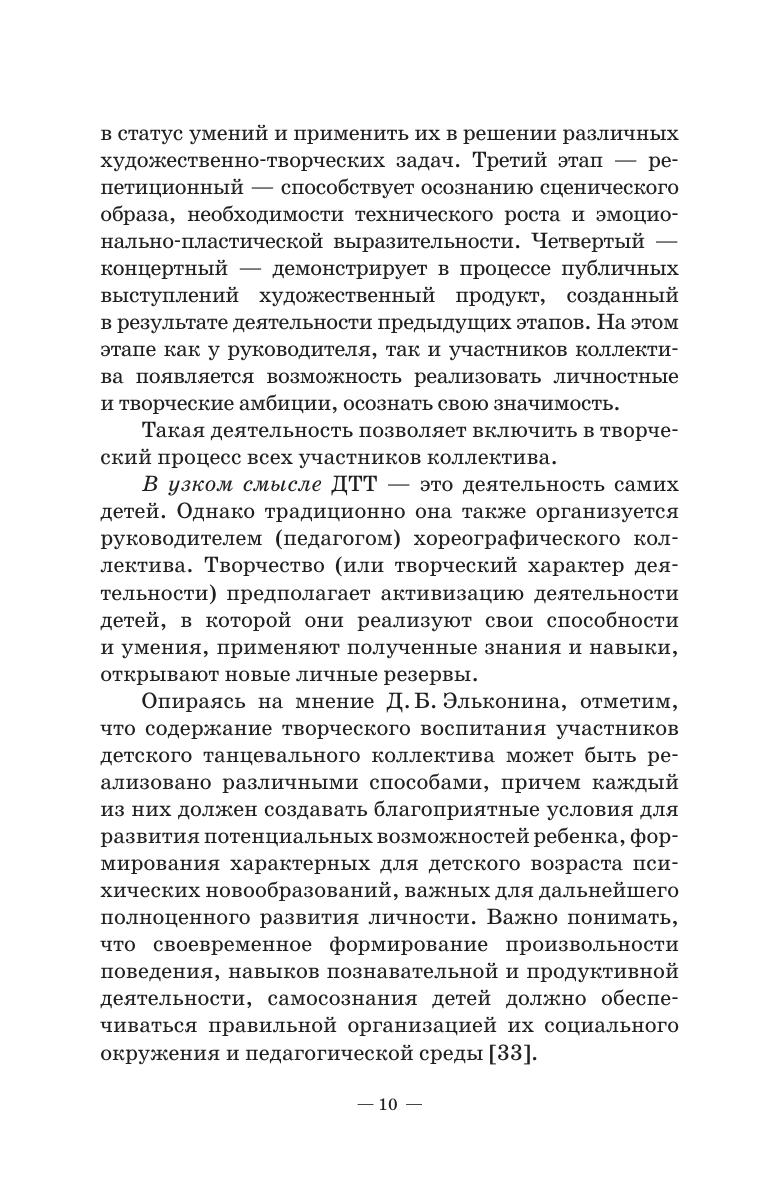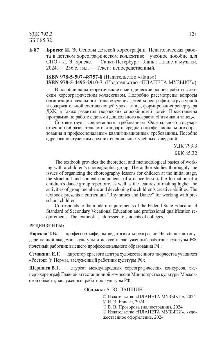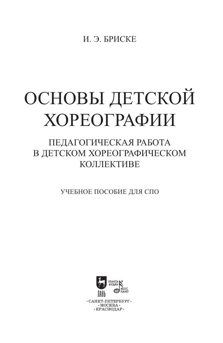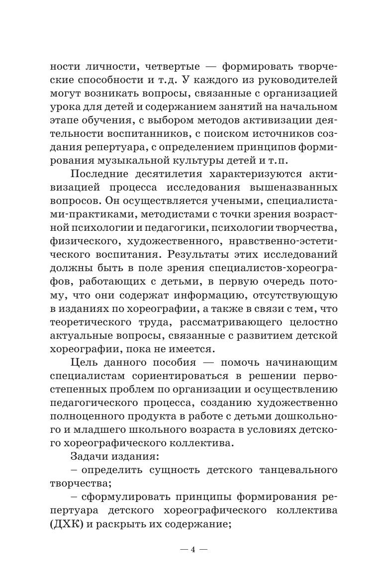 В пособии даны теоретические и методические основы работы с детским хореографическим коллективом. Подробно рассмотрены вопросы организации начального этапа обучения детей хореографии, структурной и содержательной составляющей урока танца, формирования репертуара ДХК, а также особенности активизации деятельности участников коллектива и развития их творческих способностей. Как пример подготовительно-организационной деятельности руководителя в пособии представлена программа по работе с детьми дошкольного возраста «Ритмика и танец», а также ее сопроводительный методический материал. Предложен обширный понятийный аппарат, список литературы. Соответствует современным требованиям Федерального государственного образовательного стандарта среднего профессионального образования и профессиональным квалификационным требованиям. Пособие адресовано студентам средних специальных учебных заведений. The textbook provides the theoretical and methodological basics of work- ing with a children’s choreographic group. The author studies thoroughly the issues of organizing the choreography lessons for children at the initial stage, the structural and content components of a dance lesson, the formation of a children’s dance group repertoire, as well as the features of making higher the activities of group members and developing the сhildren’s creative abilities. The textbook presents a curriculum “Rhythmics and Dance” for working with pre- school children. Corresponds to the modern requirements of the Federal State Educational Standard of Secondary Vocational Education and professional qualification re- quirements. The textbook is addressed to students of сolleges.