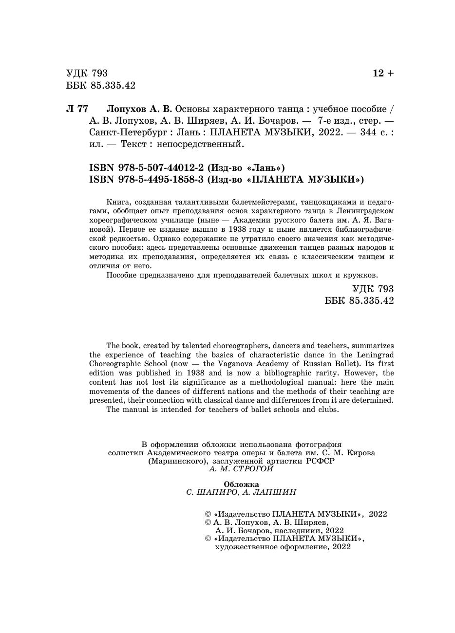 The book, created by talented choreographers, dancers and teachers, summarizes the experience of teaching the basics of characteristic dance in the Leningrad Choreographic School (now — the Vaganova Academy of Russian Ballet). Its first edition was published in 1938 and is now a bibliographic rarity. However, the content has not lost its significance as a methodological manual: here the main movements of the dances of different nations and the methods of their teaching are presented, their connection with classical dance and differences from it are determined.