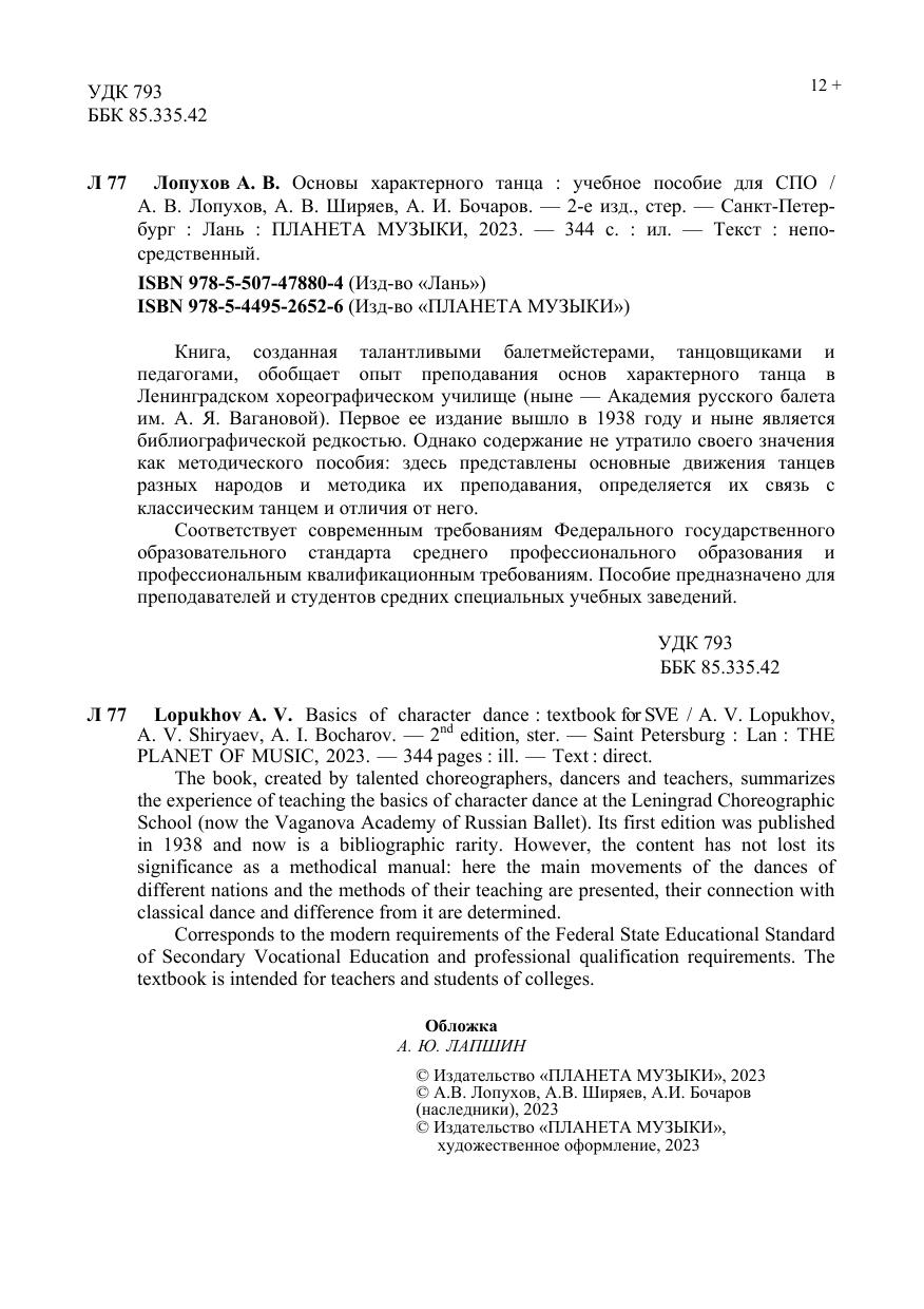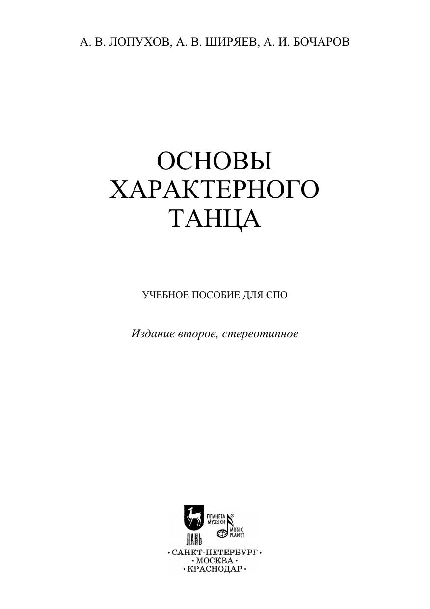 Книга, созданная талантливыми балетмейстерами, танцовщиками и педагогами, обобщает опыт преподавания основ характерного танца в Ленинградском хореографическом училище (ныне — Академии русского балета им. А. Я. Вагановой). Первое ее издание вышло в 1938 году и ныне является библиографической редкостью. Однако содержание не утратило своего значения как методического пособия: здесь представлены основные движения танцев разных народов и методика их преподавания, определяется их связь с классическим танцем и отличия от него. Пособие предназначено для преподавателей и студентов средних специальных учебных заведений. The book, created by talented choreographers, dancers and teachers, summarizes the experience of teaching the basics of characteristic dance in the Leningrad Choreographic School (now — the Vaganova Academy of Russian Ballet). Its first edition was published in 1938 and is now a bibliographic rarity. However, the content has not lost its significance as a methodological manual: here the main movements of the dances of different nations and the methods of their teaching are presented, their connection with classical dance and differences from it are determined. The manual is intended for teachers and students of colleges.