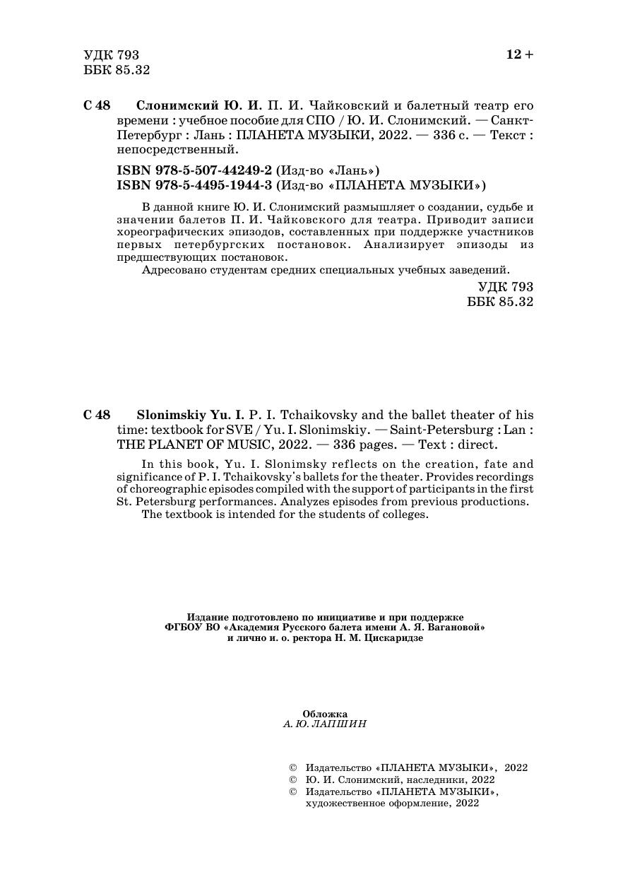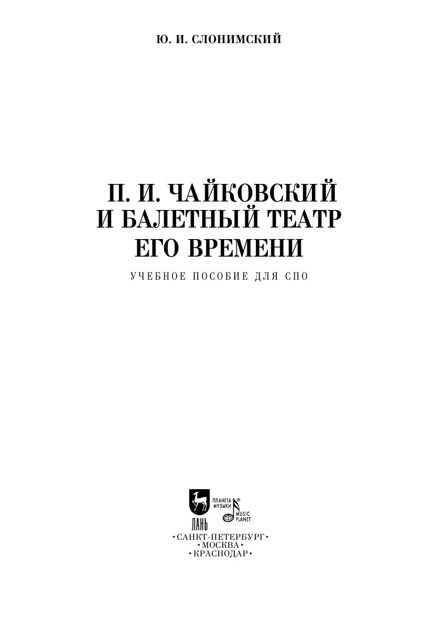 In this book, Yu. I. Slonimsky reflects on the creation, fate and significance of P. I. Tchaikovsky's ballets for the theater. Provides recordings of choreographic episodes compiled with the support of participants in the first St. Petersburg performances. Analyzes episodes from previous productions. Corresponds to the modern requirements of the Federal State Educational Standard of Secondary Vocational Education and professional qualification requirements.