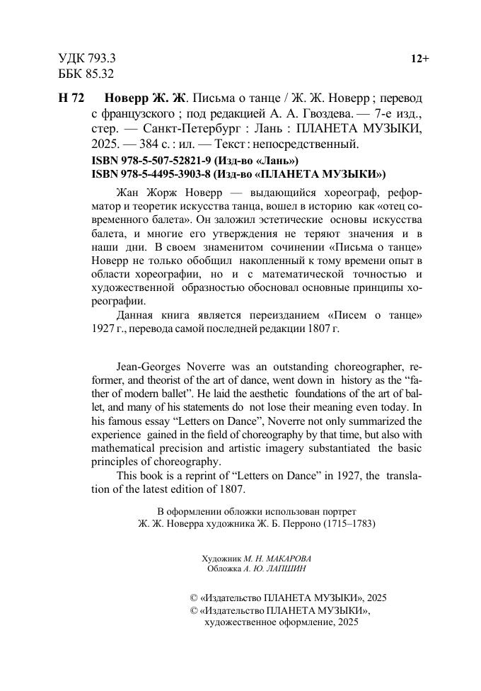 Жан Жорж Новерр - выдающийся хореограф, реформатор и теоретик искусства танца, вошел в историю как "отец современного балета". Он заложил эстетические основы искусства балета, и многие его утверждения не теряют значения и в наши дни. В своем знаменитом сочинении "Письма о танце" Новерр не только обобщил накопленный к тому времени опыт в области хореографии, но и с математической точностью и художественной образностью обосновал основные принципы хореографии. Данная книга является переизданием "Писем о танце" 1927 г., перевода самой последней редакции 1807 г. Jean-Georges Noverre was an outstanding choreographer, reformer, and theorist of the art of dance, went down in history as the “father of modern ballet”. He laid the aesthetic foundations of the art of ballet, and many of his statements do not lose their meaning even today. In his famous essay “Letters on Dance”, Noverre not only summarized the experience gained in the field of choreography by that time, but also with mathematical precision and artistic imagery substantiated the basic principles of choreography. This book is a reprint of "Letters on Dance" in 1927, the translation of the latest edition of 1807.
