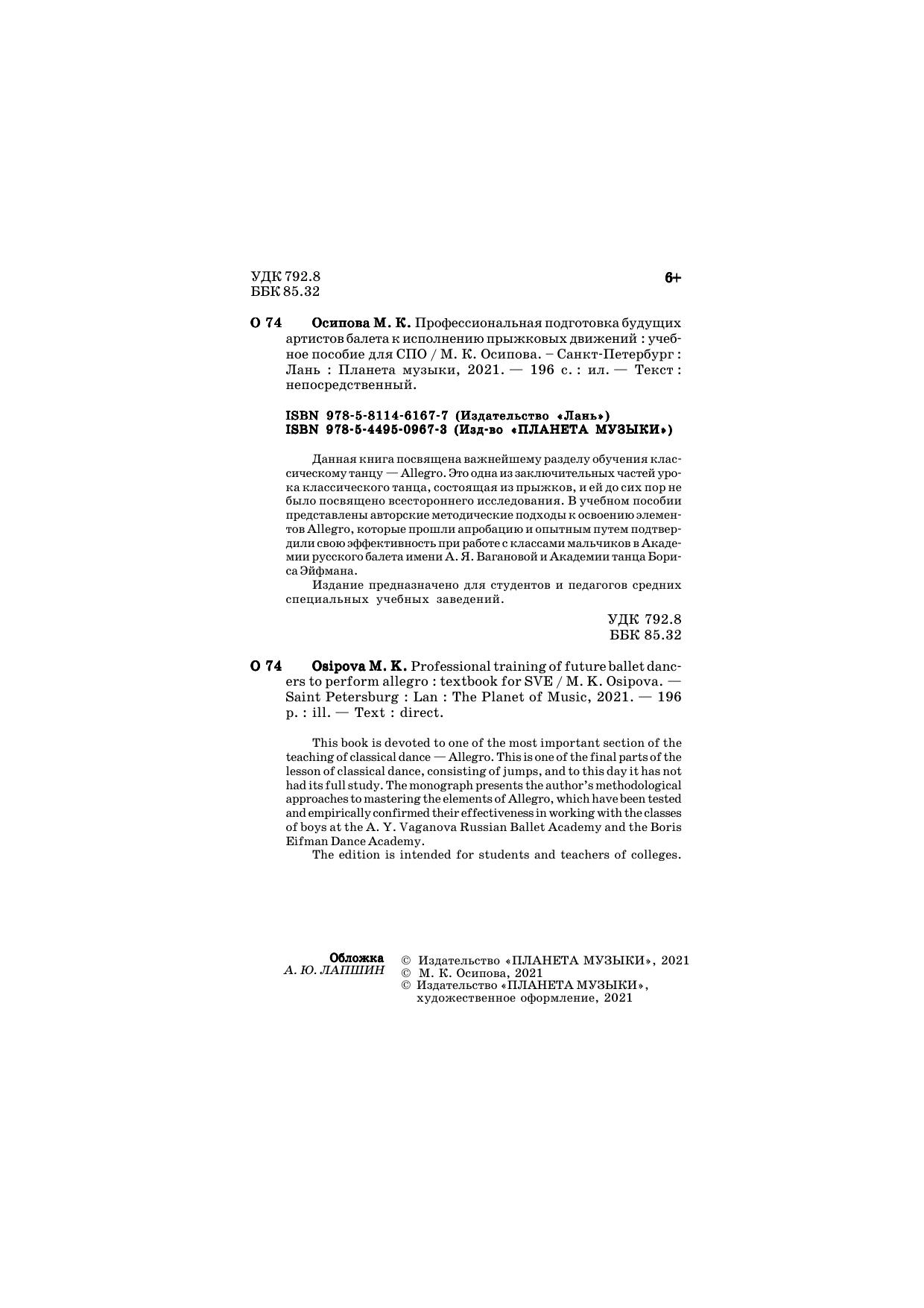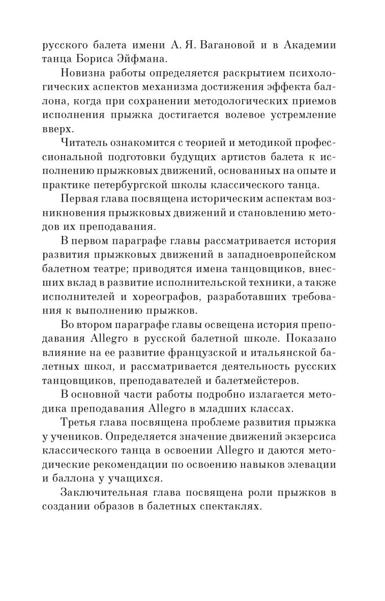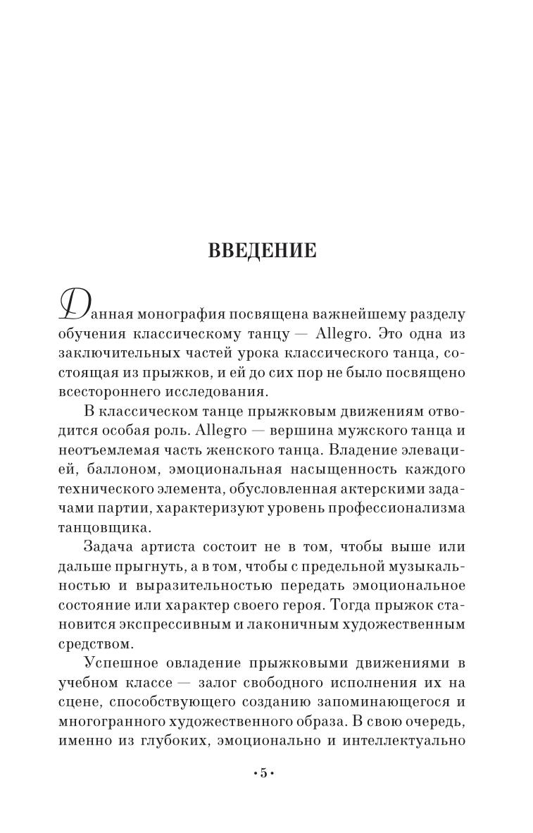 Данная книга посвящена важнейшему разделу обучения классическому танцу – Allegro. Это одна из заключительных частей урока классического танца, состоящая из прыжков, и ей до сих пор не было посвящено всестороннего исследования. В монографии представлены авторские методические подходы к освоению элементов Allegro, которые прошли апробацию и опытным путем подтвердили свою эффективность при работе с классами мальчиков.