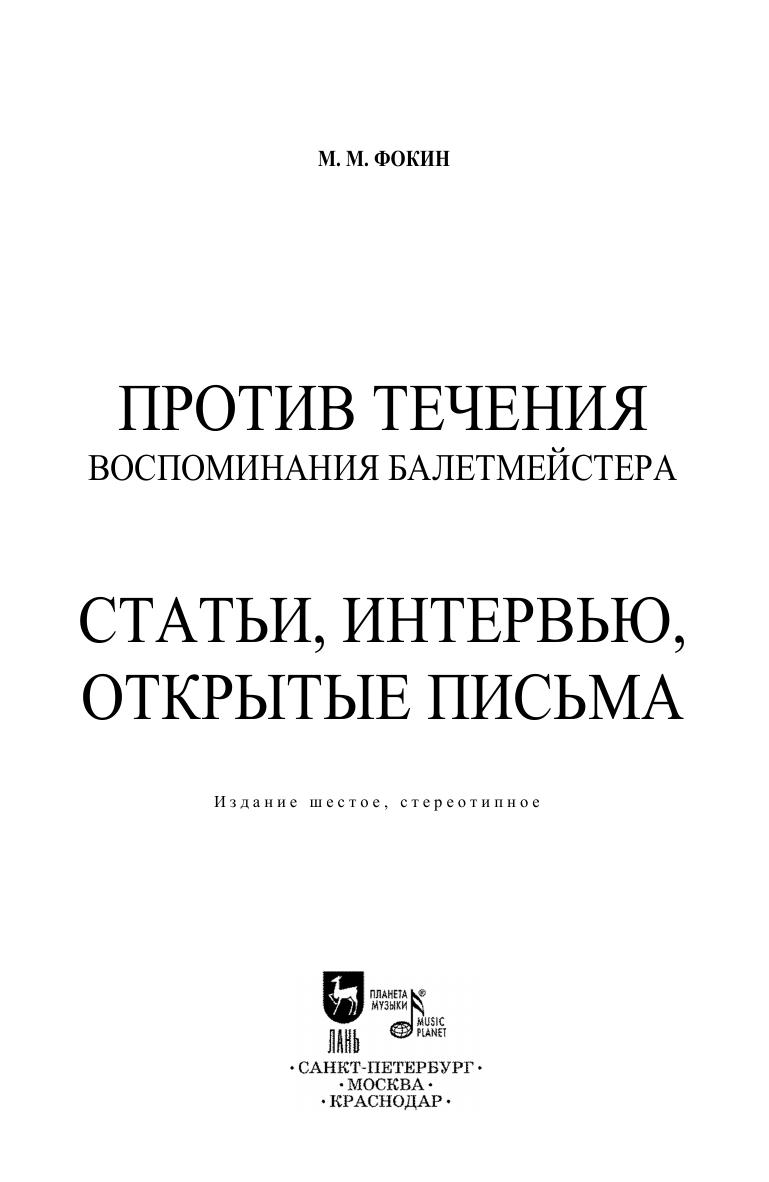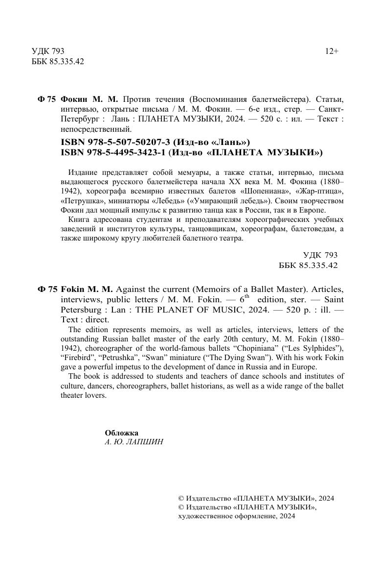Издание представляет собой мемуары, а также статьи, интервью, письма выдающегося русского балетмейстера начала XX века М. М. Фокина (1880 - 1942), хореографа всемирно известных балетов "Шопениана", "Жар-птица", "Петрушка", миниатюры "Лебедь" ("Умирающий лебедь"). Своим творчеством Фокин дал мощный импульс к развитию танца как в России, так и в Европе. Книга адресована студентам и преподавателям хореографических учебных заведений и институтов культуры, танцовщикам, хореографам, балетоведам, а также широкому кругу любителей балетного театра. The edition represents memoirs, as well as articles, interviews, letters of the outstanding Russian ballet master of the early 20th century, M. M. Fokin (1880–1942), choreographer of the world-famous ballets “Chopiniana” (“Les Sylphides”), “Firebird”, “Petrushka”, "Swan" miniature ("The Dying Swan"). With his work Fokin gave a powerful impetus to the development of dance in Russia and in Europe. The book is addressed to students and teachers of dance schools and institutes of culture, dancers, choreographers, ballet historians, as well as a wide range of the ballet theater lovers.