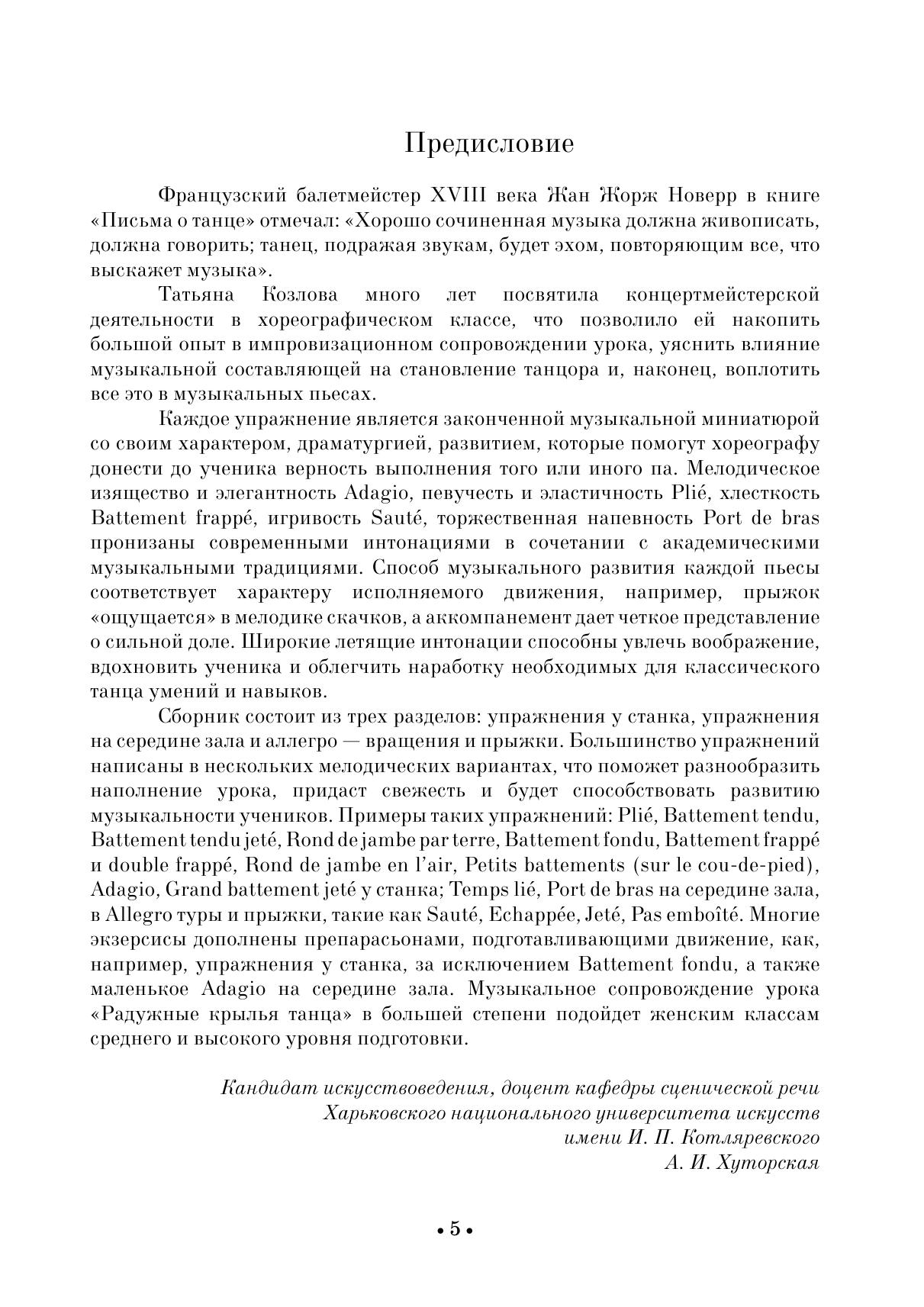 Сборник Татьяны Козловой «Радужные крылья танца» представляет собой собрание уникальных авторских материалов. Предназначен для концертмейстера класса классического танца и содержит авторское музыкальное сопровождение к экзерсисам у станка, на середине зала, а также прыжкам и вращениям.