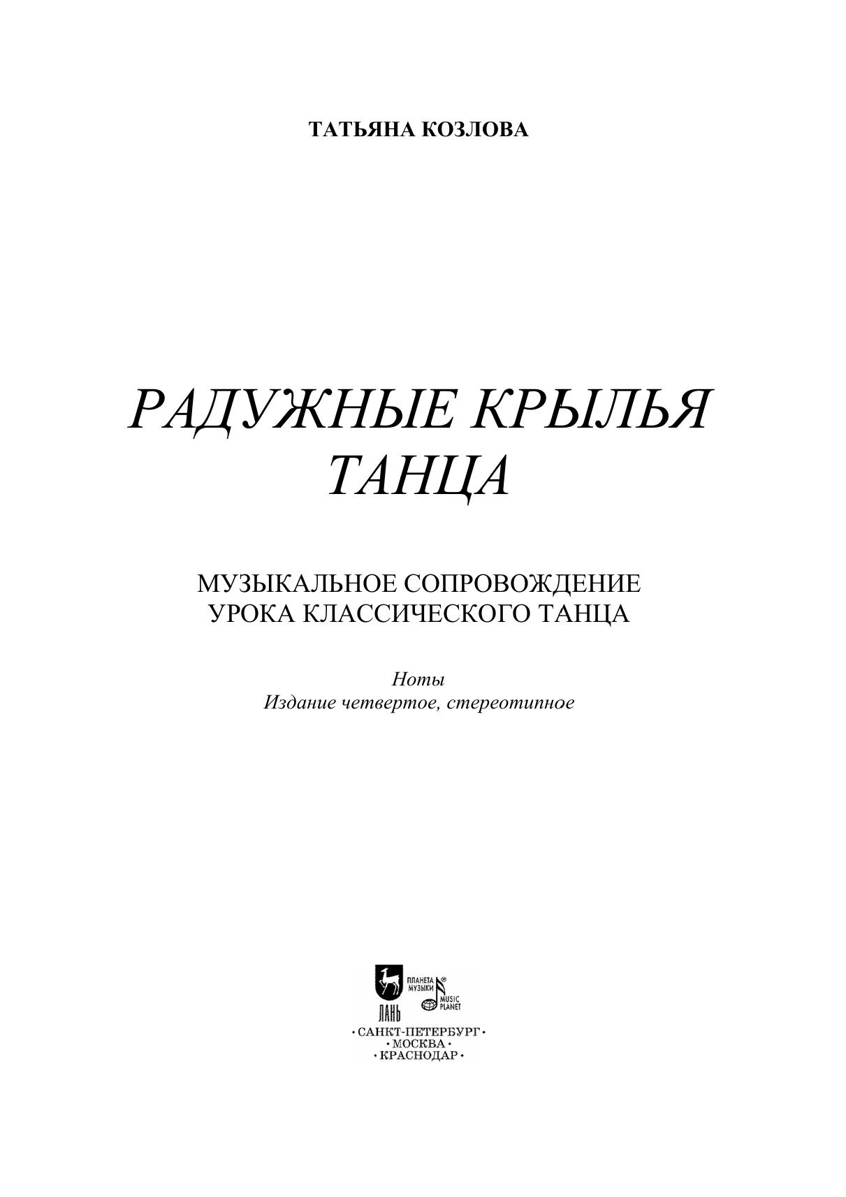 Сборник Татьяны Козловой «Радужные крылья танца» представляет собой собрание уникальных авторских материалов. Предназначен для концертмейстера класса классического танца и содержит авторское музыкальное сопровождение к экзерсисам у станка, на середине зала, а также прыжкам и вращениям.