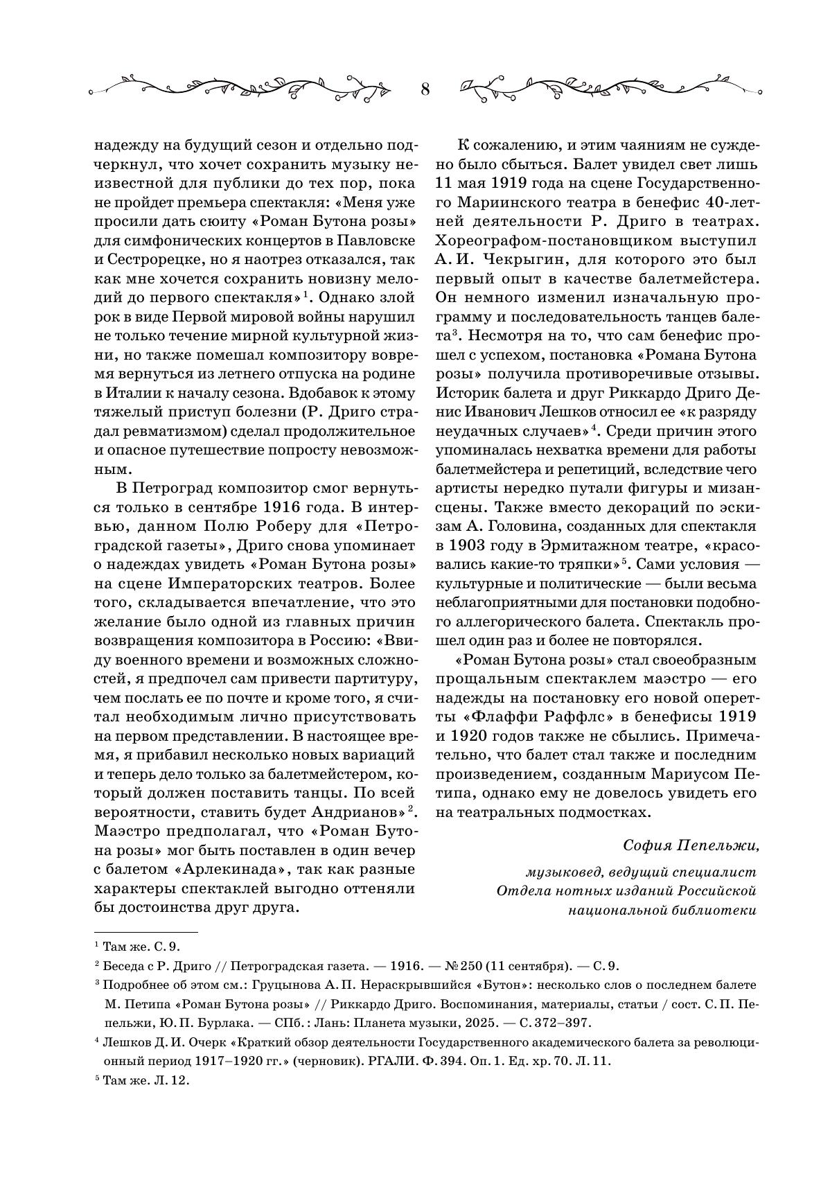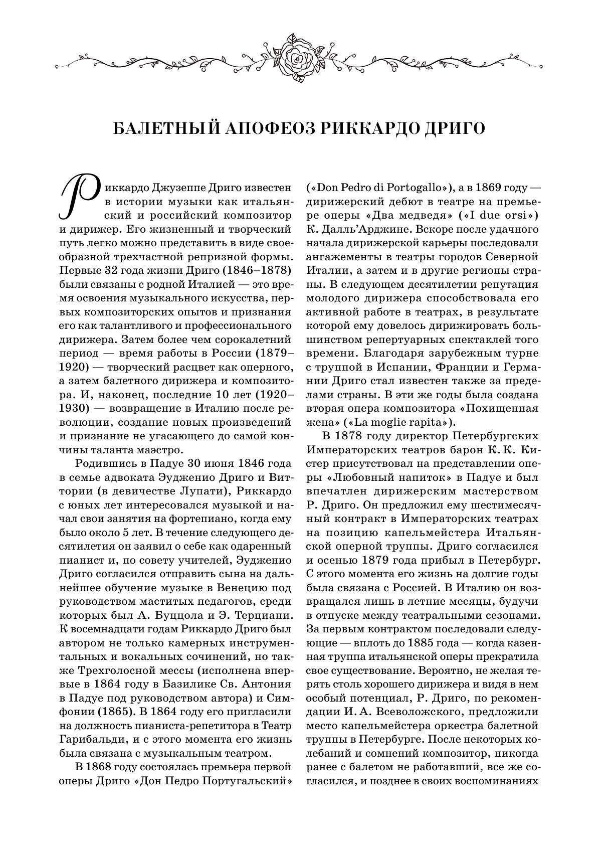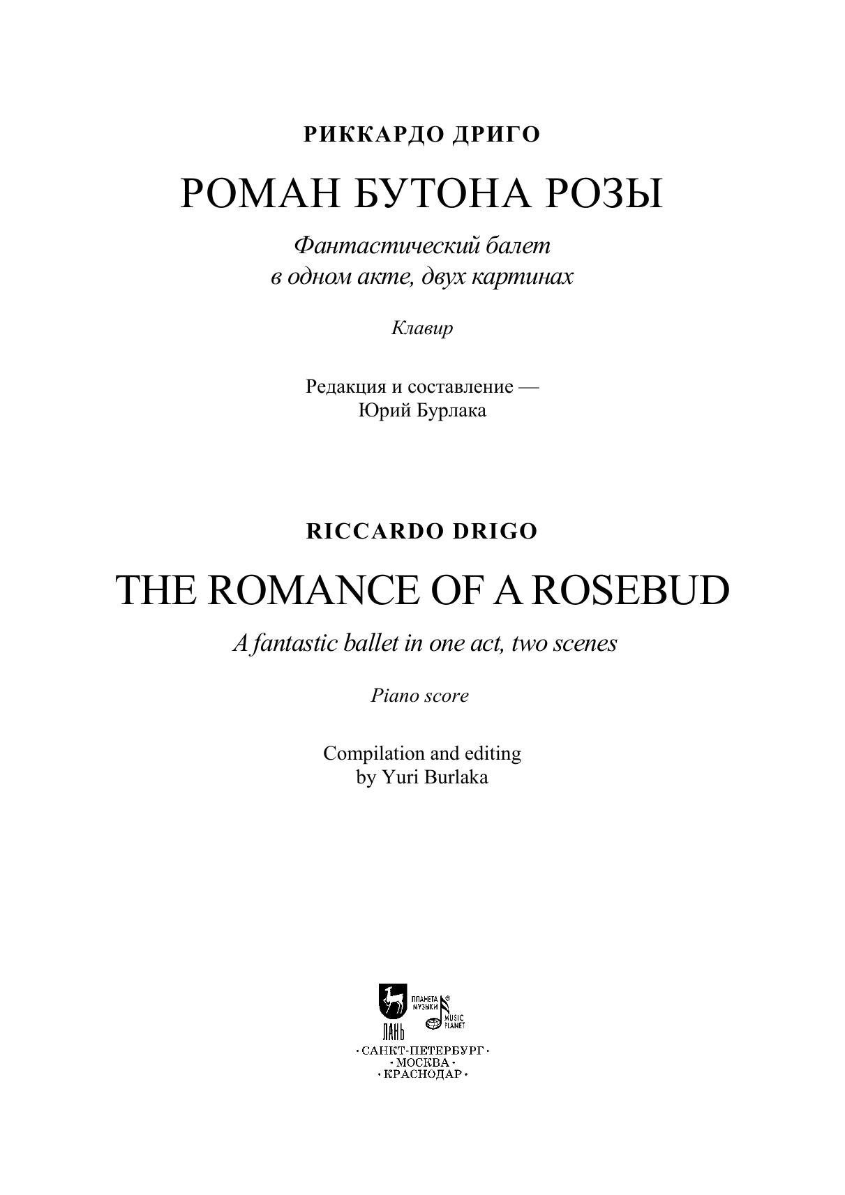 Впервые предлагается издание клавира балета Риккардо Дриго «Роман Бутона розы». Балет в 1904 году готовился Мариусом Петипа для постановки в Эрмитажном театре, но так и не был показан зрителям, и современная публикация фортепианного переложения, сделанного самим композитором – редчайшая возможность познакомиться с музыкой неосуществленного спектакля. Клавир дополнен текстом либретто, сочиненным Иваном Александровичем Всеволожским и Мариусом Петипа, а также научными статьями, посвященными жизни и творчеству Дриго, истории создания балета и особенностям его музыкальной драматургии. Издание будет полезно хореографам и балетмейстерам-реставраторам, концертмейстерам балета, педагогам и учащимся хореографических учебных заведений, балетоведам, культуроведам и музыковедам, изучающим историю балета и балетной музыки, а также всем любителям балетного театра. This is the first edition of a piano score of The Romance of a Rosebud, the ballet by Riccardo Drigo. The ballet was choreographed by Marius Petipa in 1904 for production at the Hermitage Theatre, but was never shown to the audience, and the current publication of the piano transcription made by the composer himself is a rare opportunity to get acquainted with the music of a lost performance. The piano score is supplemented with the libretto written by Ivan Aleksandrovich Vsevolozhsky and Marius Petipa, as well as the researches’ articles devoted to the life and work of Drigo, the history of the ballet creation the features of its music dramaturgy. The edition will be useful to choreographers and ballet restorers, ballet accompanists, teachers and students of choreographic schools, ballet experts, culture experts and musicologists studying the ballet history and ballet music history, as well as all admirers of ballet theatre.