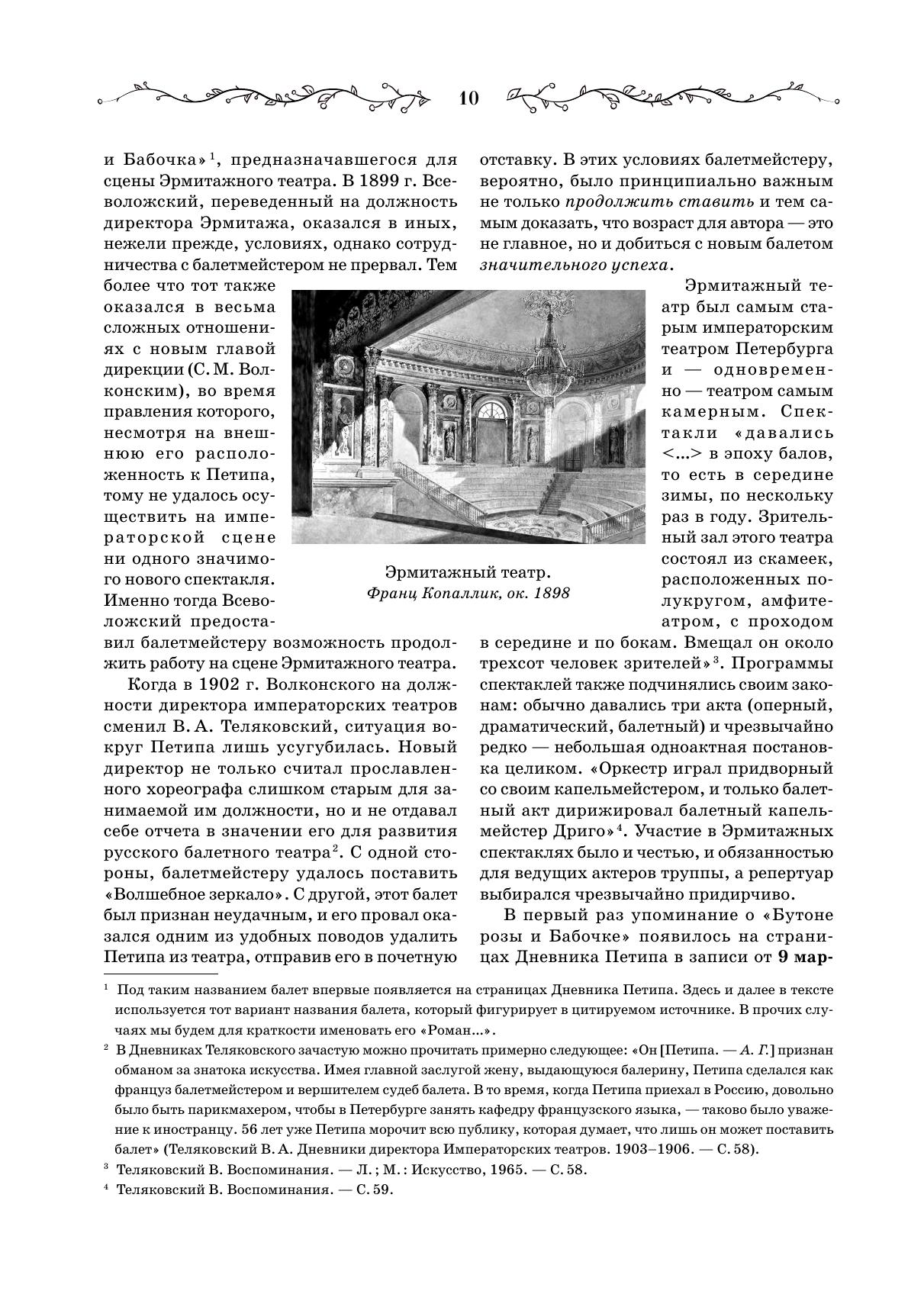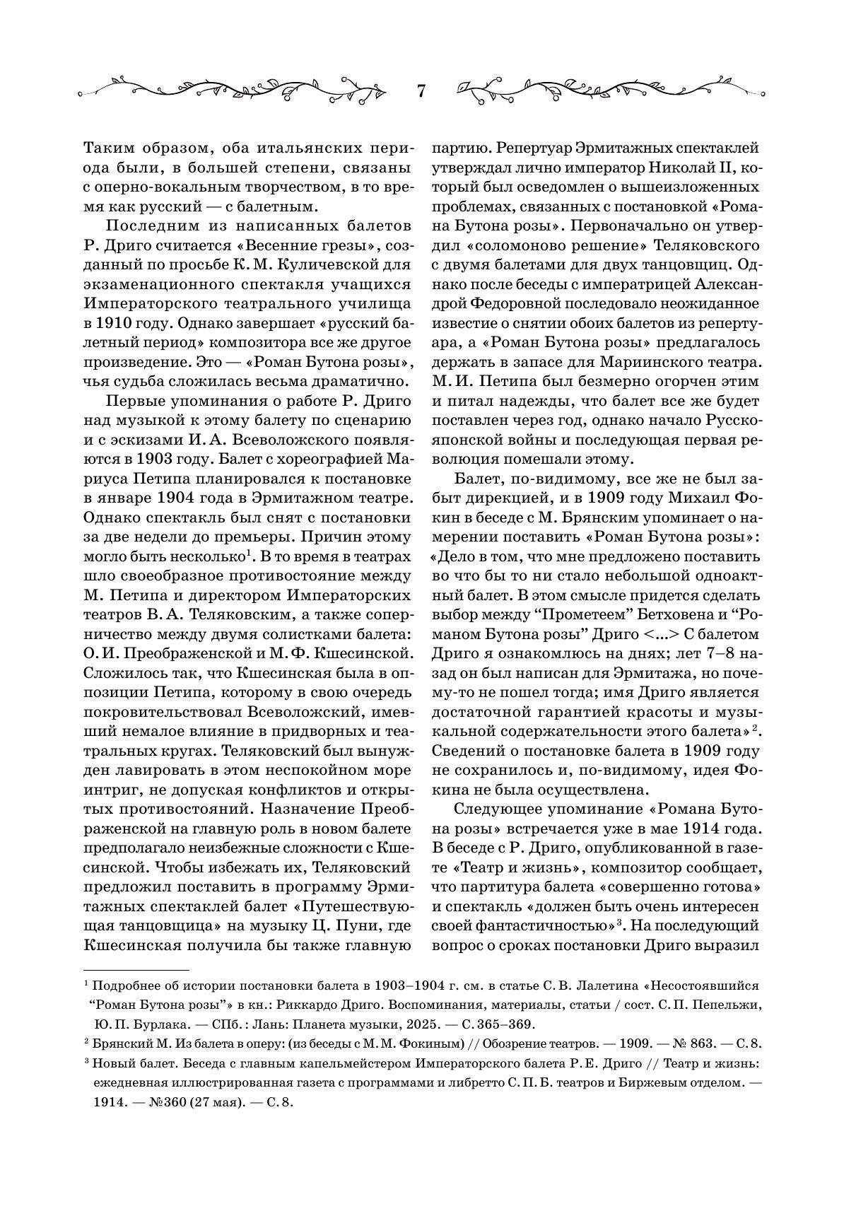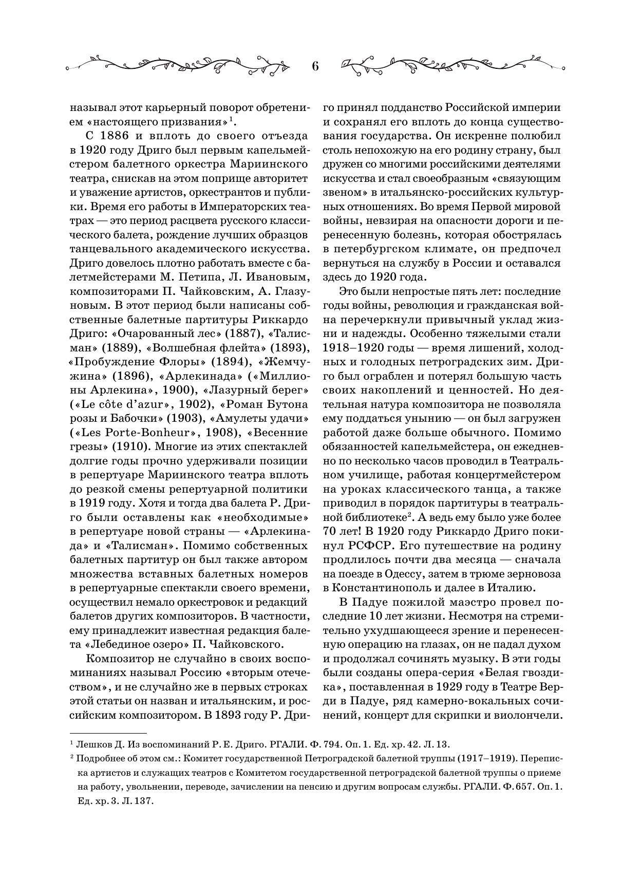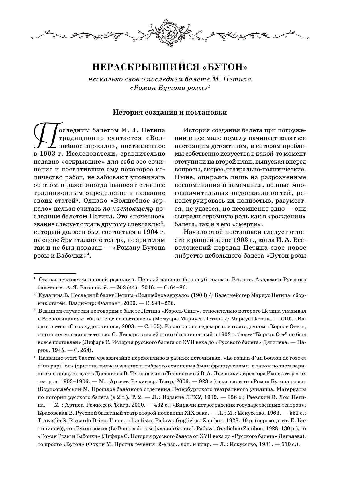 Впервые предлагается издание клавира балета Риккардо Дриго «Роман Бутона розы». Балет в 1904 году готовился Мариусом Петипа для постановки в Эрмитажном театре, но так и не был показан зрителям, и современная публикация фортепианного переложения, сделанного самим композитором – редчайшая возможность познакомиться с музыкой неосуществленного спектакля. Клавир дополнен текстом либретто, сочиненным Иваном Александровичем Всеволожским и Мариусом Петипа, а также научными статьями, посвященными жизни и творчеству Дриго, истории создания балета и особенностям его музыкальной драматургии. Издание будет полезно хореографам и балетмейстерам-реставраторам, концертмейстерам балета, педагогам и учащимся хореографических учебных заведений, балетоведам, культуроведам и музыковедам, изучающим историю балета и балетной музыки, а также всем любителям балетного театра. This is the first edition of a piano score of The Romance of a Rosebud, the ballet by Riccardo Drigo. The ballet was choreographed by Marius Petipa in 1904 for production at the Hermitage Theatre, but was never shown to the audience, and the current publication of the piano transcription made by the composer himself is a rare opportunity to get acquainted with the music of a lost performance. The piano score is supplemented with the libretto written by Ivan Aleksandrovich Vsevolozhsky and Marius Petipa, as well as the researches’ articles devoted to the life and work of Drigo, the history of the ballet creation the features of its music dramaturgy. The edition will be useful to choreographers and ballet restorers, ballet accompanists, teachers and students of choreographic schools, ballet experts, culture experts and musicologists studying the ballet history and ballet music history, as well as all admirers of ballet theatre.