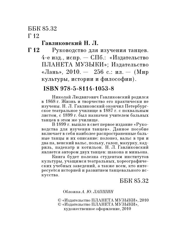 Николай Людвигович Гавликовский родился в 1868 г. Жизнь и творчество его практически не изучены. Н.Л. Гавликовский окончил Петербургское театральное училище в 1887 г. с похвальным листом, с 1899 г. был назначен учителем бальных танцев в этом же училище. В 1899 г. вышло в свет первое издание «Руководства для изучения танцев». Данное пособие включает в себя наиболее распространенные бальные танцы и их описание: полонез, вальс в три и два па, венский вальс, польку, галоп, мазурку, кадриль, падекатр и котильон. Н.Л. Гавликовский является автором двух танцев: шакона и миньона. Книга будет полезна студентам институтов культуры, учащимся театральных, хореографических учебных заведений, а также всем, кто интересуется историей и развитием танцевального искусства.