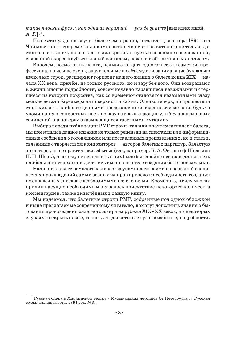 В данной книге впервые собраны все материалы о танце и балетном театре, публиковавшиеся в течение двадцати пяти лет (с 1894 по 1918 год) на страницах «Русской музыкальной газеты» (РМГ). Будучи изданием, в первую очередь посвящённым музыкальному искусству, РМГ постоянно оказывалась вне области внимания балетоведов, традиционно обращавшихся к театральной критике указанного времени. Теперь, благодаря публикующимся материалам, читатели могут вновь открыть для себя названия и подробности конкретных постановок, забытые имена композиторов, писавших балетные партитуры, проследить интерес, сопутствовавший тому или иному театральному явлению.