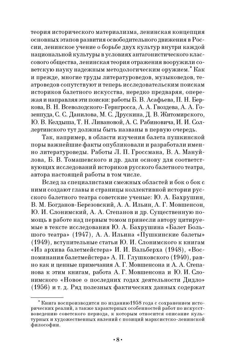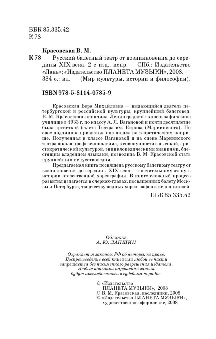 Красовская Вера Михайловна — выдающийся деятель петербургской и российской культуры, крупнейший балетовед. В. М. Красовская окончила Ленинградское хореографическое училище в 1933 г. по классу А.Я. Вагановой и почти десятилетие была артисткой балета Театра им. Кирова (Мариинского). Но свое подлинное призвание она нашла на теоретическом поприще. Полученная в классе Вагановой и на сцене Мариинского театра школа профессионализма, в совокупности с высокой, аристократической культурой, энциклопедическими знаниями, блестящим владением языками, позволила В.М. Красовской стать крупнейшим искусствоведом. Предлагаемая книга посвящена русскому балетному театру от возникновения до середины XIX века — значительному этапу в истории отечественной хореографии. В книге сложный процесс развития излагается в очерках-главах, посвященных балету Москвы и Петербурга, творчеству видных хореографов и исполнителей.