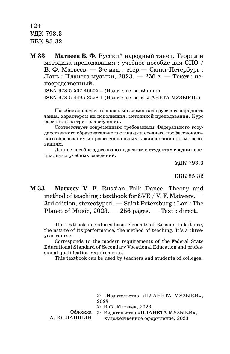Пособие знакомит с основными элементами русского народного танца, характером их исполнения, методикой преподавания. Курс рассчитан на три года обучения. Соответствует современным требованиям Федерального государственного образовательного стандарта среднего профессионального образования и профессиональным квалификационным требованиям. Данное пособие адресовано педагогам и студентам средних специальных учебных заведений. The textbook introduces basic elements of Russian folk dance, the nature of its performance, the method of teaching. It’s a three-year course. Corresponds to the modern requirements of the Federal State Educational Standard of Secondary Vocational Education and professional qualification requirements. This textbook can be used by teachers and students of colleges.