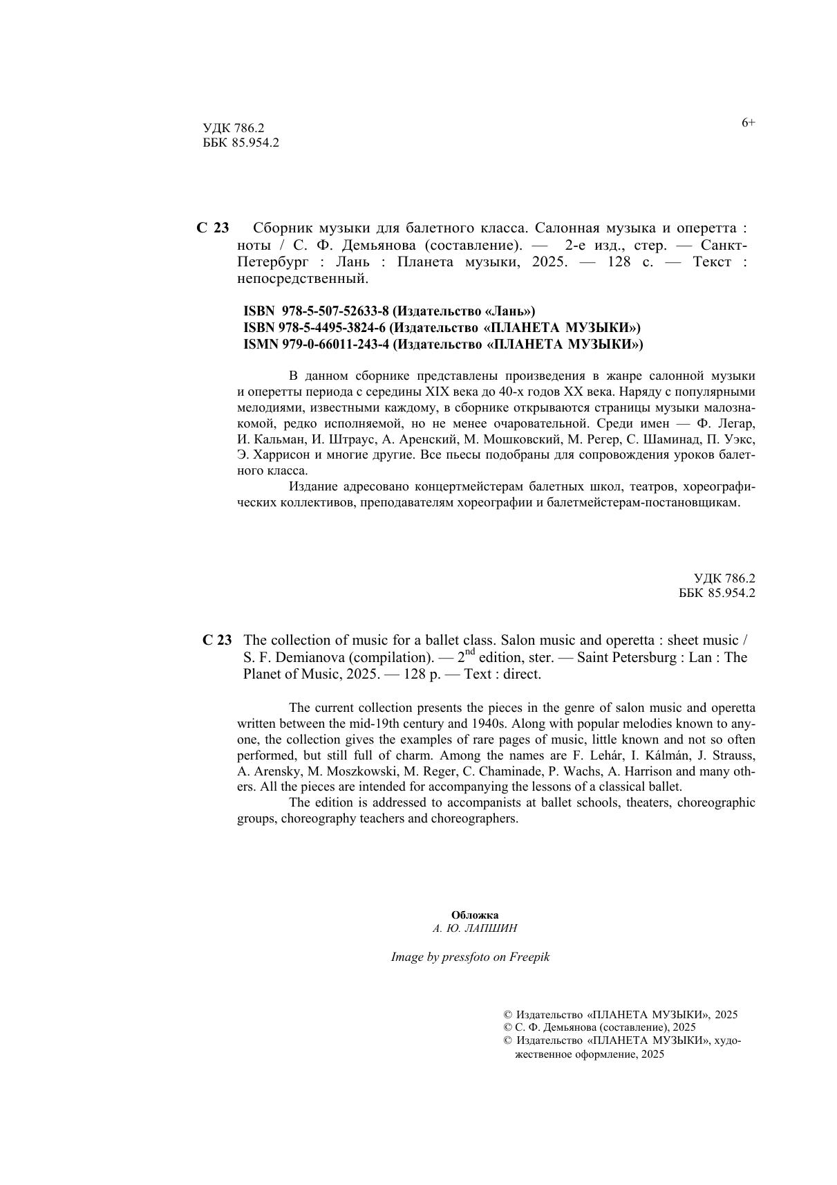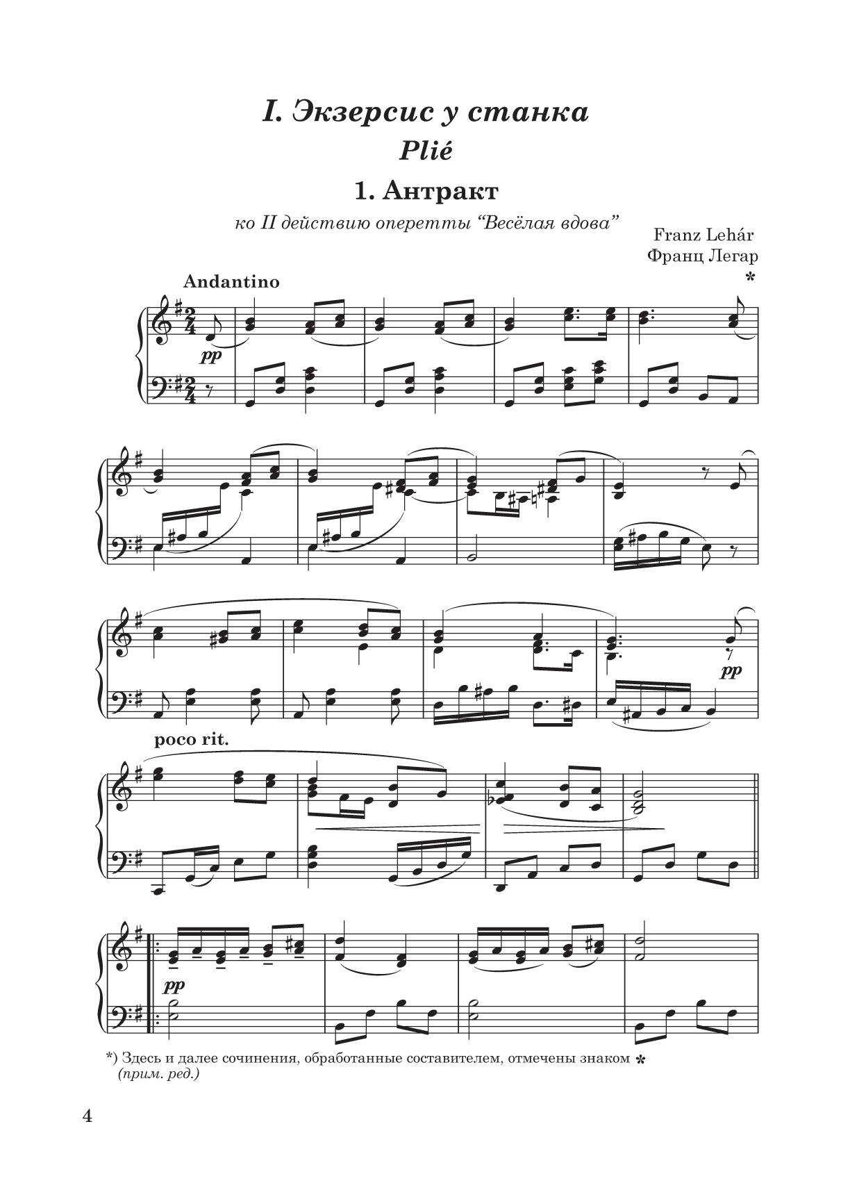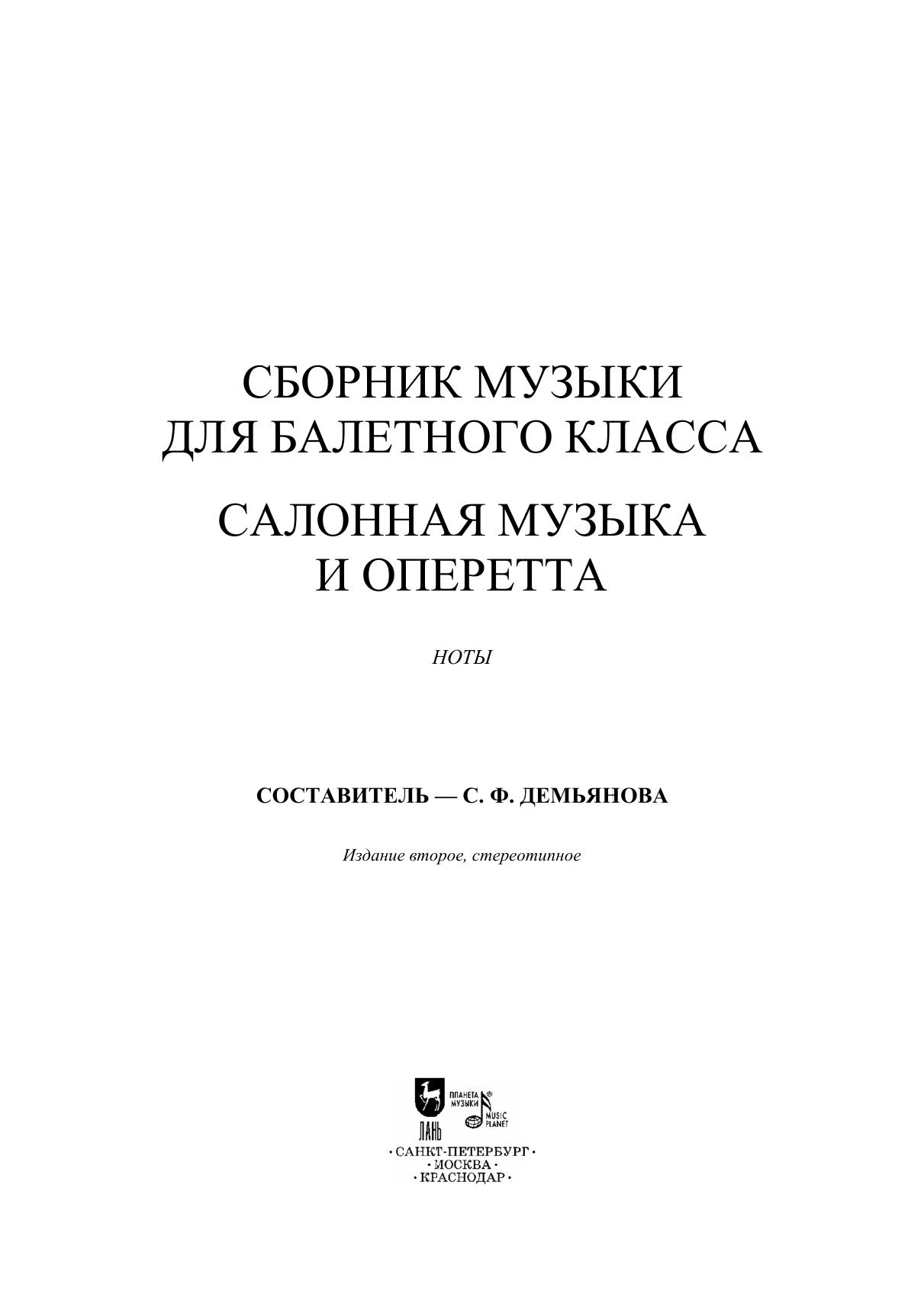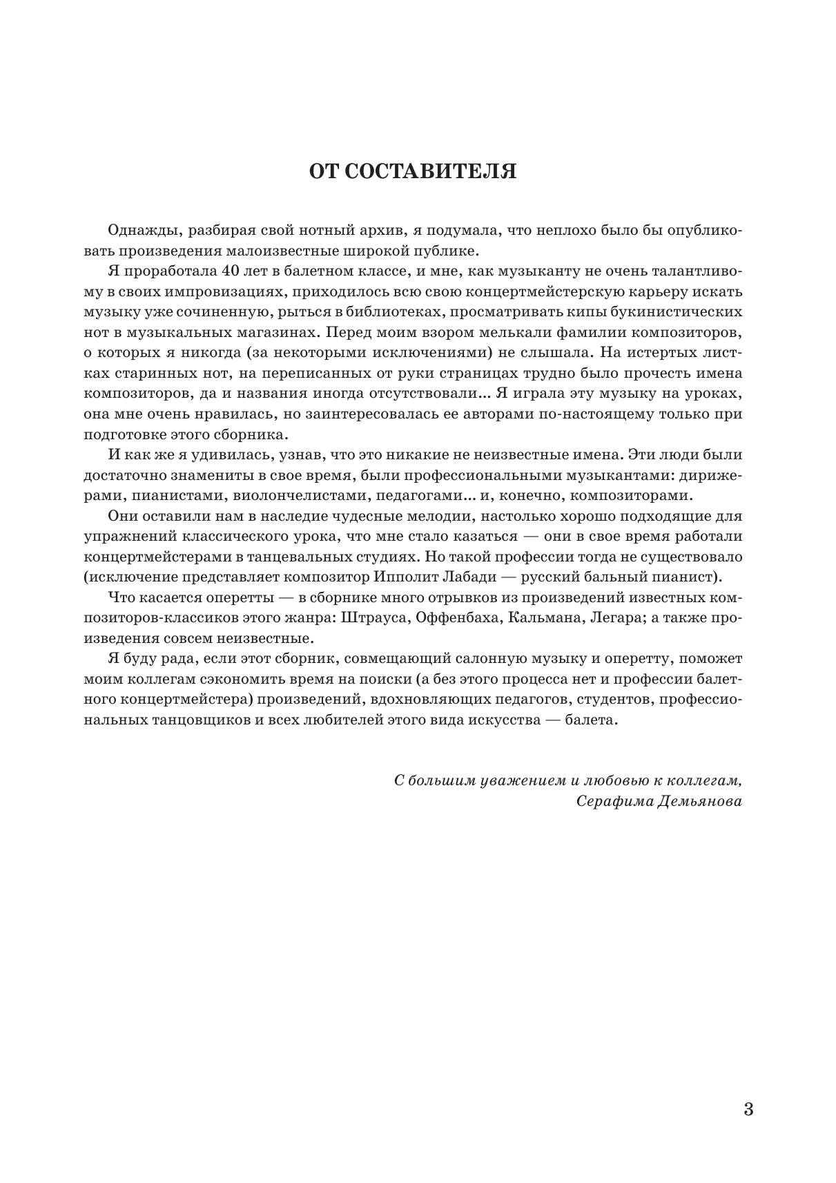 В данном сборнике представлены произведения в жанре салонной музыки и оперетты периода с середины XIX века до 40-х годов XX. Наряду с популярными мелодиями известными каждому, в сборнике открываются страницы музыки малознакомой, редко исполняемой, но не менее очаровательной. Среди имен – Ф. Легар, И. Кальман, И. Штраус, А. Аренский, М. Мошковский, М. Регер, С. Шаминад, П. Уэкс, Э. Харрисон и многие другие. Все пьесы подобраны для сопровождения уроков балетного класса. Издание адресовано концертмейстерам балетных школ, театров, хореографических коллективов, преподавателям хореографии и балетмейстерам-постановщикам. The current collection presents the pieces in the genre of salon music and operetta written between the mid-19th century and 1940s. Along with popular melodies known to anyone, the collection gives the examples of rare pages of music, little known and not so often performed, but still full of charm. Among the names are F. Lehár, I. Kálmán, J. Strauss, A. Arensky, M. Moszkowski, M. Reger, C. Chaminade, P. Wachs, A. Harrison and many others. All the pieces are intended for accompanying the lessons of a classical ballet. The edition is addressed to accompanists at ballet schools, theaters, choreographic groups, choreography teachers and choreographers.