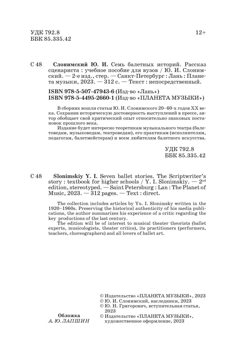 В сборник вошли статьи Ю.И. Слонимского 20-60-х годов XX века. Сохранив историческую достоверность выступлений в прессе, автор обобщает свой критический опыт относительно знаковых постановок прошлого века. Издание будет интересно теоретикам музыкального театра (балетоведам, музыковедам, театроведам), его практикам (исполнителям, педагогам, балетмейстерам) и всем любителям балетного искусства. The collection includes articles by Yu. I. Slonimsky written in the 1920–1960s. Preserving the historical authenticity of his media publications, the author summarizes his experience of a critic regarding the key productions of the last century. The edition will be of interest to musical theater theorists (ballet experts, musicologists, theater critics), its practitioners (performers, teachers, choreographers) and all lovers of ballet art.