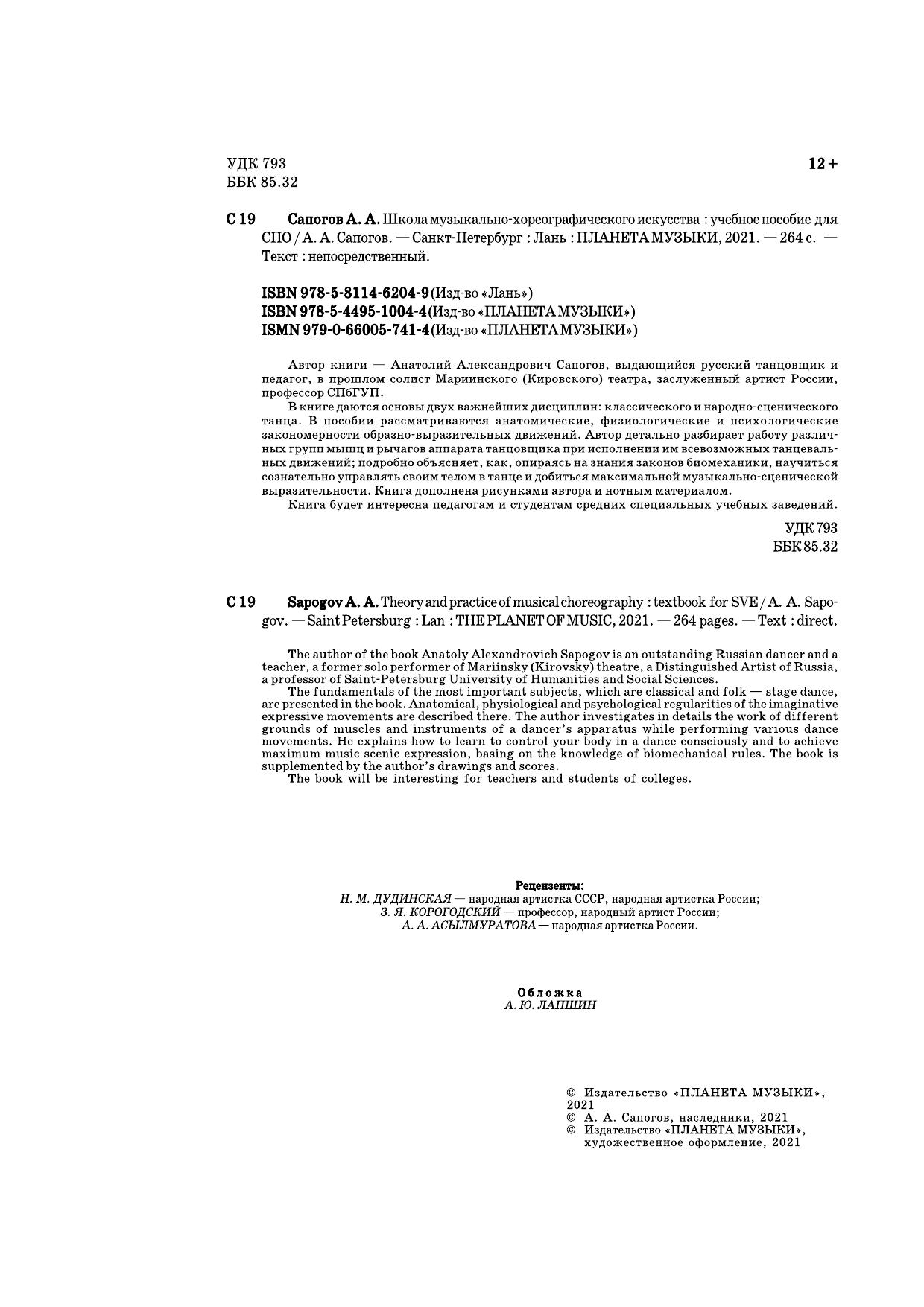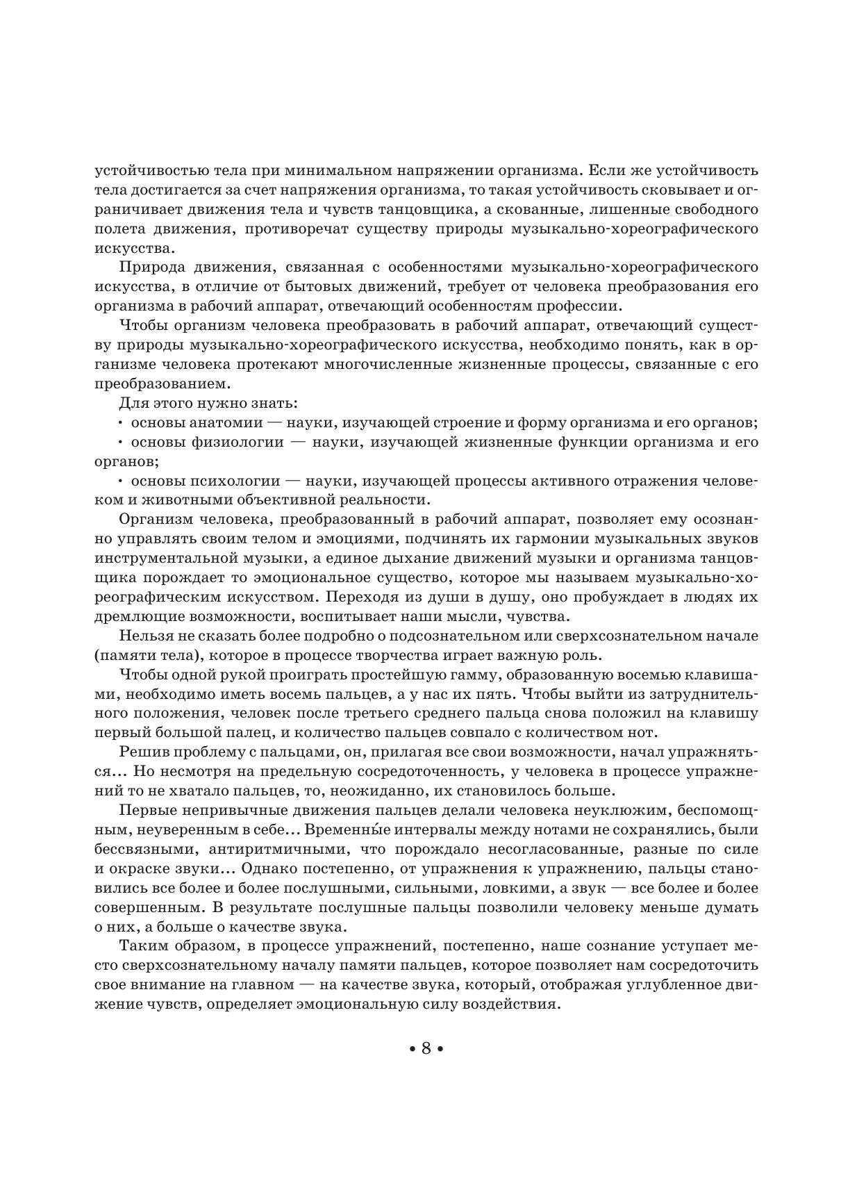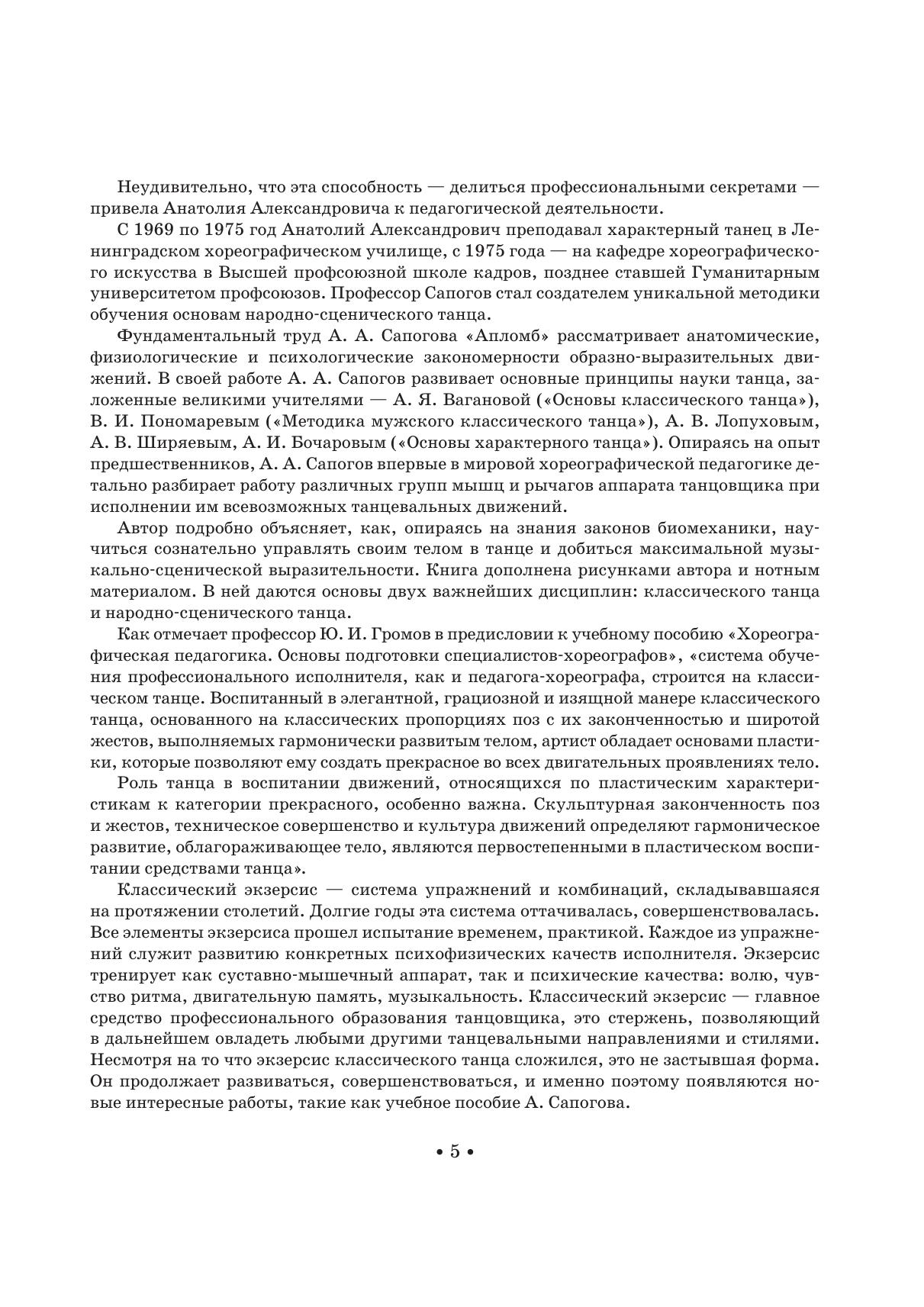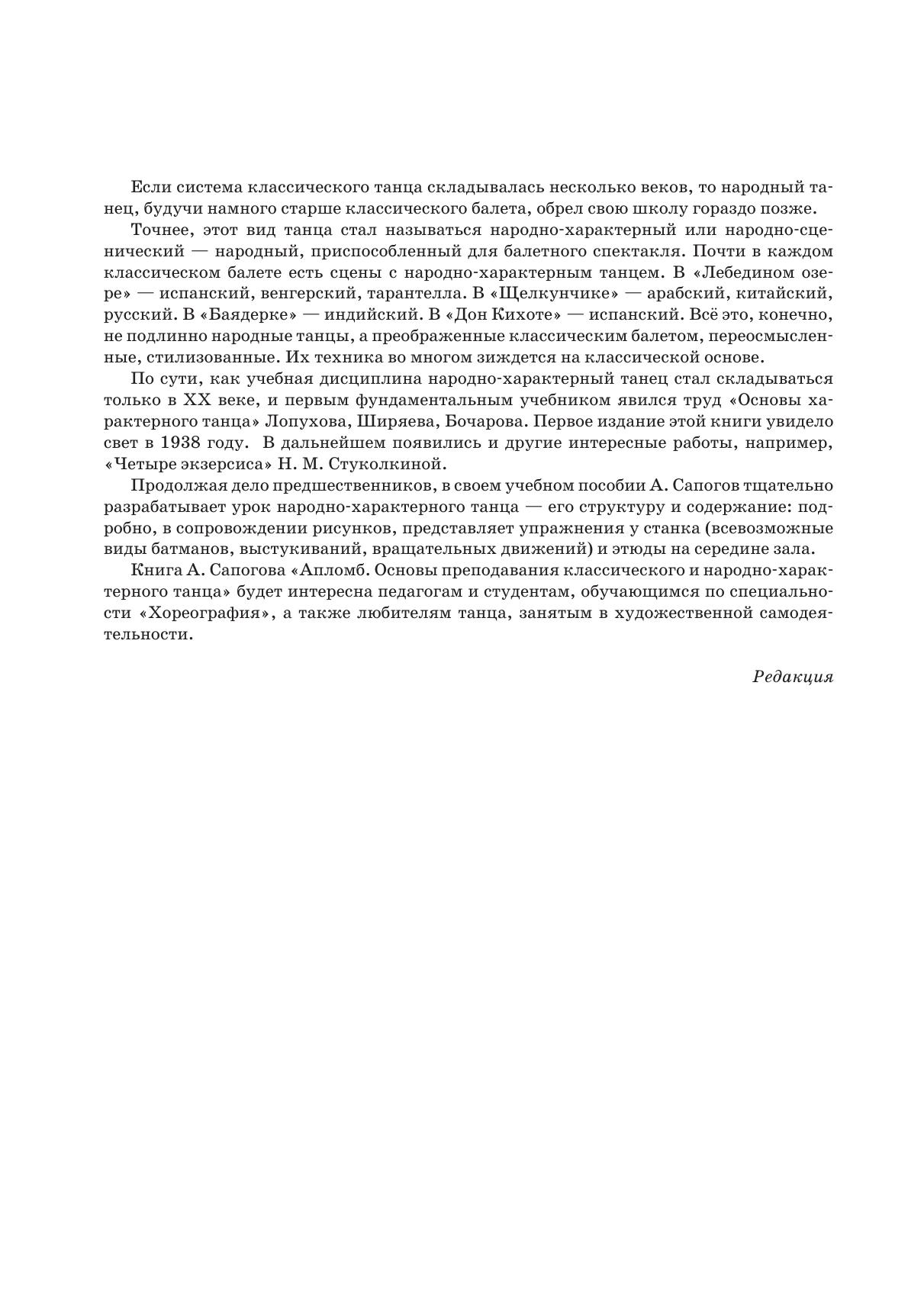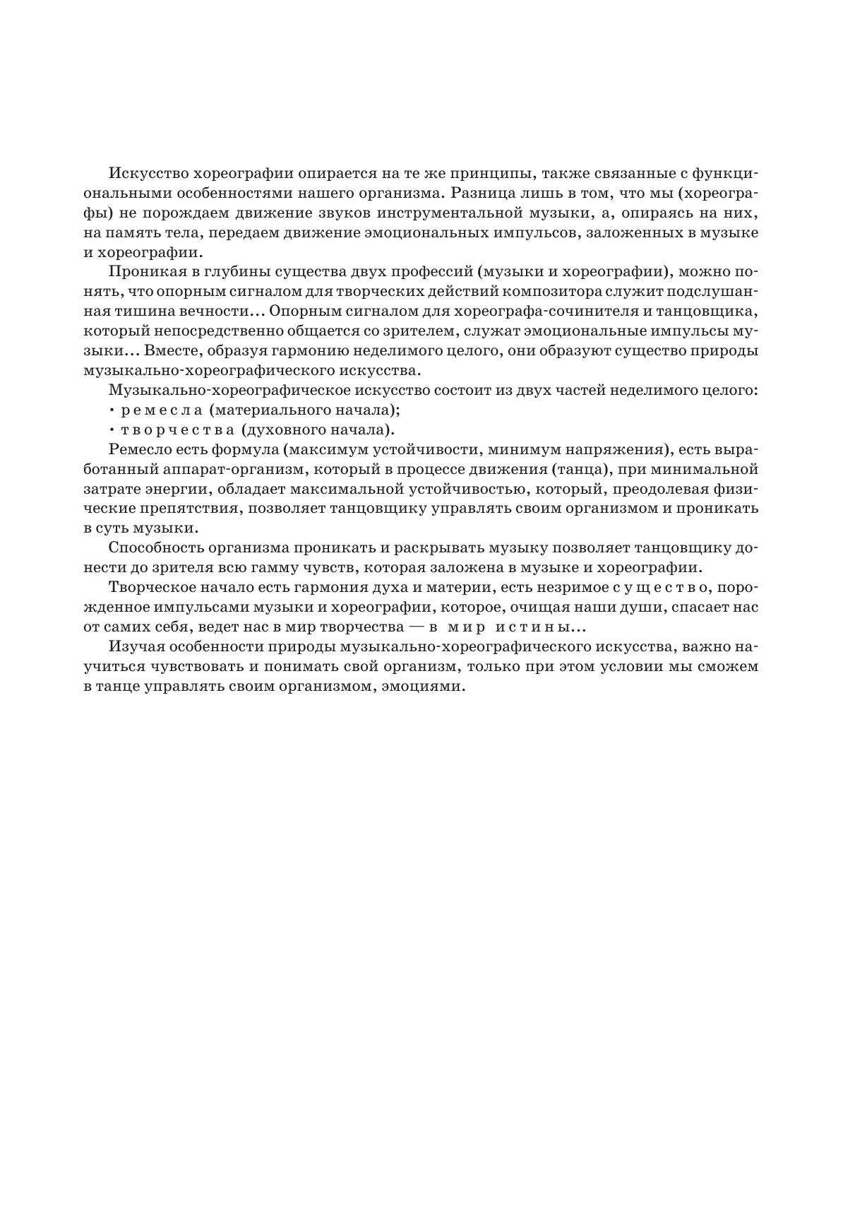 Автор книги — Анатолий Александрович Сапогов, выдающийся русский танцовщик и педагог, в прошлом солист Мариинского (Кировского) театра, заслуженный артист России, профессор СПбГУП. В книге даются основы двух важнейших дисциплин: классического и народно-сценического танца. В пособии рассматриваются анатомические, физиологические и психологические закономерности образно-выразительных движений. Автор детально разбирает работу различ-ных групп мышц и рычагов аппарата танцовщика при исполнении им всевозможных танцеваль-ных движений; подробно объясняет, как, опираясь на знания законов биомеханики, научиться сознательно управлять своим телом в танце и добиться максимальной музыкально-сценической выразительности. Книга дополнена рисунками автора и нотным материалом. Книга будет интересна педагогам и студентам средних специальных учебных заведений.