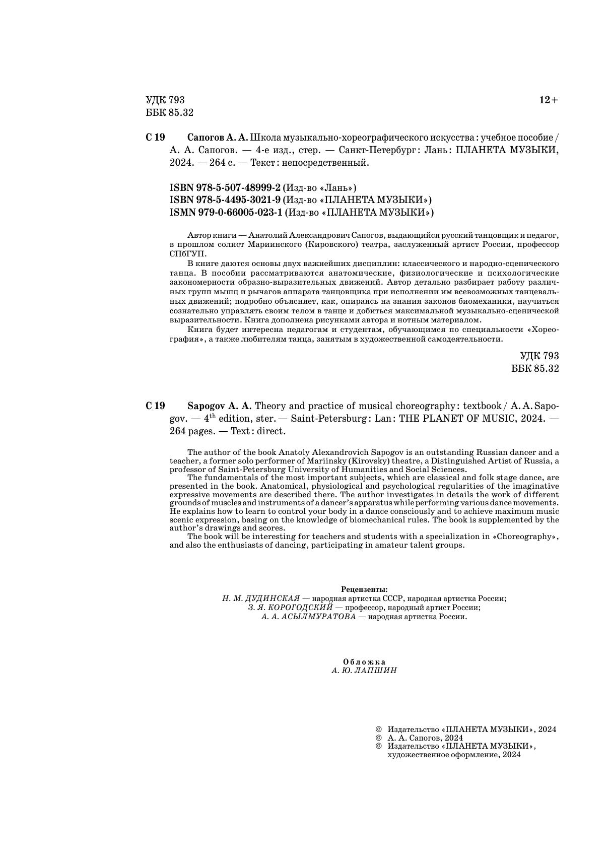 Автор книги — Анатолий Александрович Сапогов, выдающийся русский танцовщик и педагог, в прошлом солист Мариинского (Кировского) театра, Заслуженный артист России, профессор СПбГУП. В книге даются основы двух важнейших дисциплин: классического танца и народно-сценического танца. Работа рассматривает анатомические, физиологические и психологические закономерности образно-выразительных движений. Автор детально разбирает работу различных групп мышц и рычагов аппарата танцовщика при исполнении им всевозможных танцевальных движений, подробно объясняет, как, опираясь на знания законов биомеханики, научиться сознательно управлять своим телом в танце и добиться максимальной музыкально-сценической выразительности. Книга дополнена рисунками автора и нотным материалом. Книга будет интересна педагогам и студентам, обучающимся по специальности «Хореография», а также любителям танца, занятым в художественной самодеятельности.