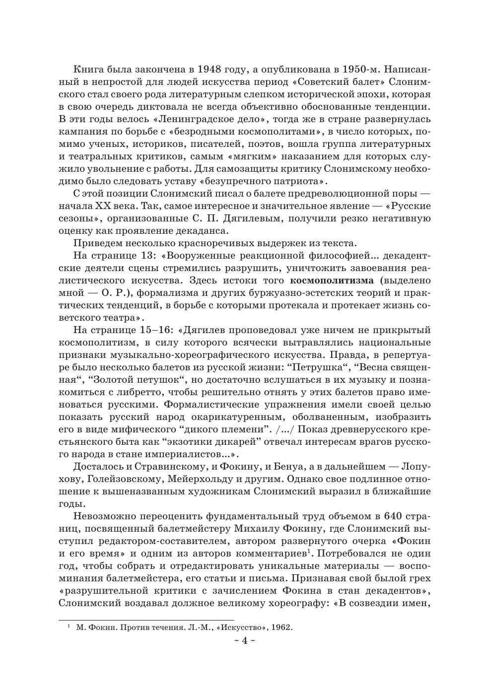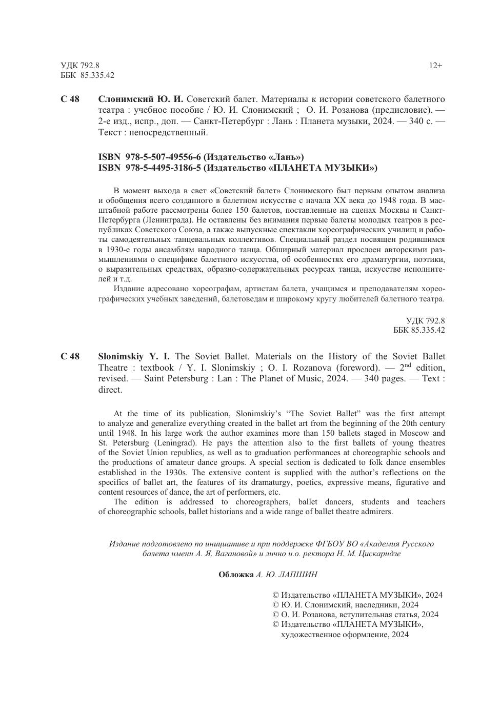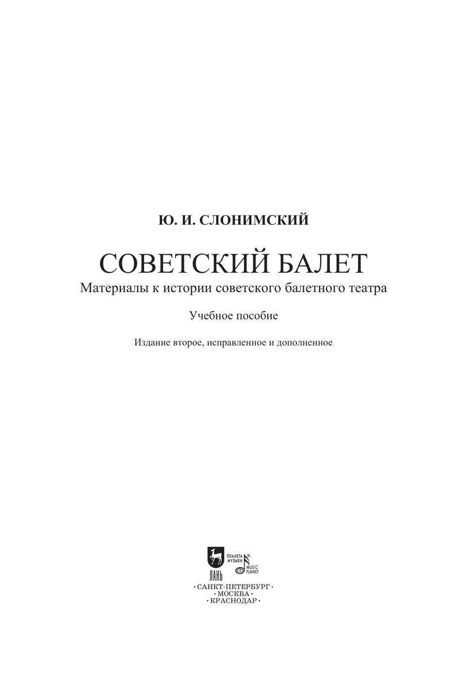 В момент выхода в свет «Советский балет» Слонимского был первым опытом анализа и обобщения всего созданного в балетном искусстве с начала ХХ века до 1948 года. В масштабной работе рассмотрены более 150 балетов, поставленные на сценах Москвы и Санкт-Петербурга (Ленинграда). Не оставлены без внимания первые балеты молодых театров в республиках Советского Союза, а также выпускные спектакли хореографических училищ и работы самодеятельных танцевальных коллективов. Специальный раздел посвящен родившимся в 1930-е годы ансамблям народного танца. Обширный материал прослоен авторскими размышлениями о специфике балетного искусства, об особенностях его драматургии, поэтики, о выразительных средствах, образно-содержательных ресурсах танца, искусстве исполнителей и т.д. Издание адресовано хореографам, артистам балета, учащимся и преподавателям хореографических учебных заведений, балетоведам и широкому кругу любителей балетного театра. At the time of its publication, Slonimskiy’s “The Soviet Ballet” was the first attempt to analyze and generalize everything created in the ballet art from the beginning of the 20th century until 1948. In his large work the author examines more than 150 ballets staged in Moscow and St. Petersburg (Leningrad). He pays the attention also to the first ballets of young theatres of the Soviet Union republics, as well as to graduation performances at choreographic schools and the productions of amateur dance groups. A special section is dedicated to folk dance ensembles established in the 1930s. The extensive content is supplied with the author’s reflections on the specifics of ballet art, the features of its dramaturgy, poetics, expressive means, figurative and content resources of dance, the art of performers, etc. The edition is addressed to choreographers, ballet dancers, students and teachers of choreographic schools, ballet historians and a wide range of ballet theatre admirers.