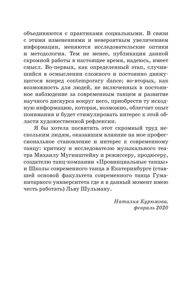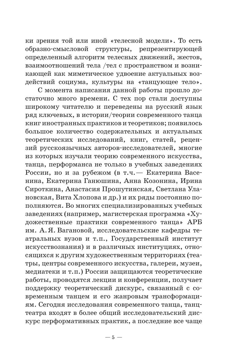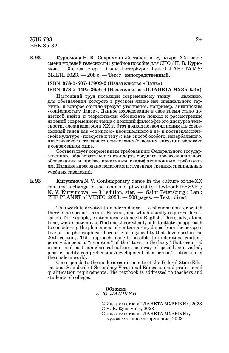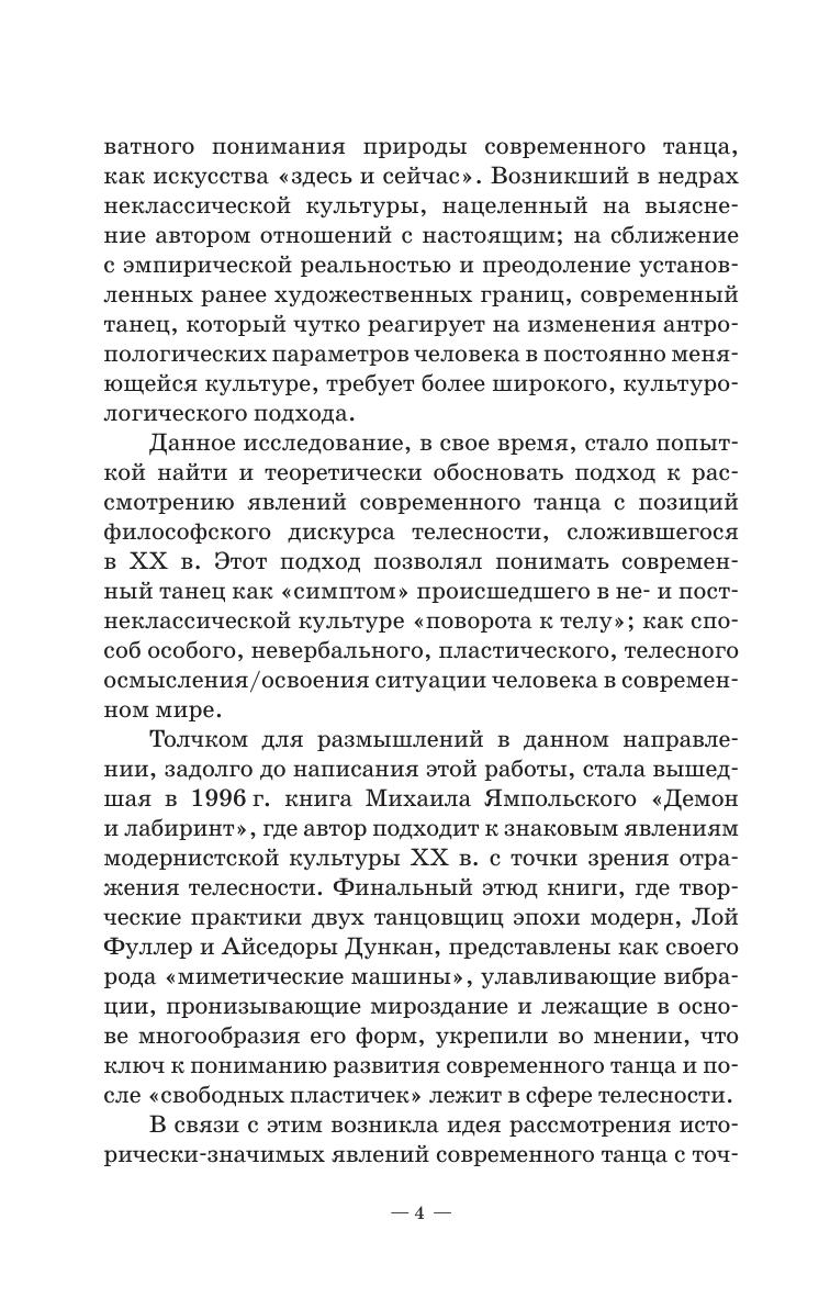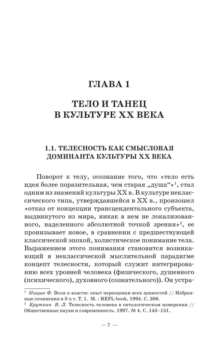 Настоящий труд посвящен современному танцу — явлению, для обозначения которого в русском языке нет специального термина, и которое обычно требует уточнения, например, английским «contemporary dance». Данное исследование, в свое время, стало попыткой найти и теоретически обосновать подход к рассмотрению явлений современного танца с позиций философского дискурса телесности, сложившегося в XX в. Этот подход позволял понимать современный танец как «симптом» происшедшего в не- и постнеклассической культуре «поворота к телу», как способ особого, невербального, пластического, телесного осмысления/освоения ситуации человека в современном мире. Соответствует современным требованиям Федерального государственного образовательного стандарта среднего профессионального образования и профессиональным квалификационным требованиям. Учебное пособие адресовано педагогам и студентам средних специальных учебных заведений. This work is devoted to modern dance – a phenomenon for which there is no special term in Russian, and which usually requires clarification, for example, contemporary dance in English. This study, at one time, was an attempt to find and theoretically substantiate an approach to considering the phenomena of contemporary dance from the perspective of the philosophical discourse of physicality that developed in the 20th century. This approach made it possible to understand contemporary dance as a “symptom” of the “turn to the body” that occurred in non- and post-non-classical culture, as a way of special, non-verbal, plastic, bodily comprehension / development of a person’s situation in the modern world. Corresponds to the modern requirements of the Federal State Educational Standard of Secondary Vocational Education and professional qualification requirements. The textbook is addressed to teachers and students of colleges.