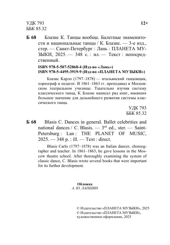 Блазис Kарло (1797-1878) - итальянский танцовщик, хореограф и педагог. В 1861-1863 гг. преподавал в Московском театральном училище. Тщательно изучив систему классического танца, К. Блазис написал ряд книг, имевших большое значение для дальнейшего развития системы классического танца. Blasis Carlo (1797–1878) was an Italian dancer, choreographer and teacher. In 1861–1863, he gave lessons in the Moscow theatre school. After thoroughly examining the system of classic dance, C. Blasis wrote several books that were important for its further development.