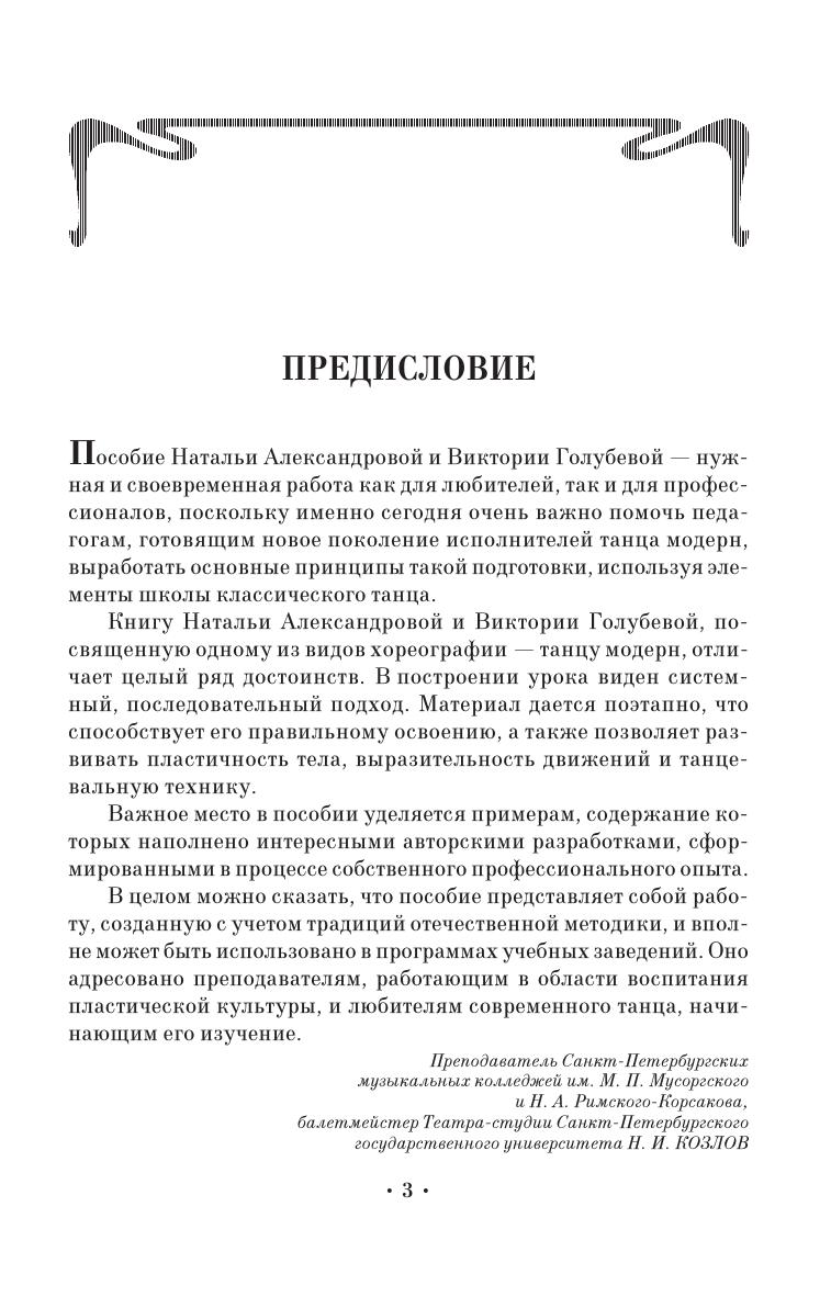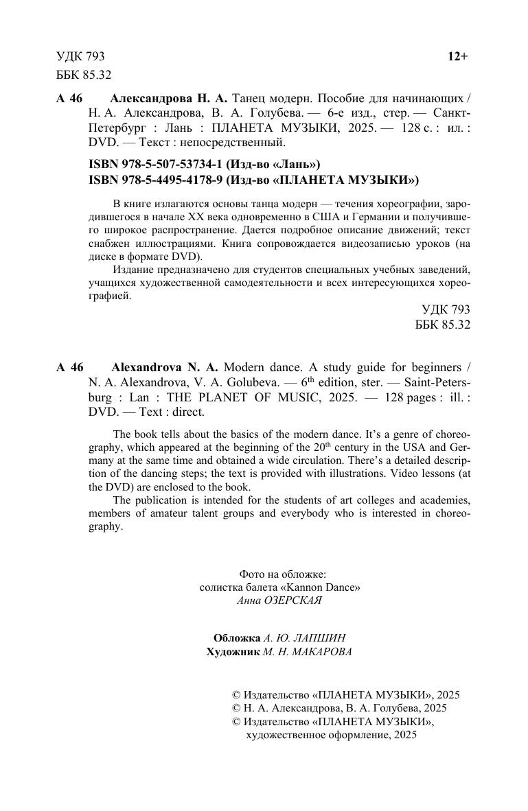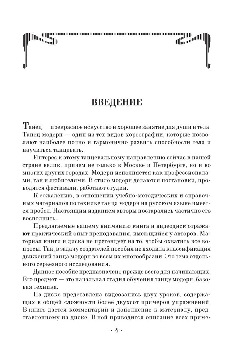 В книге излагаются основы танца модерн — течения хореографии, зародившегося в начале ХХвека одновременно в США и Германии и получившего широкое распространение. Дается подробное описание движений, текст снабжен иллюстрациями. Книга сопровождается видеозаписью уроков (на диске в формате DVD). Издание предназначено для студентов специальных учебных заведений, учащихся художественной самодеятельности и всех интересующихся хореографией. The book tells about the basics of the modern dance. It’s a genre of choreography, which appeared at the beginning of th 20th century in the USA and Germany at the same time and obtained a wide circulation. There’s a detailed description of the dancing steps, the text is provided with illustrations. Video lessons (at the DVD) are enclosed to the book. The publication is intended for the student of art colleges and academies, members of amateur talent groups and everybody who is interested in choreography.