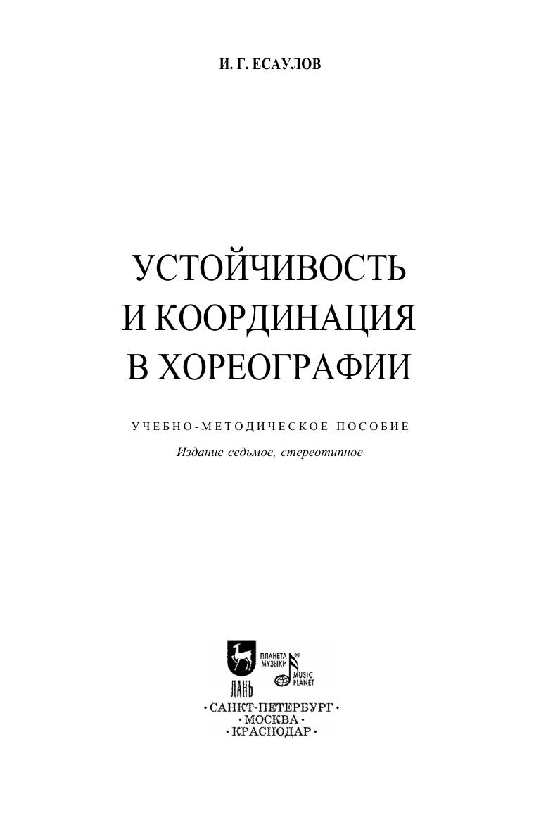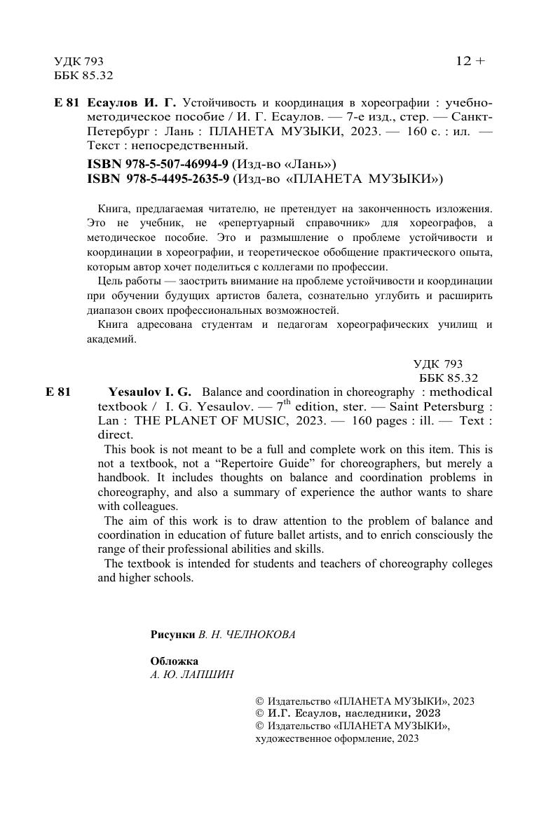 Книга, предлагаемая читателю, не претендует на законченность изложения. Это не учебник, не «репертуарный справочник» для хореографов, а методическое пособие. Это и размышление о проблеме устойчивости и координации в хореографии, и теоретическое обобщение практического опыта, которым автор хочет поделиться с коллегами по профессии. Цель работы – заострить внимание на проблеме устойчивости и координации при обучении будущих артистов балета, сознательно углубить и расширить диапазон своих профессиональных возможностей. Книга адресована студентам и педагогам хореографических училищ и академий. This book is not meant to be a full and complete work on this item. This is not a textbook, not a "Repertoire Guide" for choreographers, but merely a handbook. It includes thoughts on balance and coordination problems in choreography, and also a summary of experience the author wants to share with colleagues. The aim of this work is to draw attention to the problem of balance and coordination in education of future ballet artists, and to enrich consciously the range of their professional abilities and skills. The textbook is intended for students and teachers of choreography colleges and higher schools.
