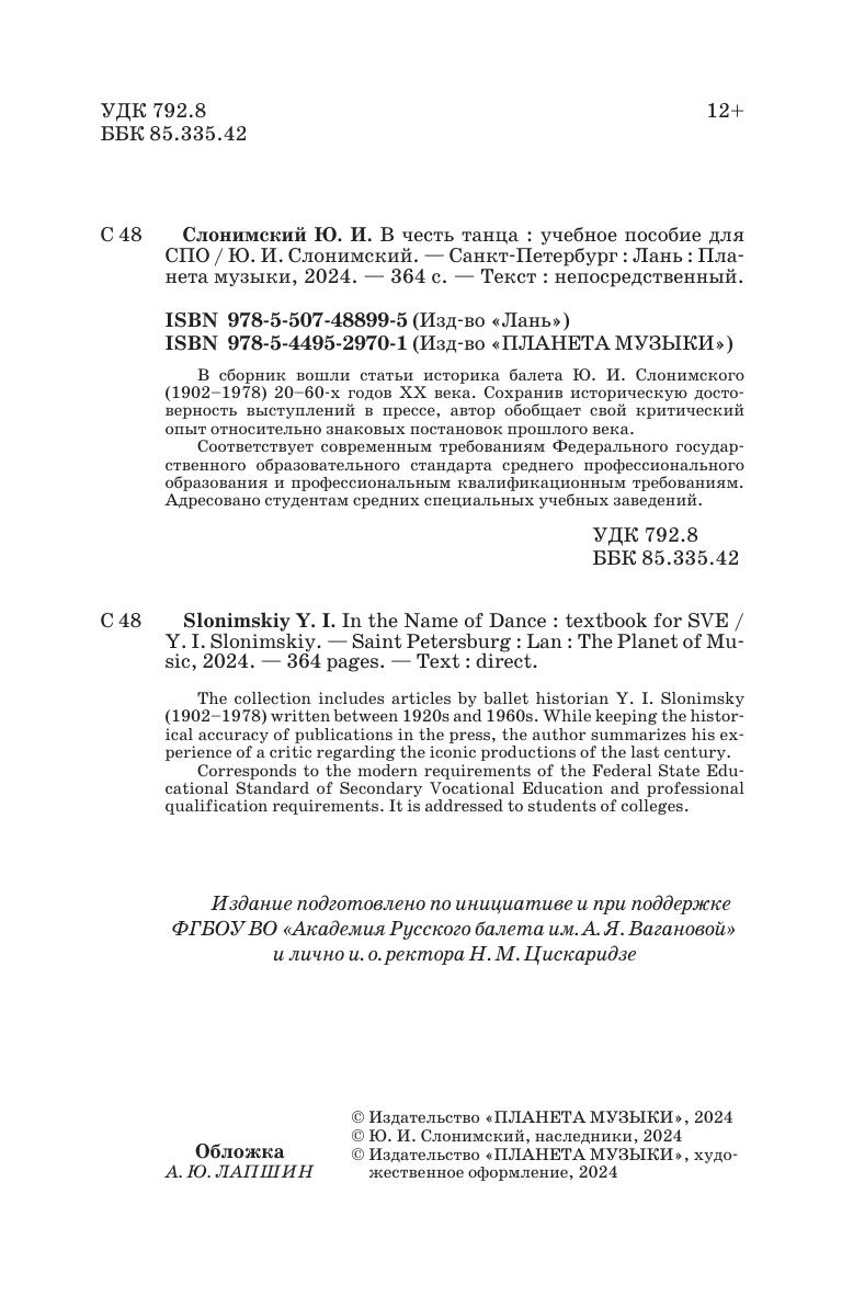 В сборник вошли статьи историка балета Ю. И. Слонимского (1902–1978) 20–60-х годов XX века. Сохранив историческую достоверность выступлений в прессе, автор обобщает свой критический опыт относительно знаковых постановок прошлого века. Соответствует современным требованиям Федерального государственного образовательного стандарта среднего профессионального образования и профессиональным квалификационным требованиям. Адресовано студентам средних специальных учебных заведений. The collection includes articles by ballet historian Y. I. Slonimskiy (1902–1978) written between 1920s and 1960s. While keeping the historical accuracy of publications in the press, the author summarizes his experience of a critic regarding the iconic productions of the last century. Corresponds to the modern requirements of the Federal State Educational Standard of Secondary Vocational Education and professional qualification requirements. It is addressed to students of colleges.