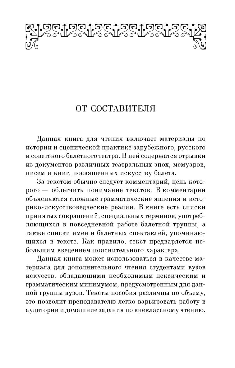 Данная книга для чтения включает материалы по истории и сценической практике зарубежного, русского и советского балетного театра. В ней содержатся отрывки из документов различных театральных эпох, мемуаров, писем и книг, посвященных искусству балета. Тексты снабжены комментариями.