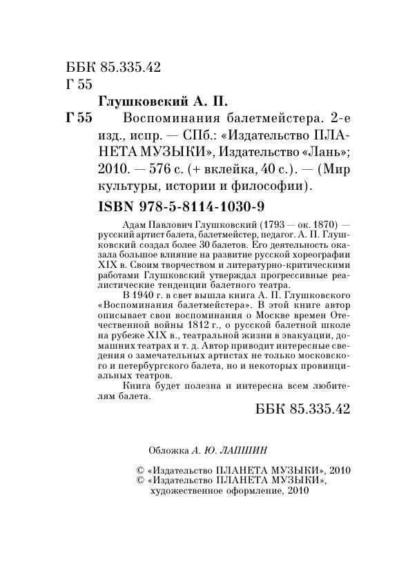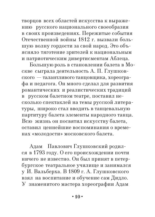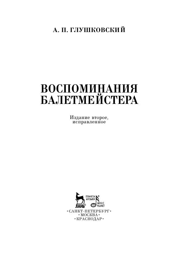 Адам Павлович Глушковский (1793 — ок. 1870) — русский артист балета, балетмейстер, педагог. А.П. Глушковский создал более 30 балетов. Его деятельность оказала большое влияние на развитие русской хореографии XIX в. Своим творчеством и литературно-критическими работами Глушковский утверждал прогрессивные реалистические тенденции балетного театра. В 1940 г. в свет вышла книга А.П. Глушковского «Воспоминания балетмейстера». В этой книге автор описывает свои воспоминания о Москве времен Отечественной войны 1812 г., о русской балетной школе на рубеже XIX в., театральной жизни в эвакуации, домашних театрах и т. д. Автор приводит интересные сведения о замечательных артистах не только московского и петербургского балета, но и некоторых провинциальных театров. Книга будет полезна и интересна всем любителям балета.