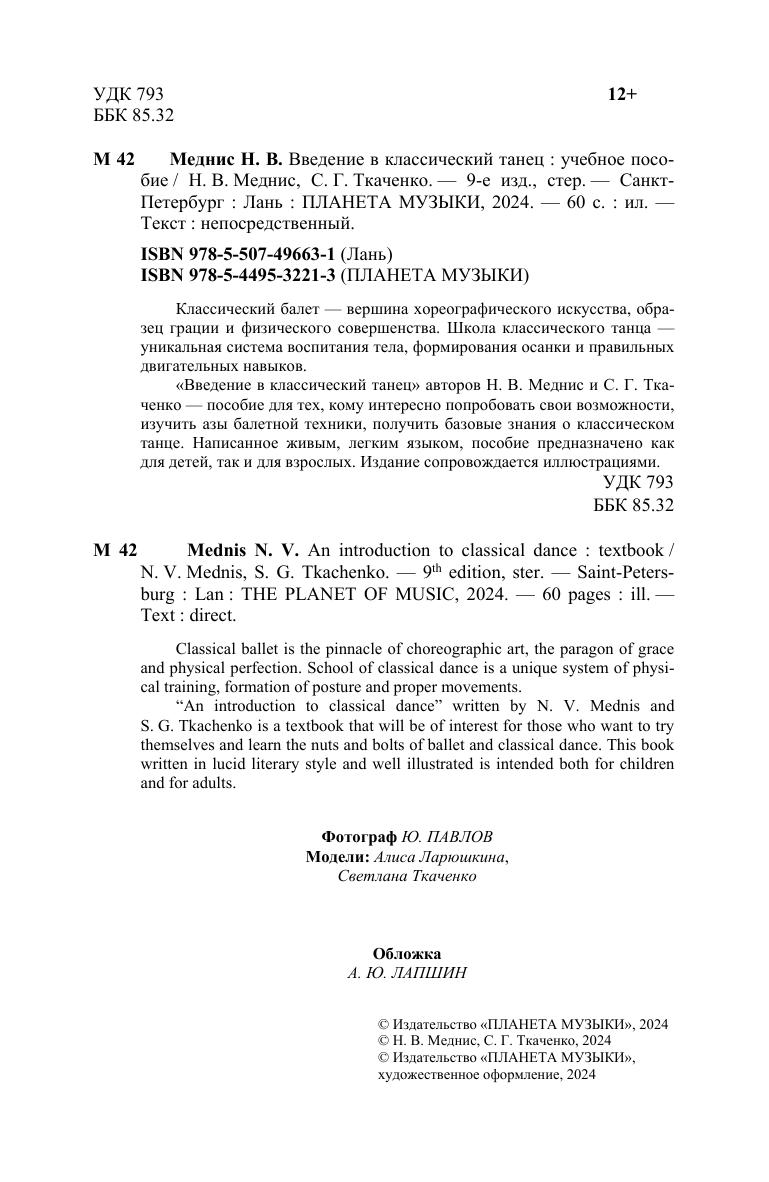 Классический балет— вершина хореографического искусства, образец грации и физического совершенства. Школа классического танца— уникальная система воспитания тела, формирования осанки и правильных двигательных навыков. «Введение в классический танец» авторов Н.В.Меднис и С.Г.Ткаченко— пособие для тех, кому интересно попробовать свои возможности, изучить азы балетной техники, получить базовые знания о классическом танце. Написанное живым, легким языком, пособие предназначено как для детей, так и для взрослых. Издание сопровождается иллюстрациями.