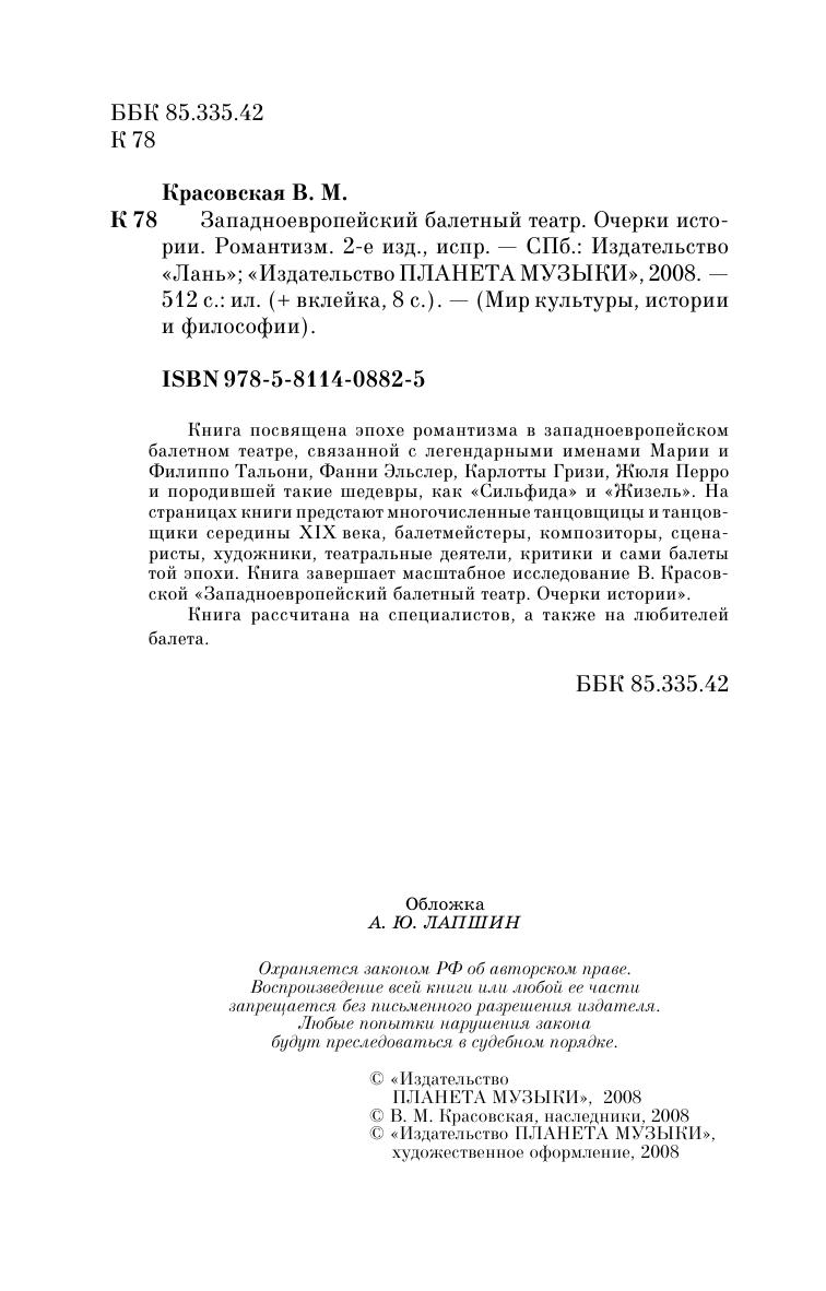 Книга посвящена эпохе романтизма в западноевропейском балетном театре, связанной с легендарными именами Марии и Филиппо Тальони, Фанни Эльслер, Карлотты Гризи, Жюля Перро и породившей такие шедевры, как «Сильфида» и «Жизель». На страницах книги предстают многочисленные танцовщицы и танцовщики середины XIX века, балетмейстеры, композиторы, сценаристы, художники, театральные деятели, критики и сами балеты той эпохи. Книга завершает масштабное исследование В. Красовской «Западноевропейский балетный театр. Очерки истории». Книга рассчитана на специалистов, а также на любителей балета.