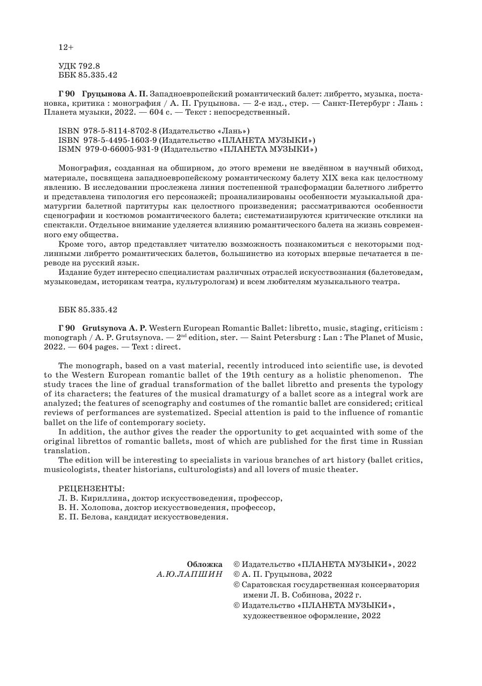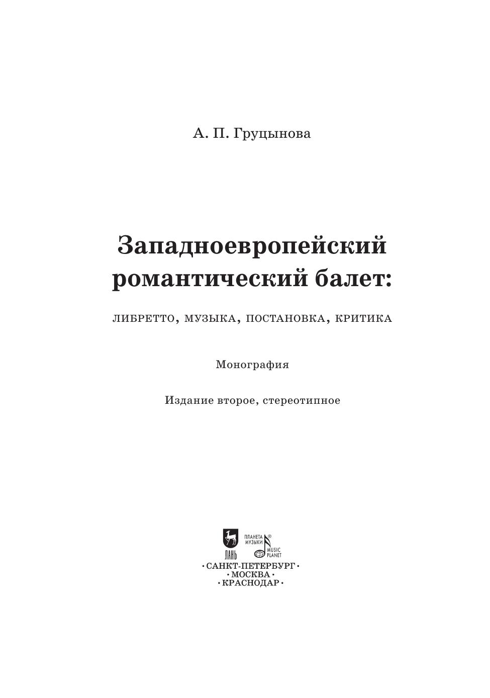 В исследовании впервые прослежена линия постепенной трансформации балетного либретто как литературного жанра (от возникновения балета в XVI веке — к веку девятнадцатому) и представлена типология его персонажей. Впервые проанализированы особенности музыкальной драматургии балетной партитуры как симфонического произведения. Автор обращается к особенностям сценографии и костюмов романтического балета в их исторической перспективе и в связи с особенностями либретто спектакля. В монографии читателю впервые предоставлена возможность познакомиться с многочисленными критическими окликами на спектакли, созданными как современниками постановок, так и нашими современниками. Уделяется внимание и влиянию романтического балета на жизнь общества, происходившему на многих уровнях, от домашнего музицирования до изменения традиции поведения публики в театре.