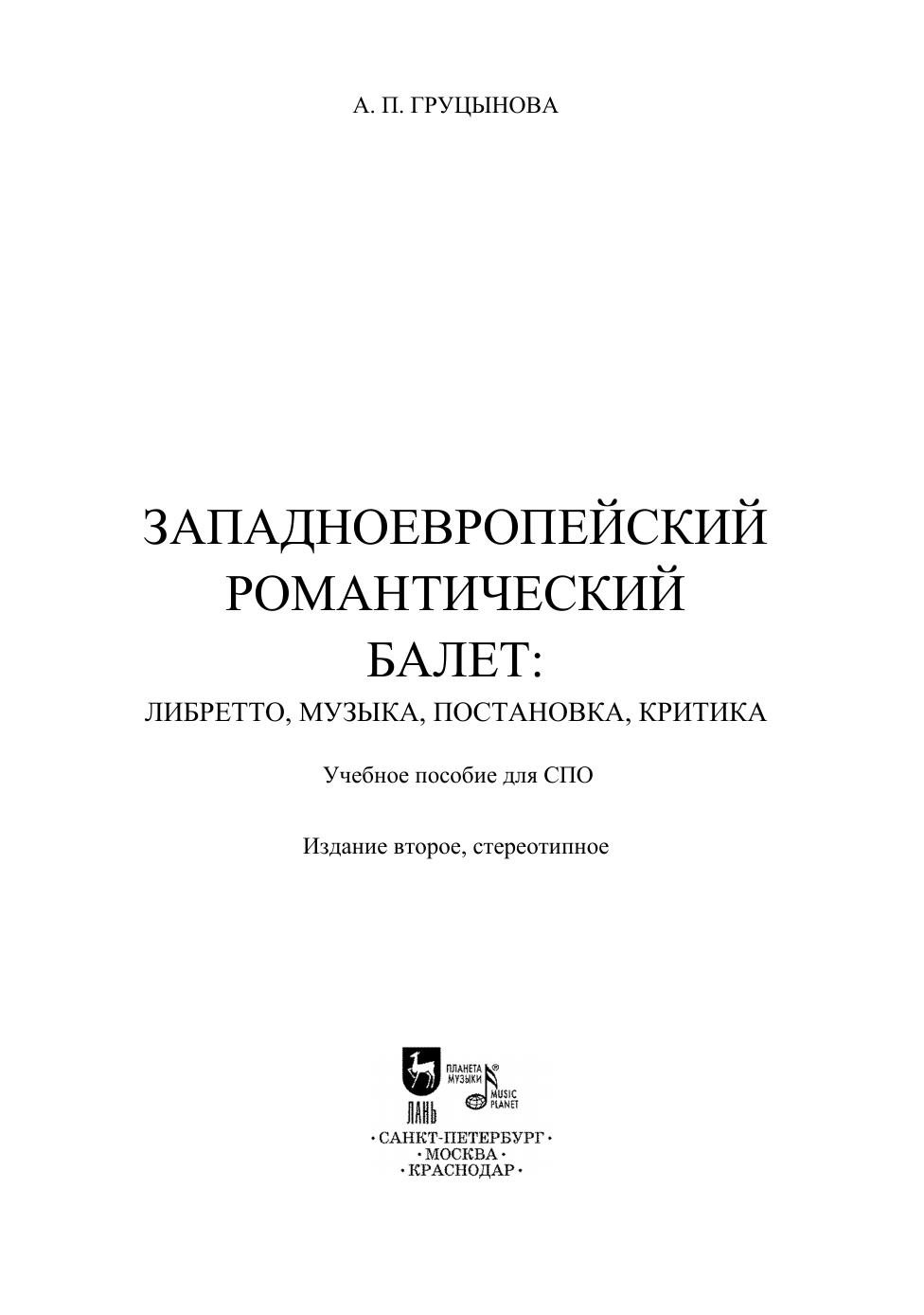 Учебное пособие, созданное на обширном, до этого времени не введённом в научный обиход, материале, посвящено западноевропейскому романтическому балету XIX века как целостному явлению. Четыре его части посвящены и литературной основе спектакля, и её музыкальной стороне, и особенности постановки, и проблеме осмысления произведения. Соответствует современным требованиям Федерального государственного образовательного стандарта среднего профессионального образования и профессиональным квалификационным требованиям. Предназначено для студентов и преподавателей средних специальных учебных заведений. The textbook, based on a vast material, recently introduced into scientific use, is devoted to the Western European romantic ballet of the 19th century as a holistic phenomenon. Its four parts are devoted to the literary basis of the performance, its music, the special features of staging, and the problem of comprehending the work. Corresponds to the modern requirements of the Federal State Educational Standard of Secondary Vocational Education and professional qualification requirements. The edition is intended for students of colleges.