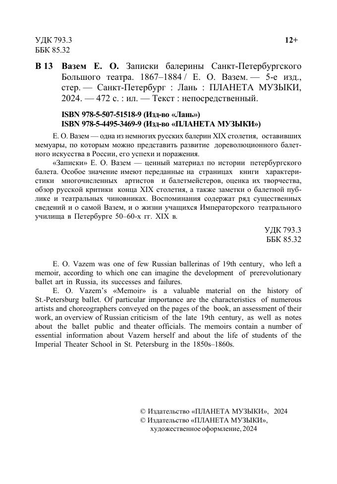 Е. О. Вазем, одна из немногих русских балерин XIX столетия, оставивших мемуары, по которым можно представить развитие дореволюционного балетного искусства в России, его успехи и поражения. «Записки» Е. О. Вазем — ценный материал по истории петербургского балета. Особое значение имеют переданные на страницах книги характеристики многочисленных артистов и балетмейстеров, оценка их творчества, обзор русской критики конца XIX столетия, а также заметки о балетной публике и театральных чиновниках. Воспоминания содержат ряд существенных сведений и о самой Вазем, и о жизни учащихся императорского театрального училища в Петербурге 50–60-х гг. XIX в.