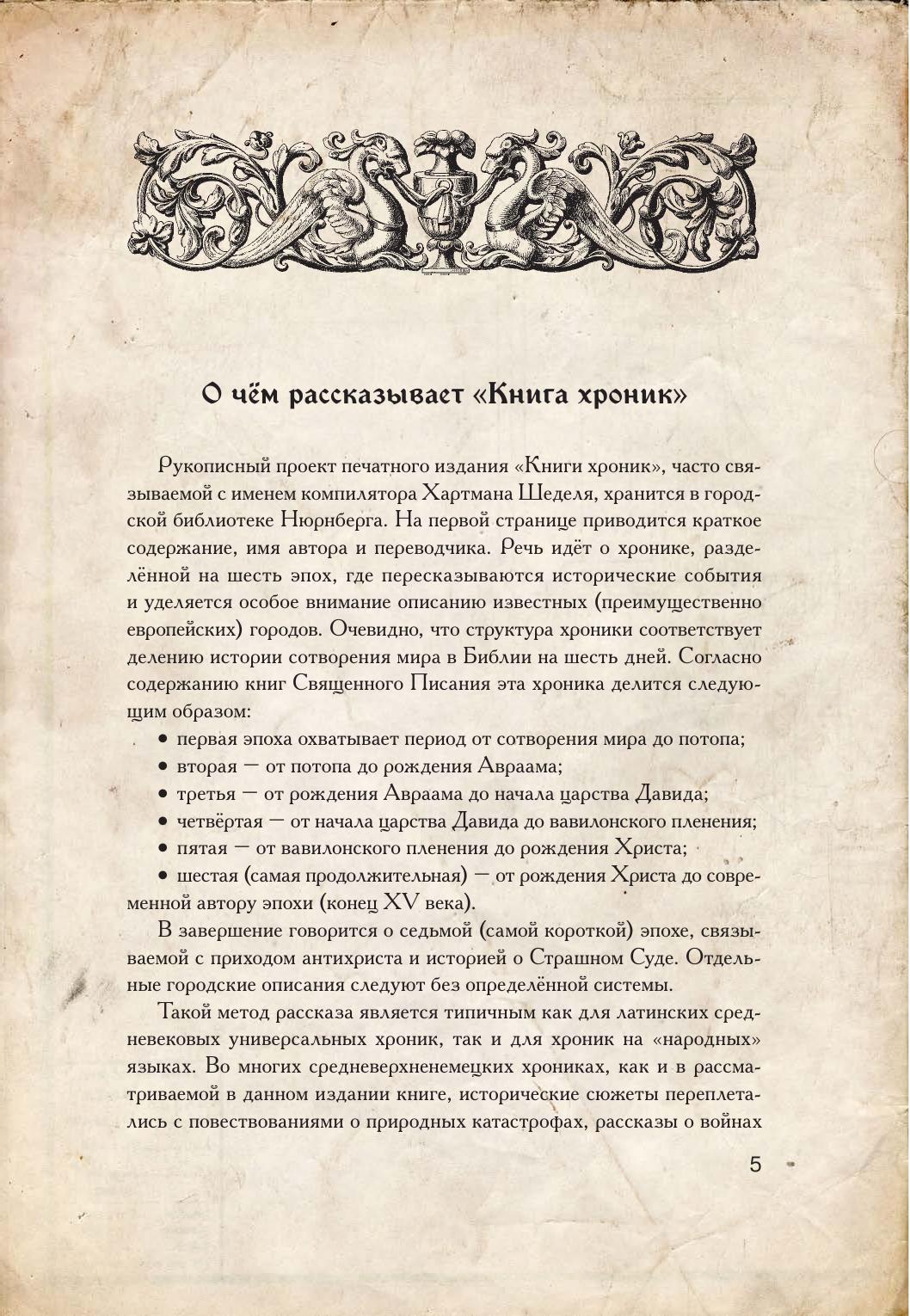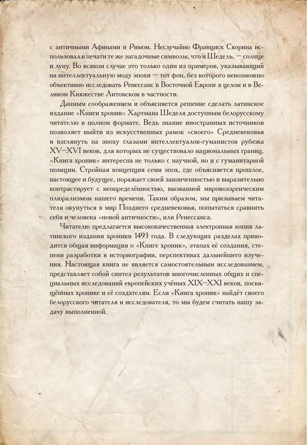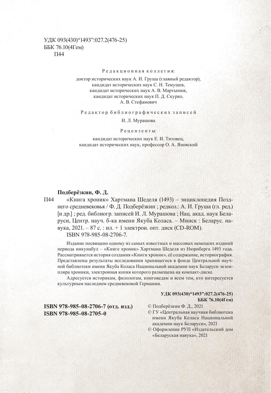 Издание посвящено одному из самых известных и массовых немецких изданий периода инкунабул – «Книге хроник» Хартмана Шеделя из Нюрнберга 1493 года. Рассматривается история создания «Книги хроник», её содержание, историография. Представлены результаты исследования хранящегося в фонде Центральной научной библиотеки имени Якуба Коласа Национальной академии наук Беларуси экземпляра хроники, электронная копия которого размещена на компакт-диске.