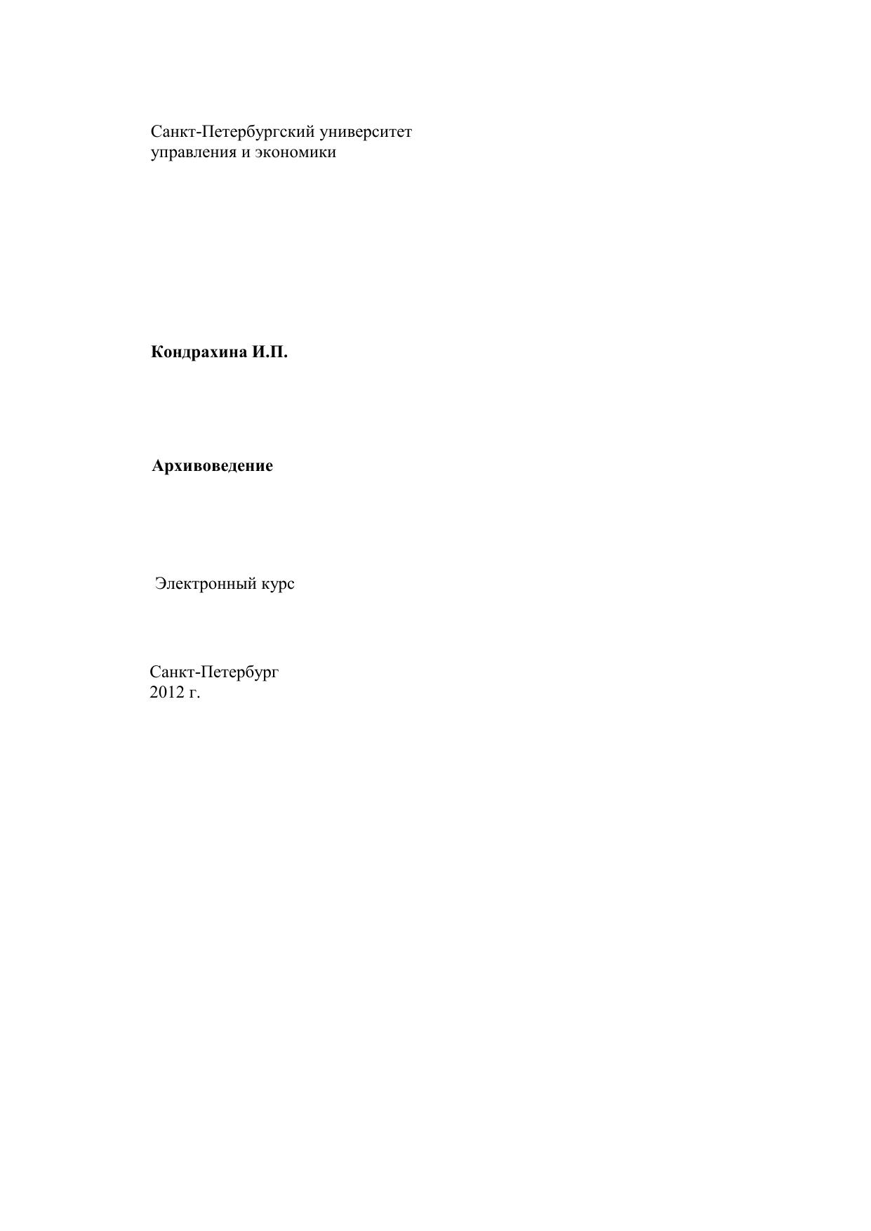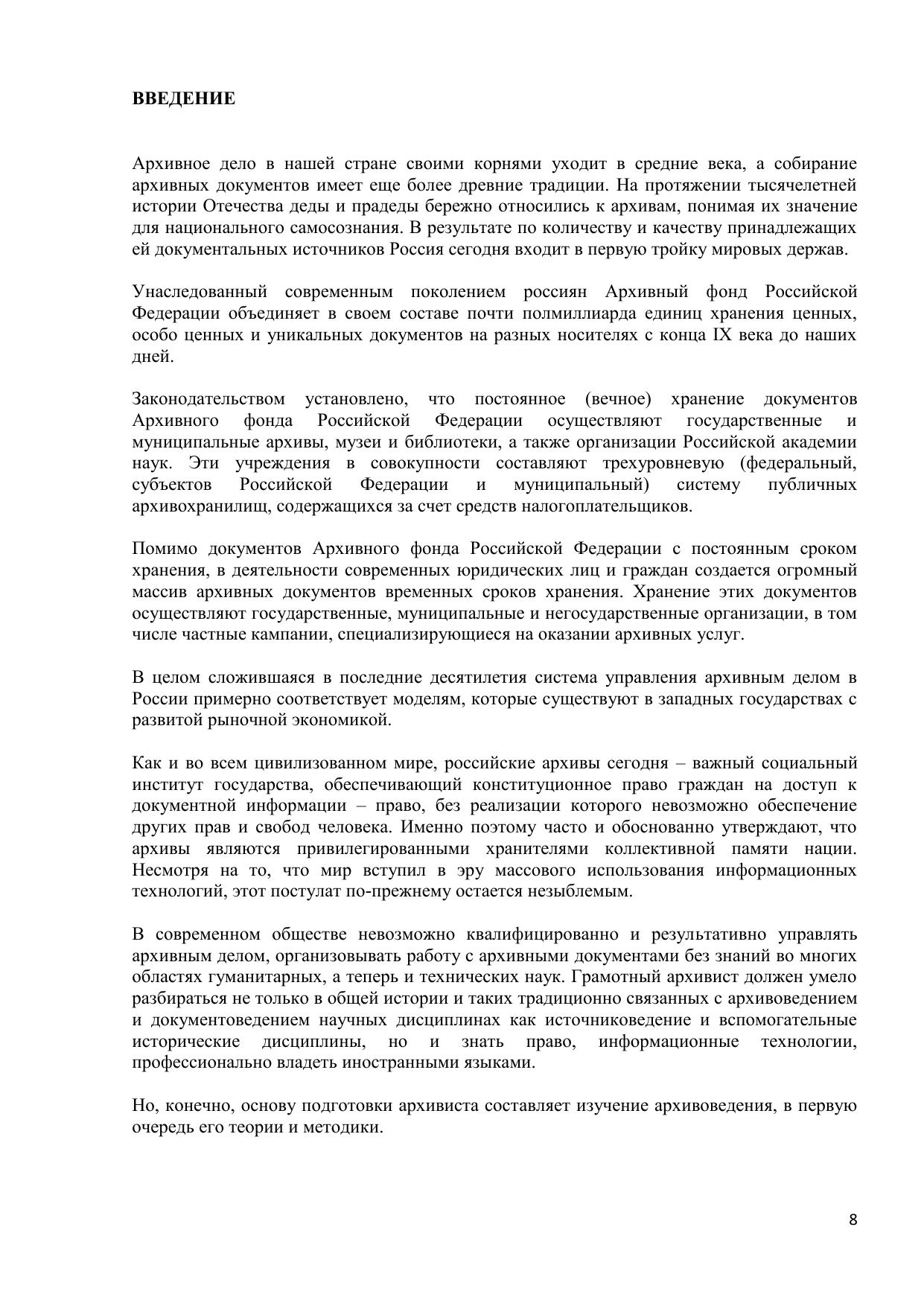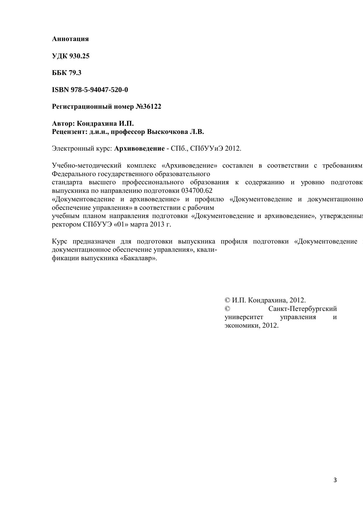 Учебно-методический комплекс «Архивоведение» составлен в соответствии с требованиями Федерального государственного образовательного стандарта высшего профессионального образования к содержанию и уровню подготовки выпускника по направлению подготовки 034700.62 «Документоведение и архивоведение» и профилю «Документоведение и документационное обеспечение управления» в соответствии с рабочим учебным планом направления подготовки «Документоведение и архивоведение», утвержденным ректором СПбУУЭ «01» марта 2013 г. Курс предназначен для подготовки выпускника профиля подготовки «Документоведение и документационное обеспечение управления», квалификации выпускника «Бакалавр».
