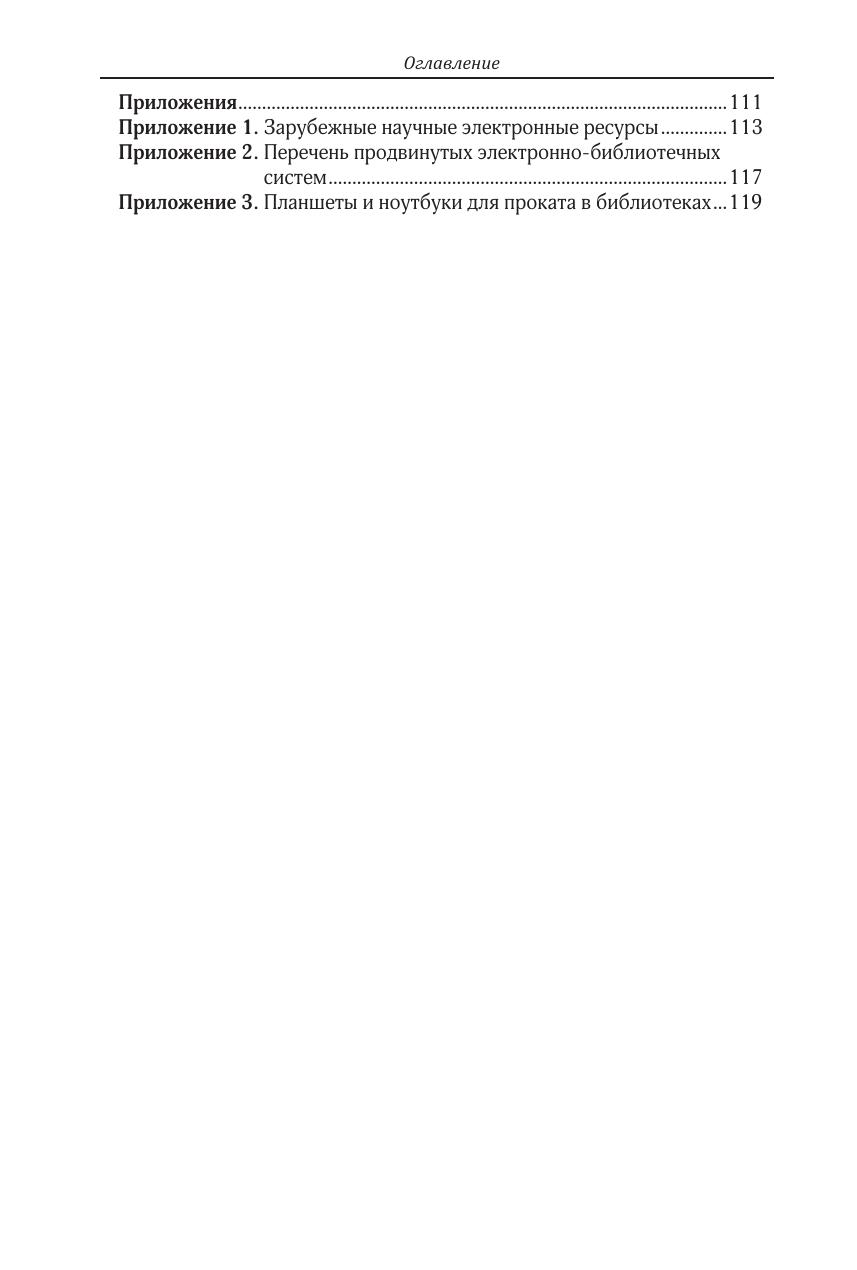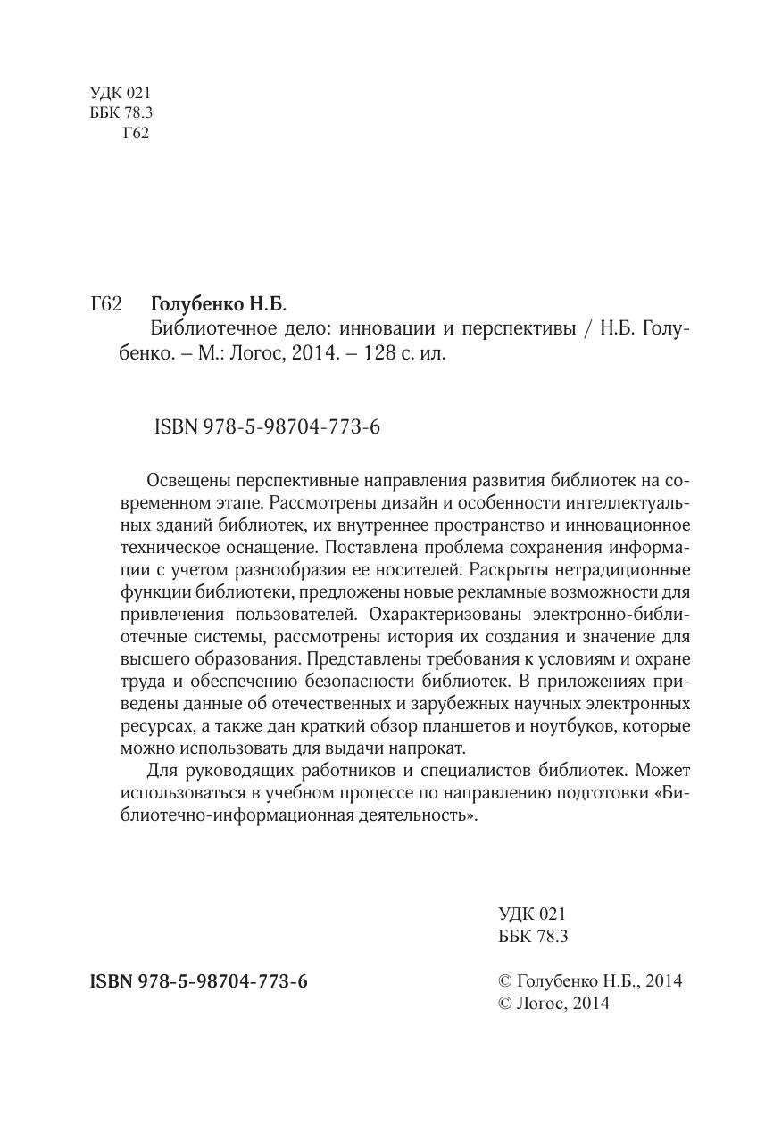 Освещены перспективные направления развития библиотек на современном этапе. Рассмотрены дизайн и особенности интеллектуальных зданий библиотек, их внутреннее пространство и инновационное техническое оснащение. Поставлена проблема сохранения информации с учетом разнообразия ее носителей. Раскрыты нетрадиционные функции библиотеки, предложены новые рекламные возможности для привлечения пользователей. Охарактеризованы электронно-библиотечные системы, рассмотрены история их создания и значение для высшего образования. Представлены требования к условиям и охране труда и обеспечению безопасности библиотек. В приложениях приведены данные об отечественных и зарубежных научных электронных ресурсах, а также дан краткий обзор планшетов и ноутбуков, которые можно использовать для выдачи напрокат. Для руководящих работников и специалистов библиотек. Может использоваться в учебном процессе по направлению подготовки «Библиотечно-информационная деятельность».